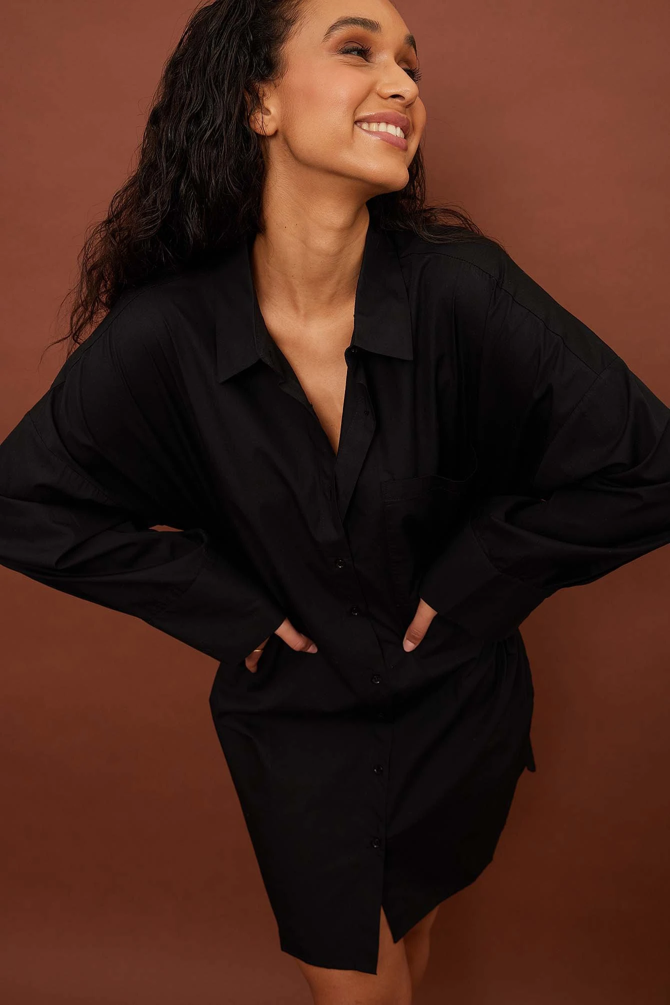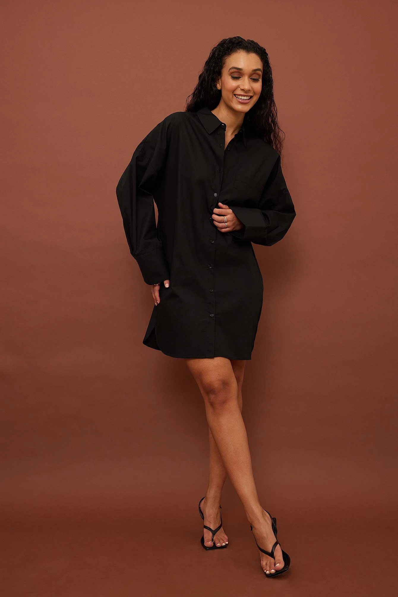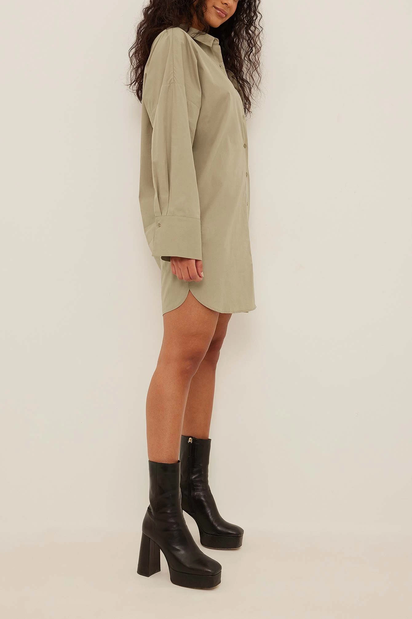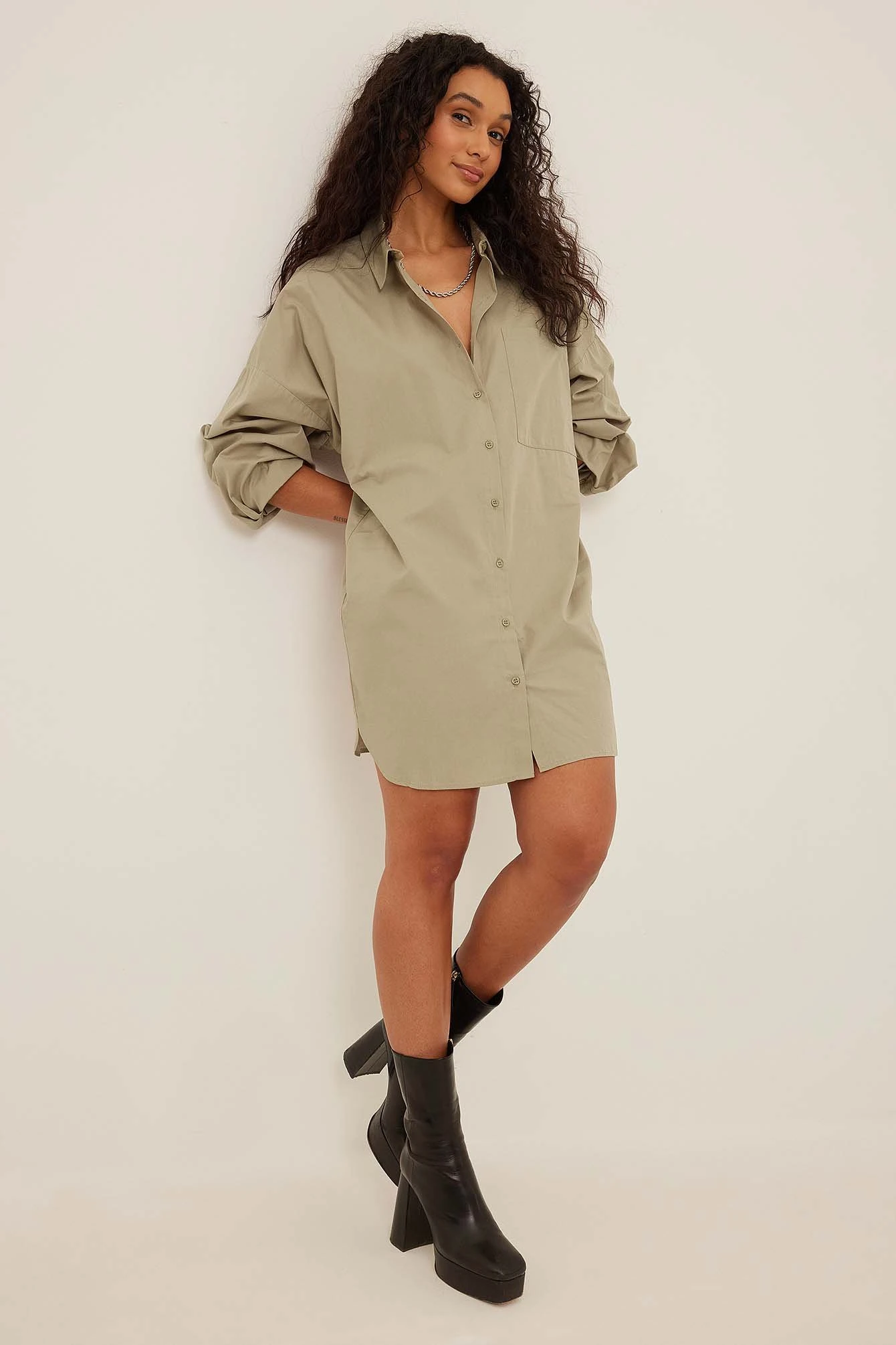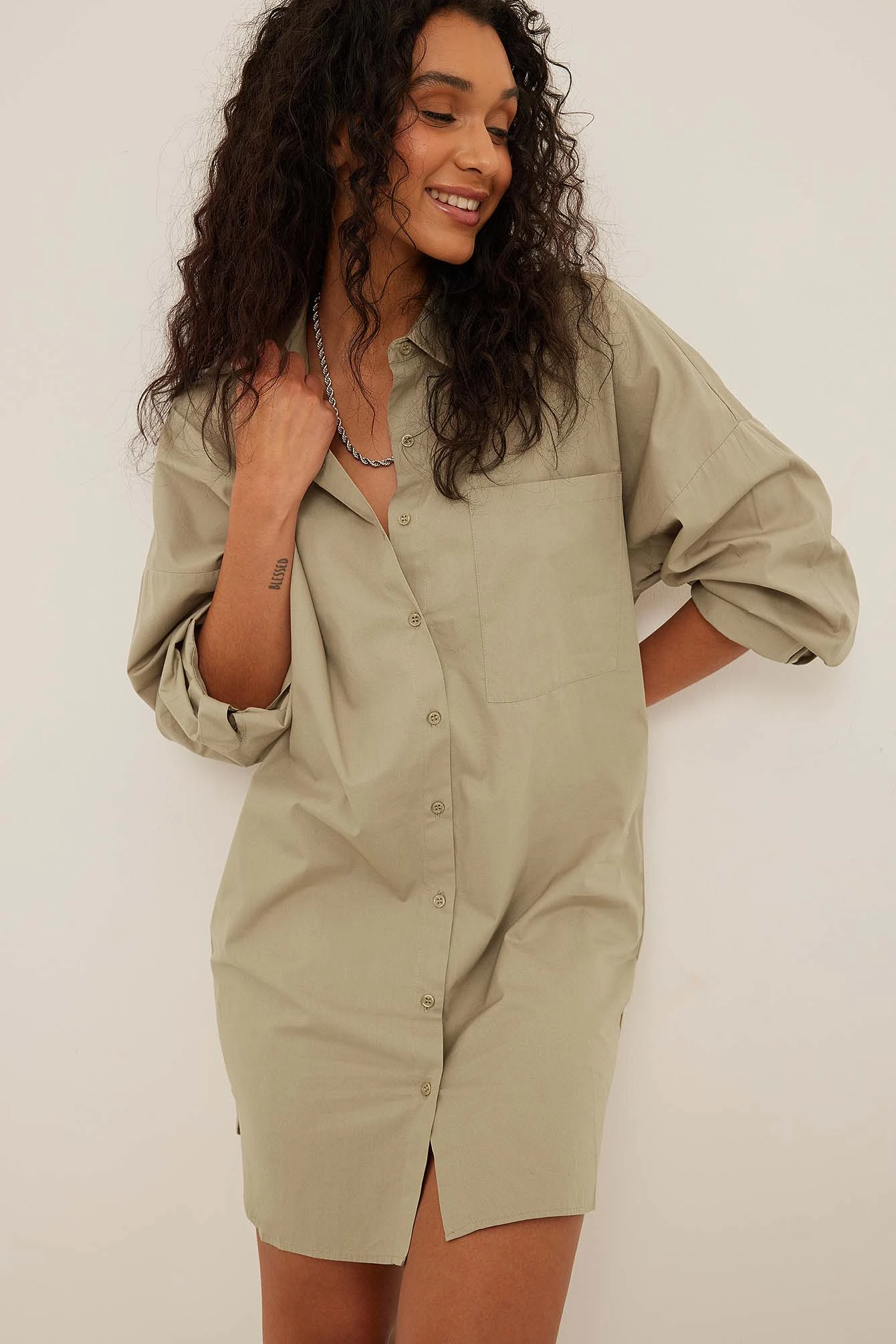 This shirt dress is oversized and features a classic collar. It has a button closure down the front and a pocket on the chest. This shirt dress features long sleeves with single button cuffs.