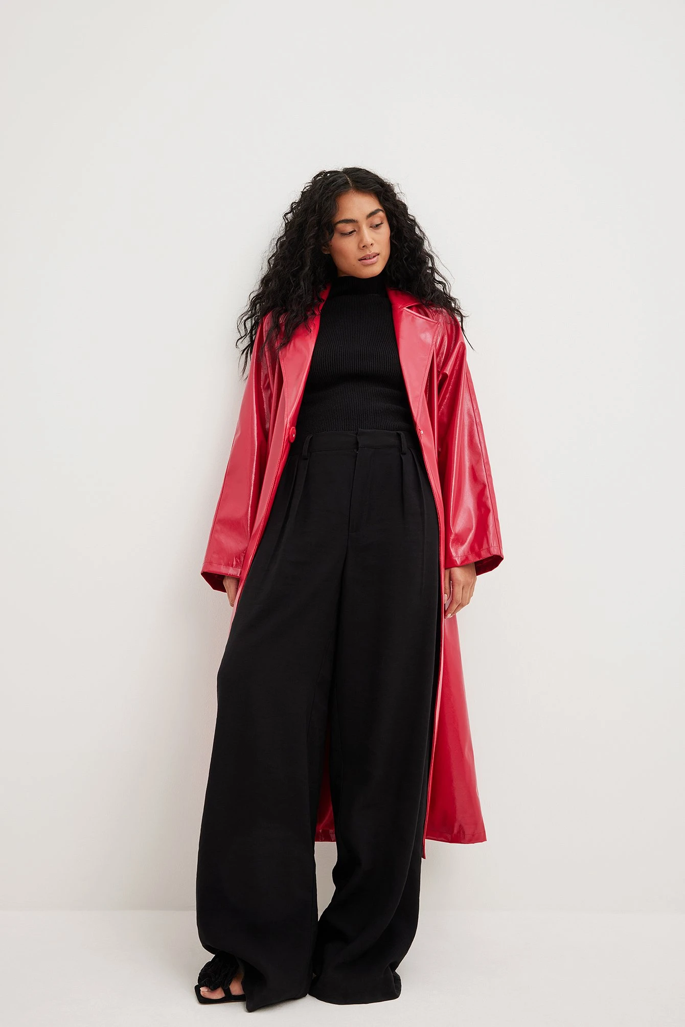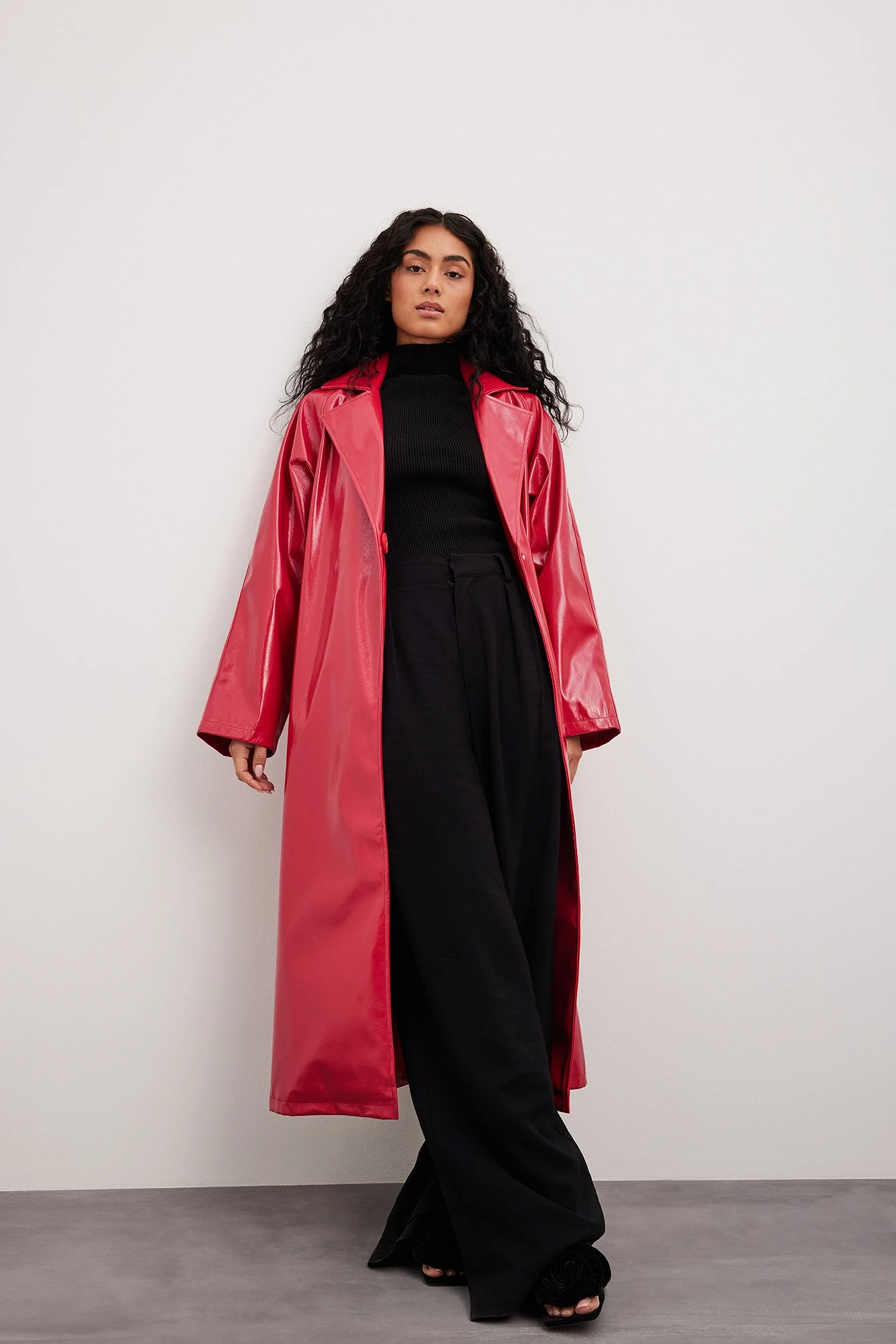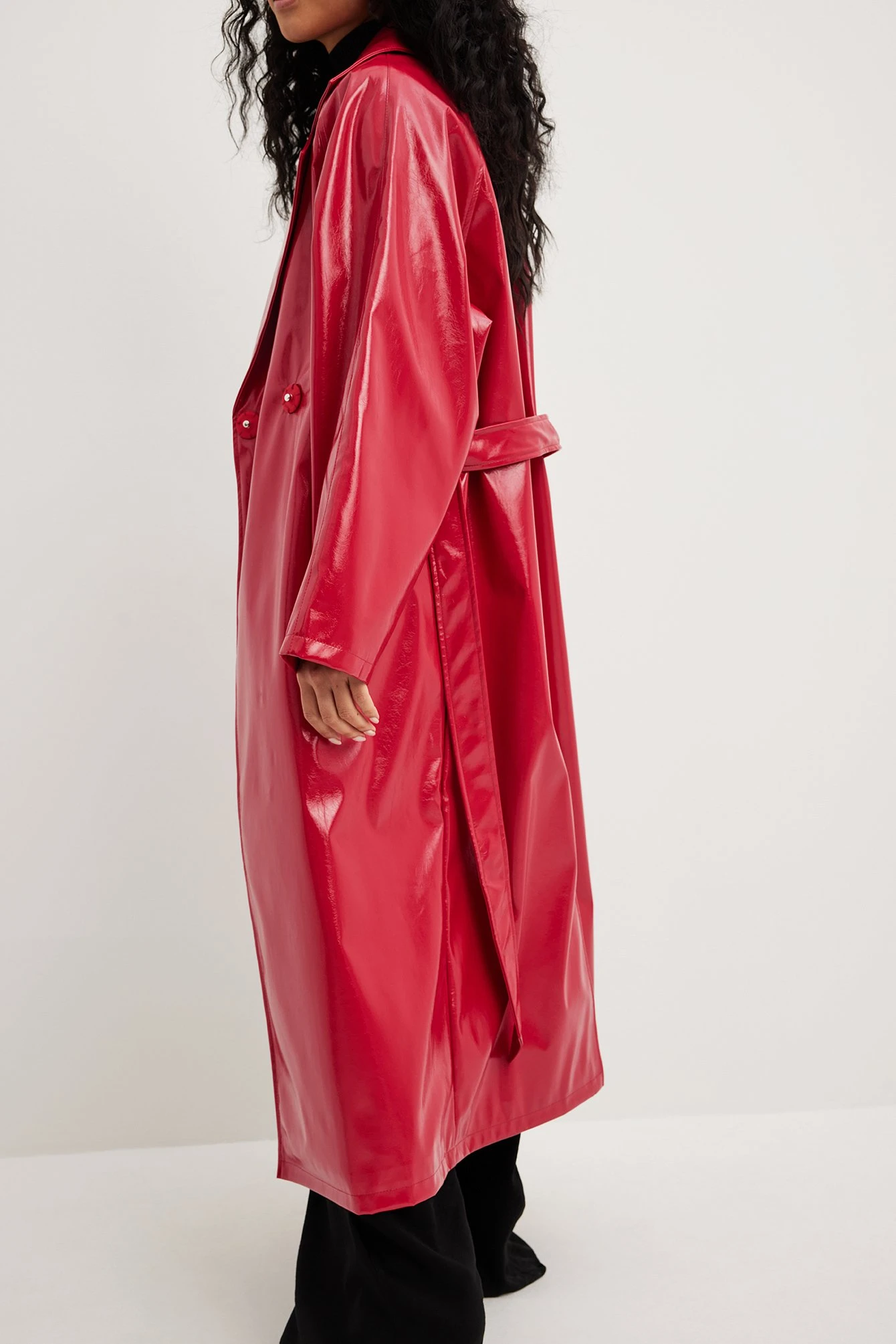 This trenchcoat is belted and made of PU and features an overlap design with a hidden snap button closure. It has side pockets.