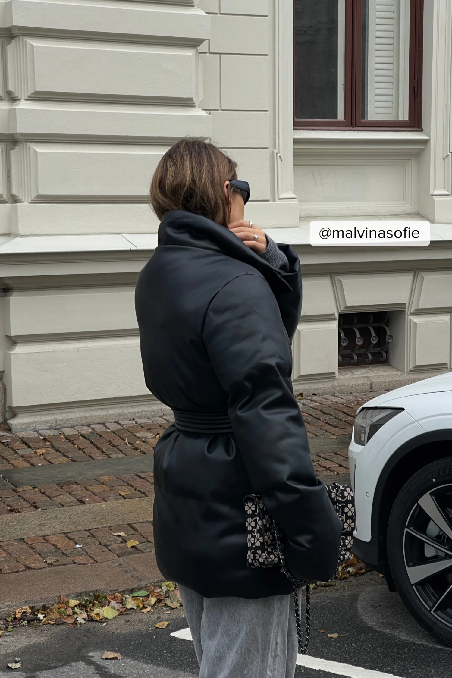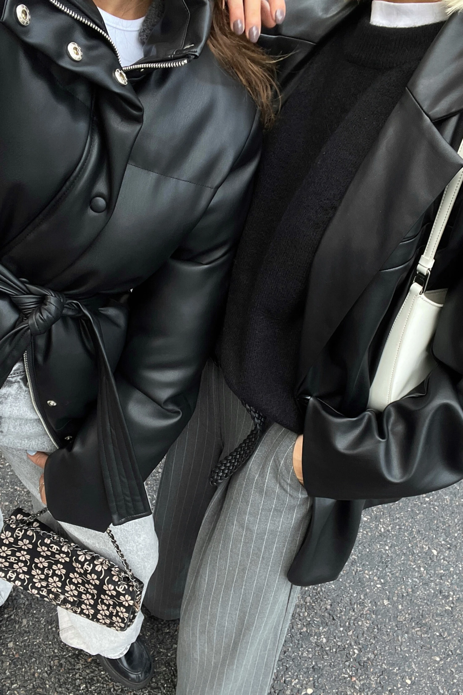 This jacket is padded and made of PU leather and features a self tie waist belt, a zipper and button closure along the front and side pockets with a snap button.