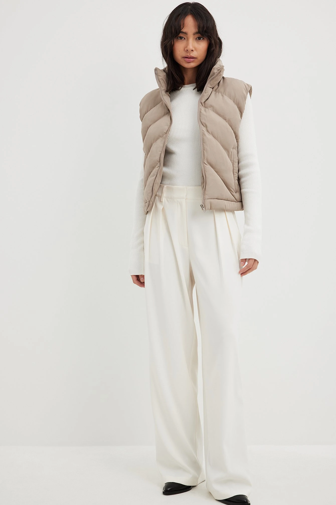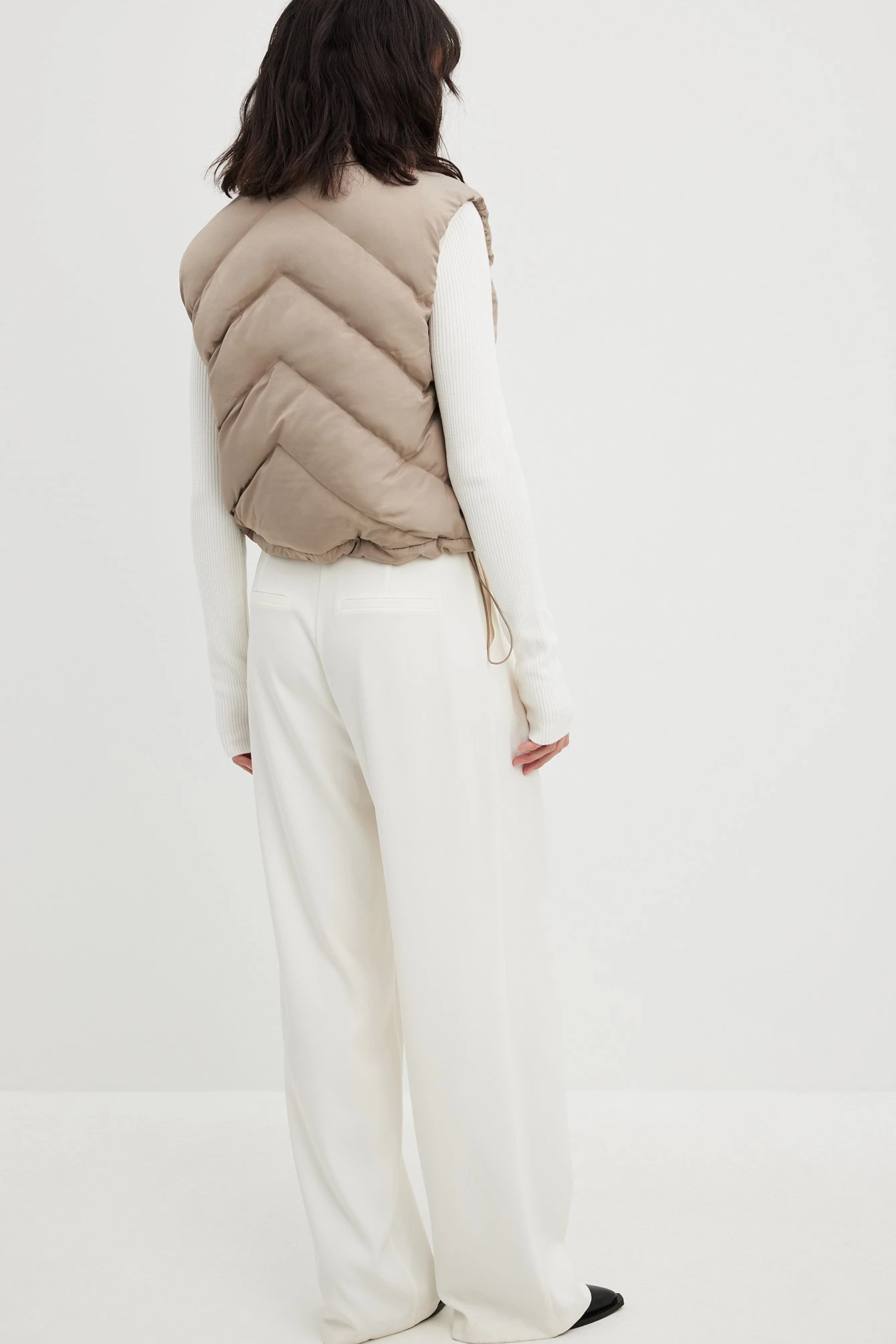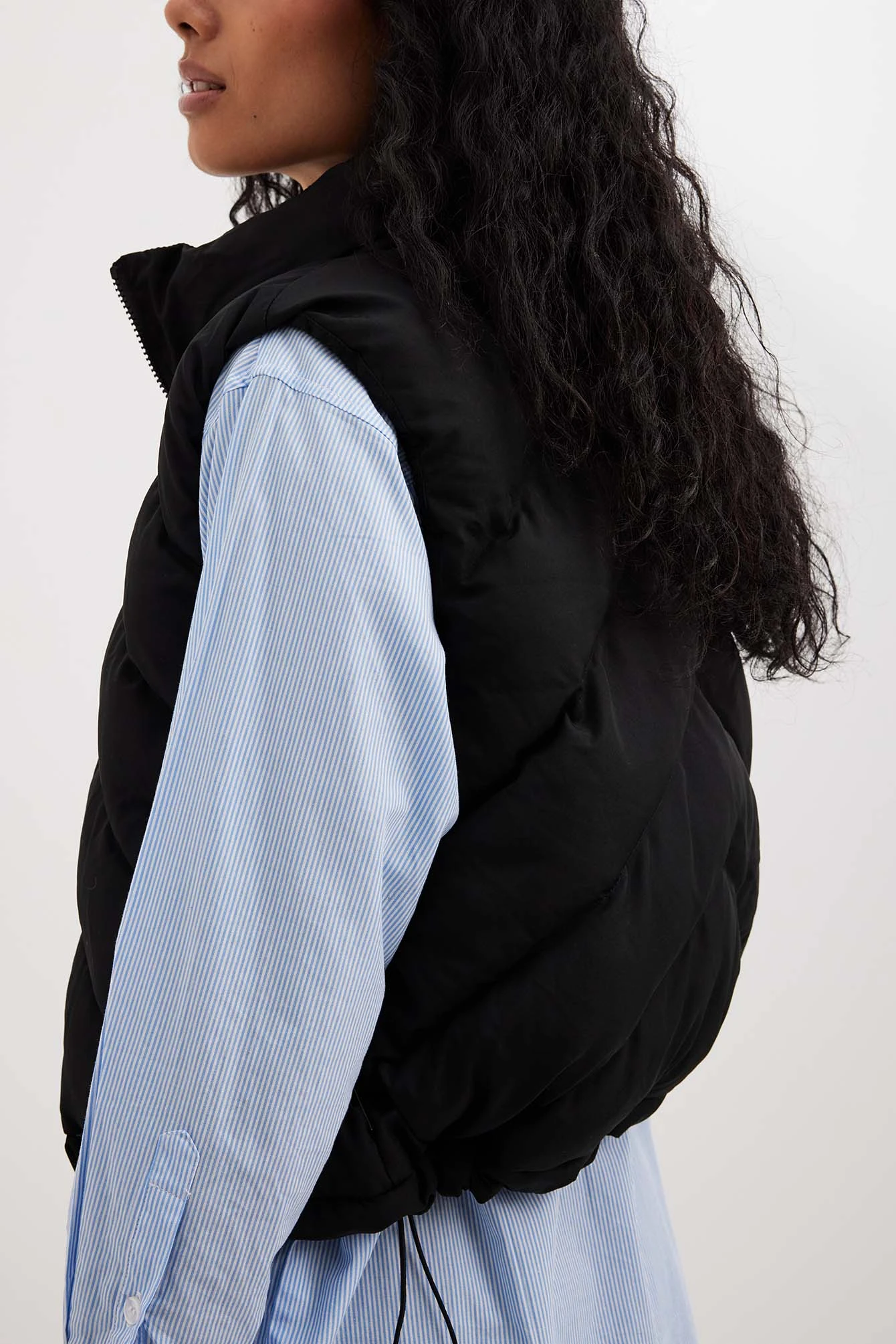 This puffer vest is fully lined and features a stand up collar, a zipper closure, two side pockets and a self-tie drawstring at the bottom hem.