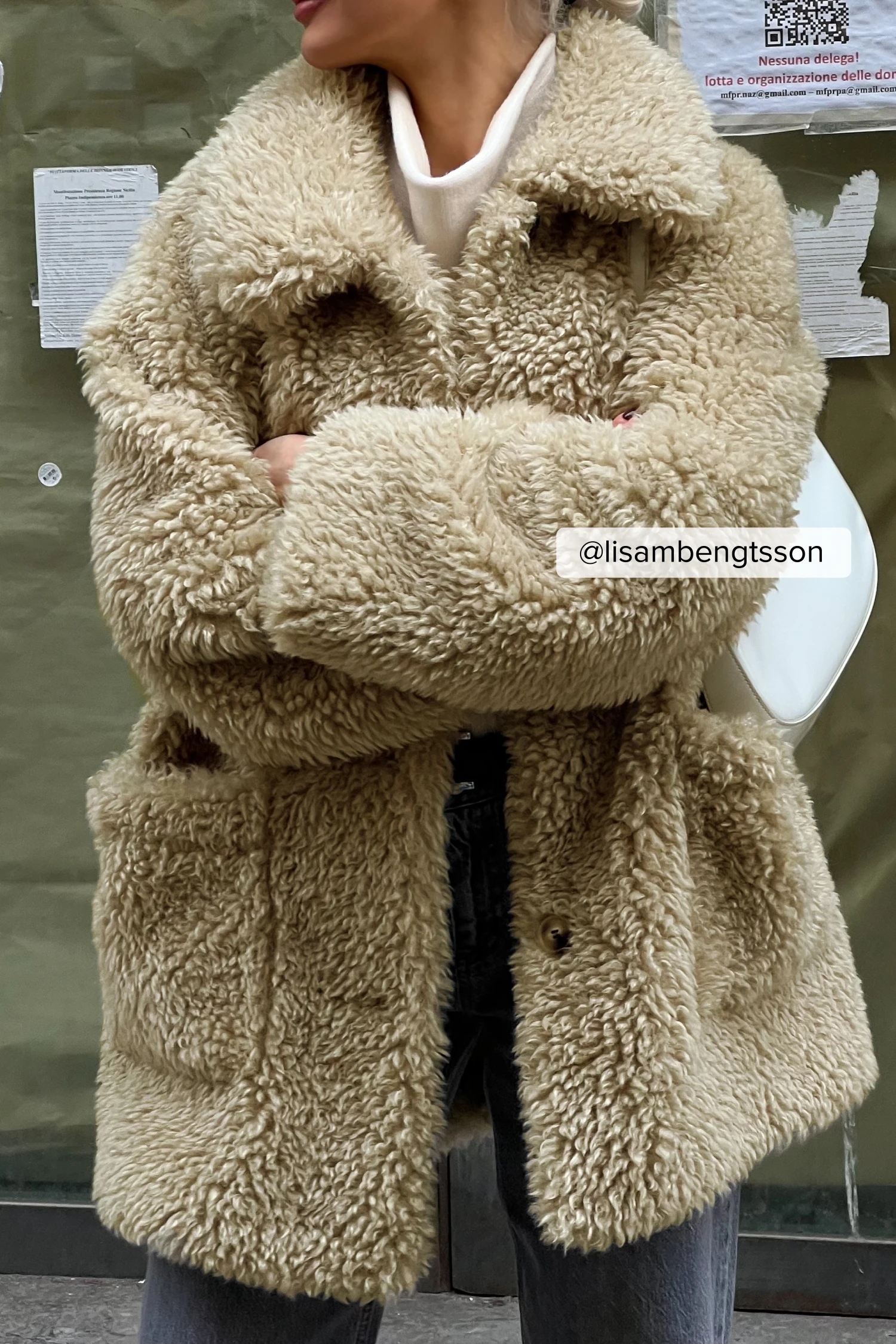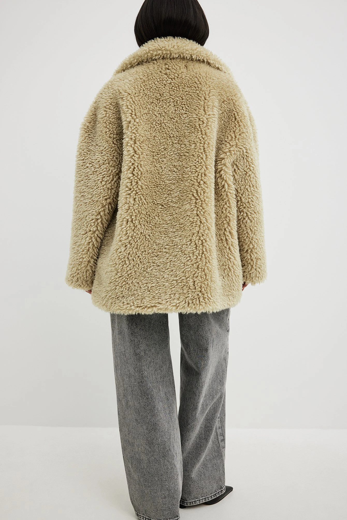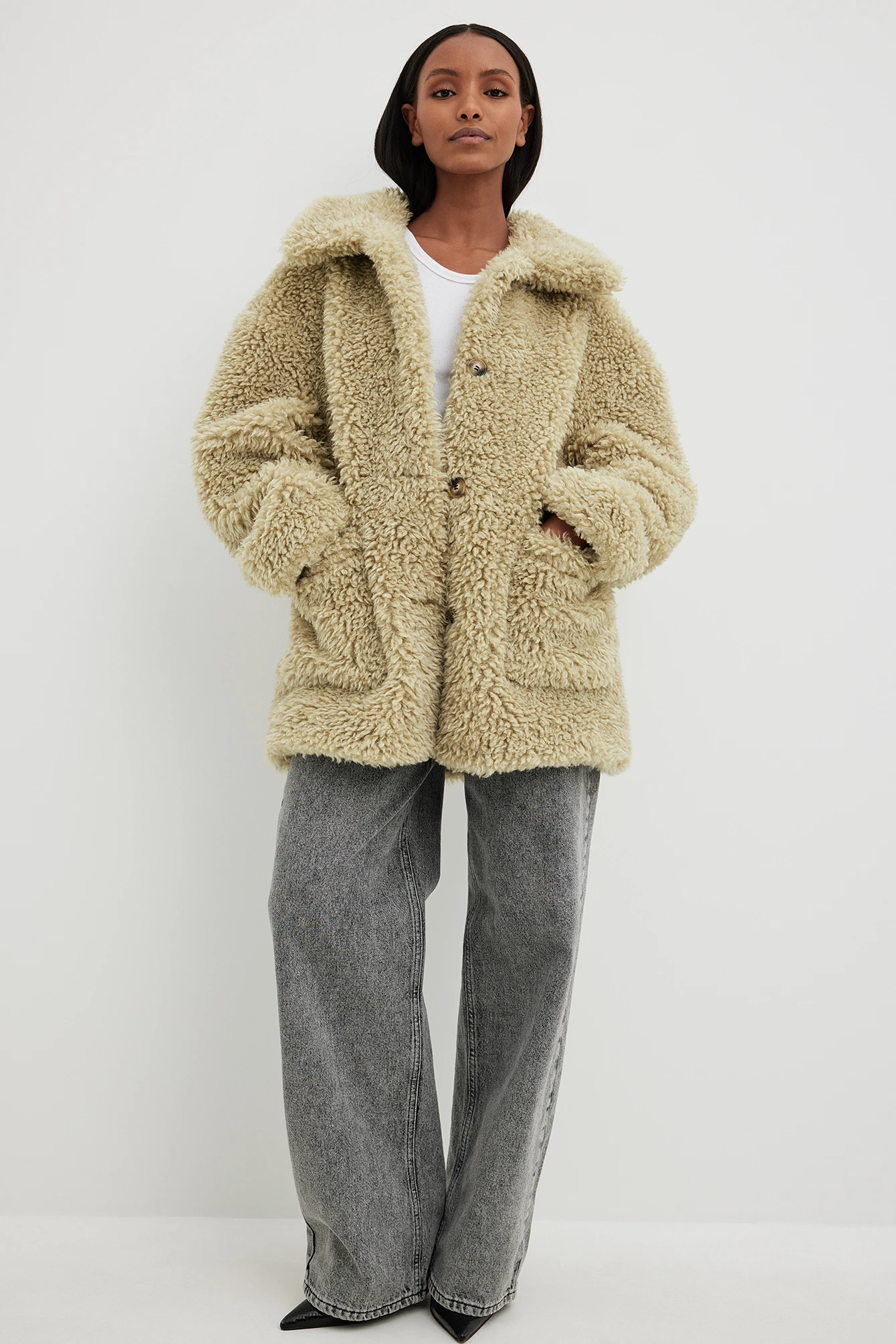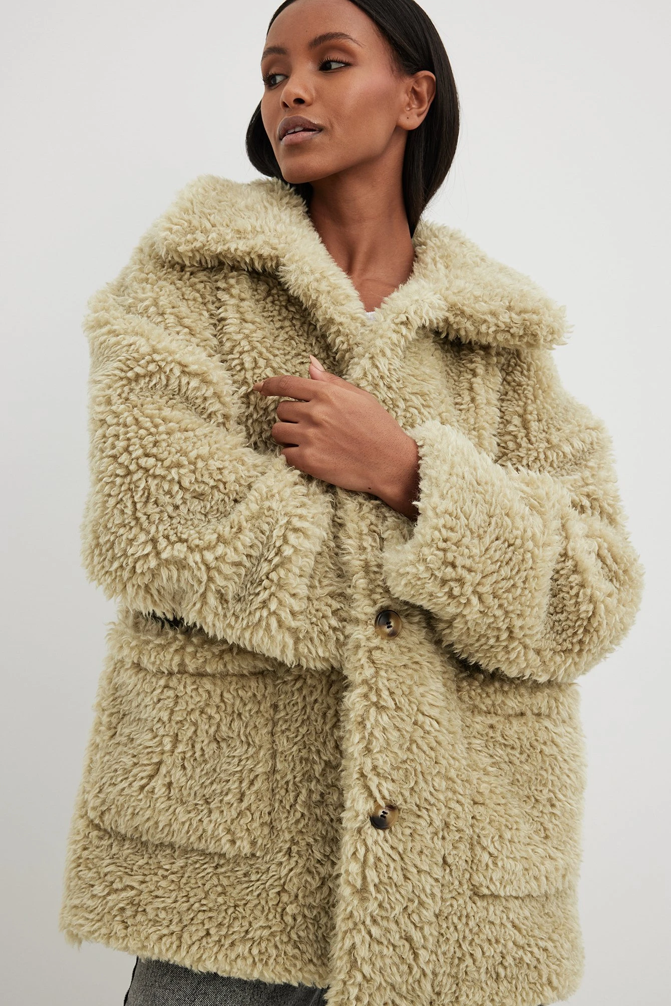 This jacket features a fluffy, teddy outer shell. It has a soft inner shell and a classic collar. This jacket features button closure and front pockets.
