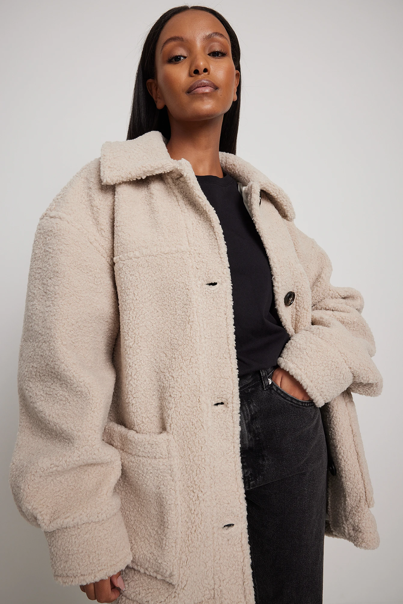 This jacket features a teddy look. It has a shirt collar and a button closure. This jacket features a patched front pocket.