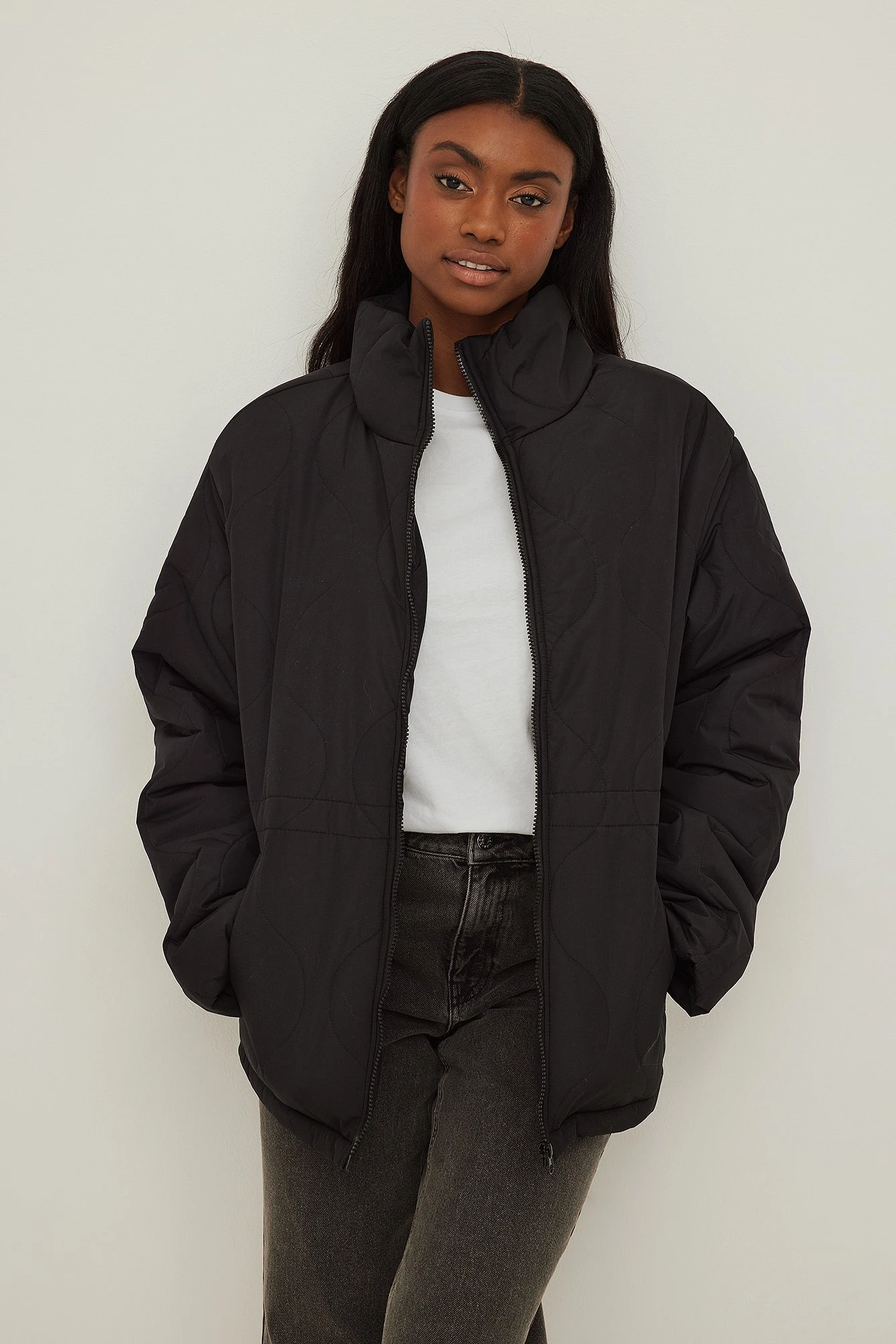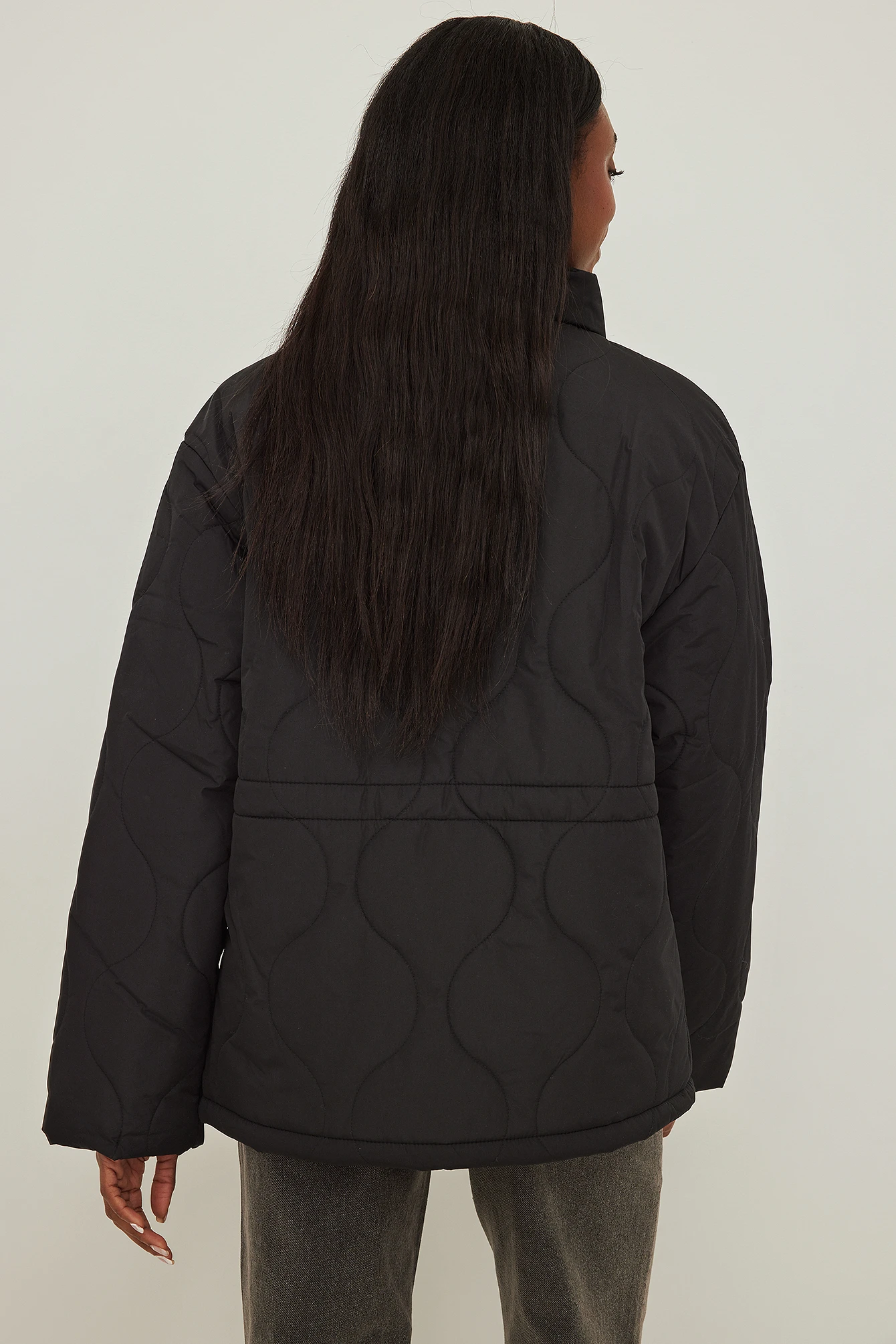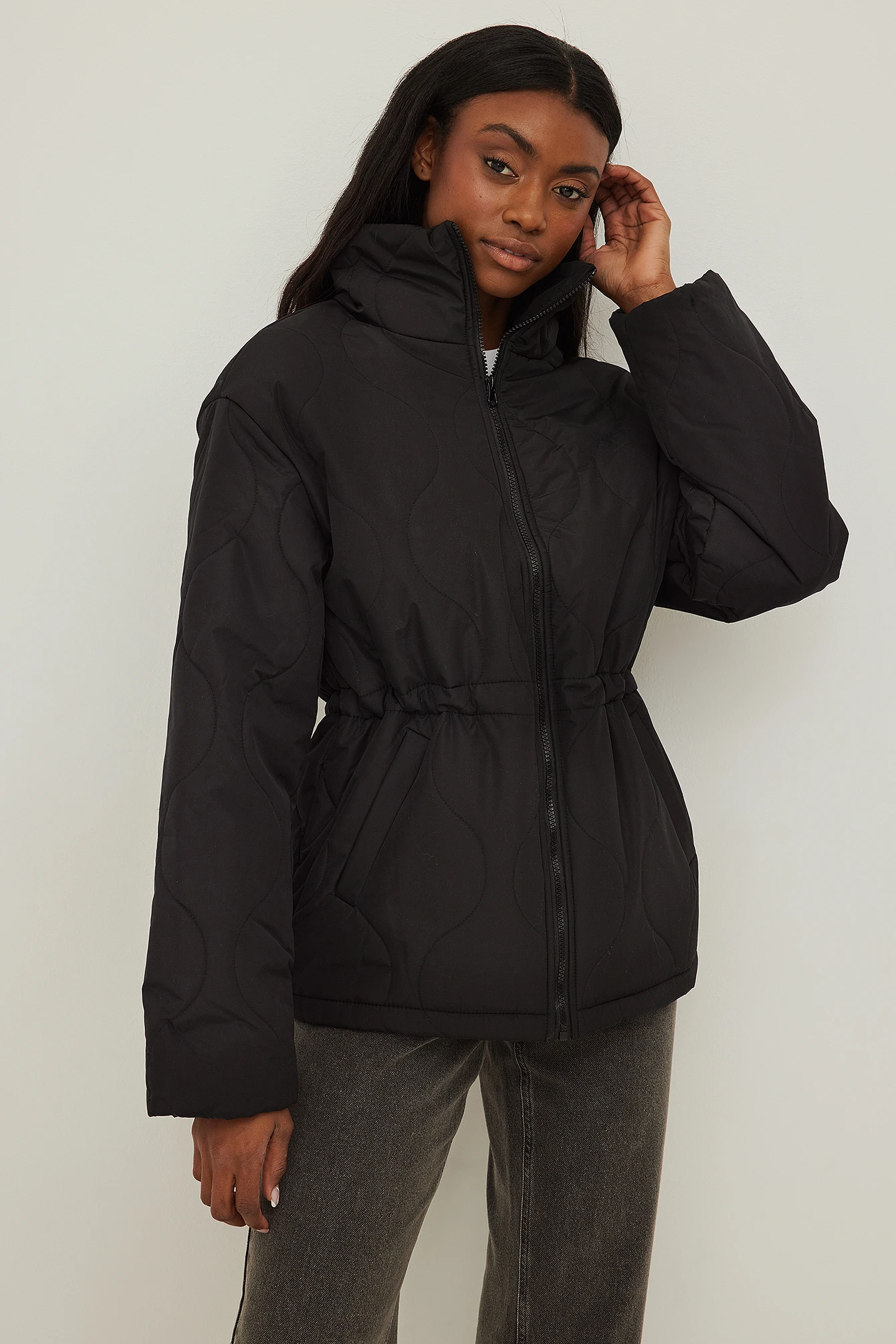 This jacket is quilted and padded and features a high neck, side pockets and a drawstring detail at the waist.