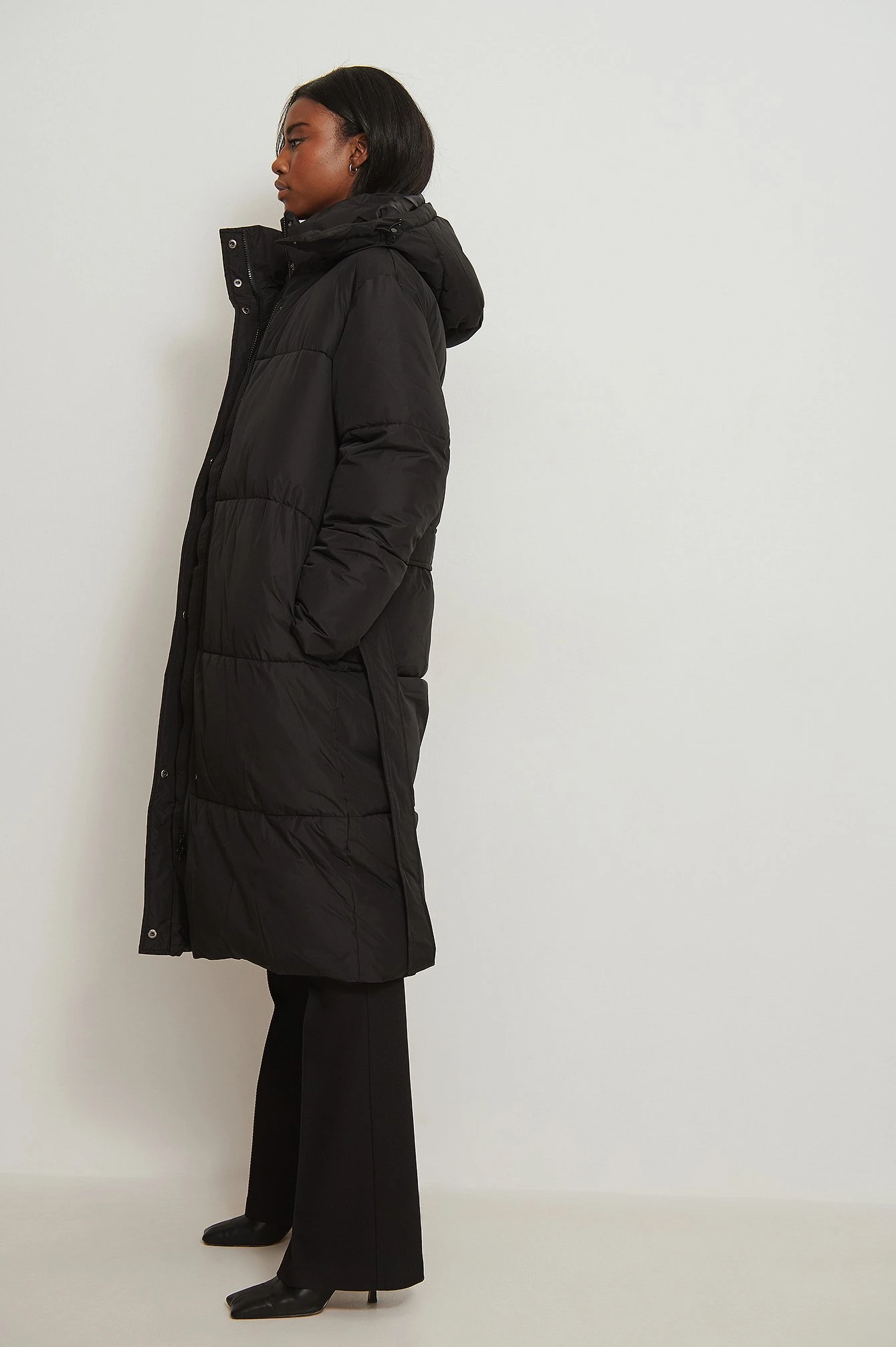 This jacket is padded and water repellent and features a high neck. It has a removable padded hood with adjustable drawstrings and two snap buttons and long sleeves with ribbed, elastic cuffs. This jacket features a zipper and button closure down the front, a removable self-tie belt at the waist, two side pockets and a long fit.