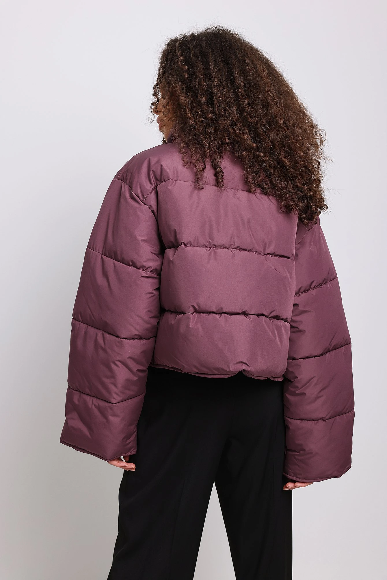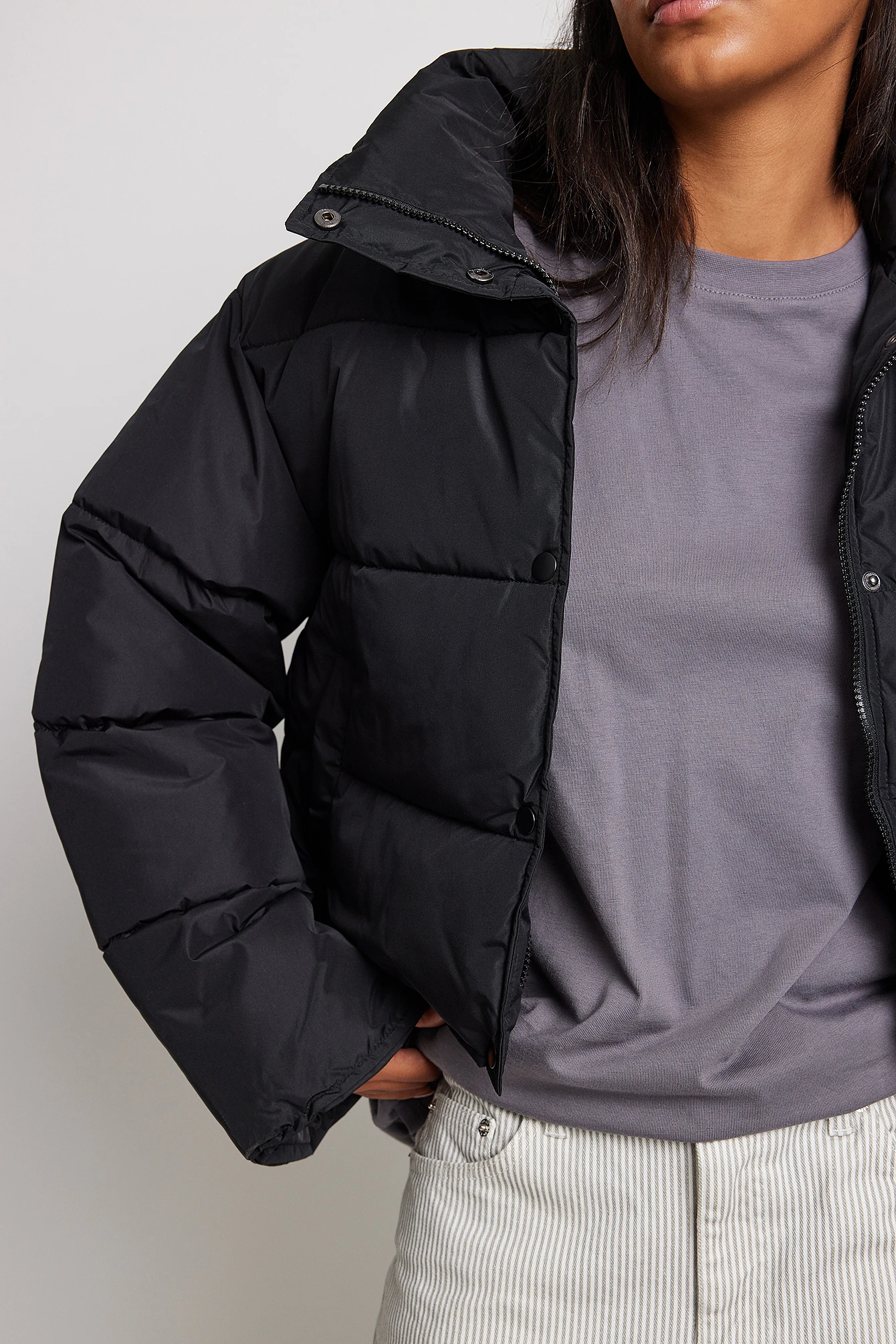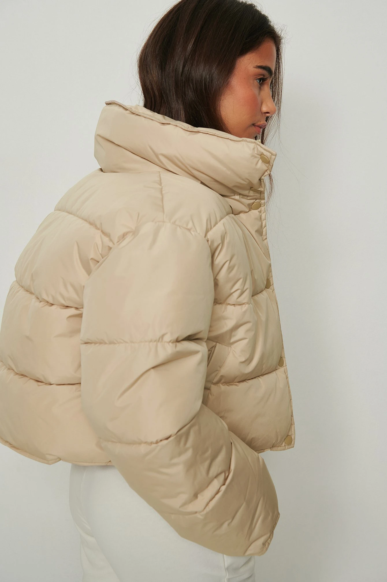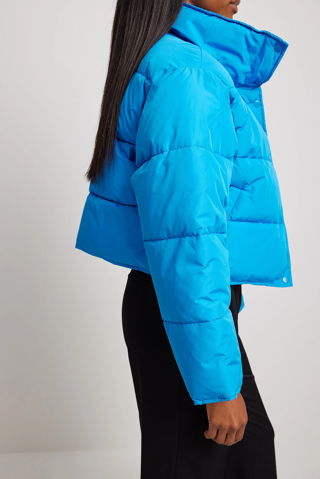 This jacket is water repellent and features cropped length, a high neck, long sleeves, a zipper and button closure and side pockets.