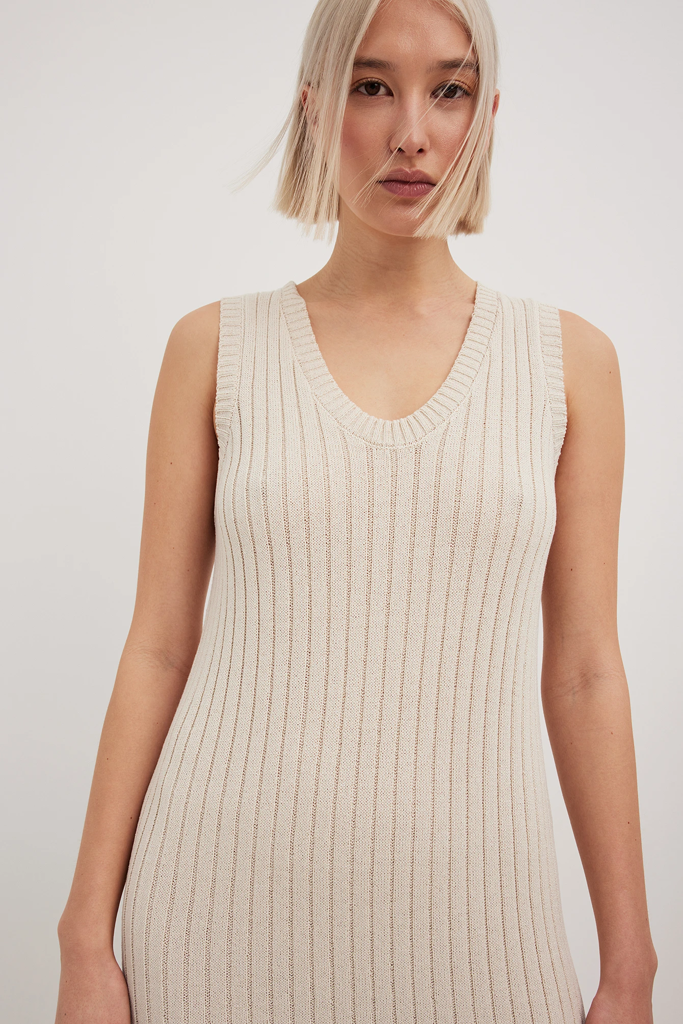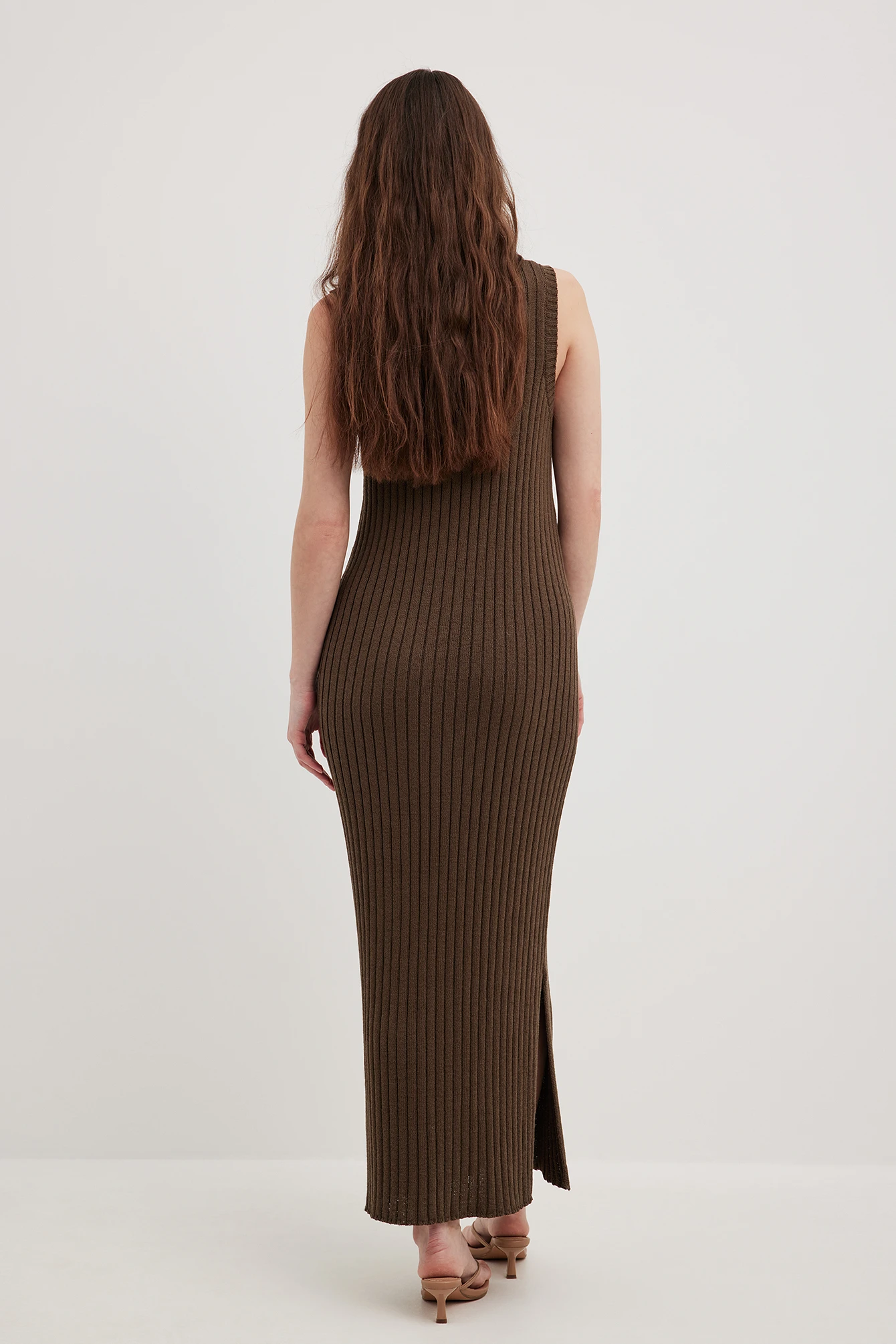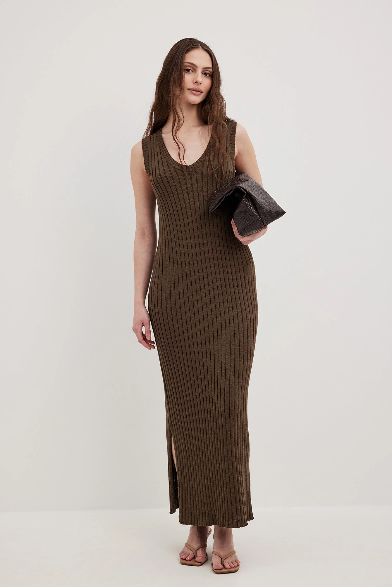 This dress is knitted and stretchy and features a midi length. It has a ribbed sleeveless design and a wide v neckline. Our dress features a low side slit on one side.