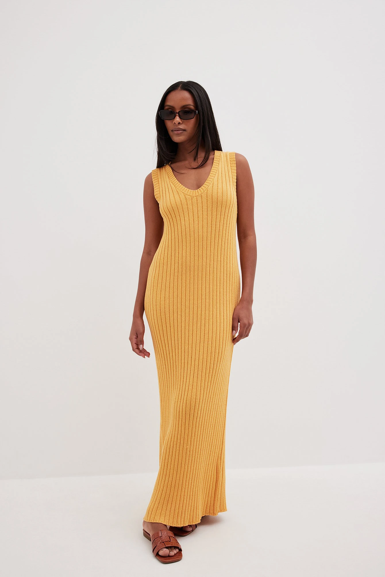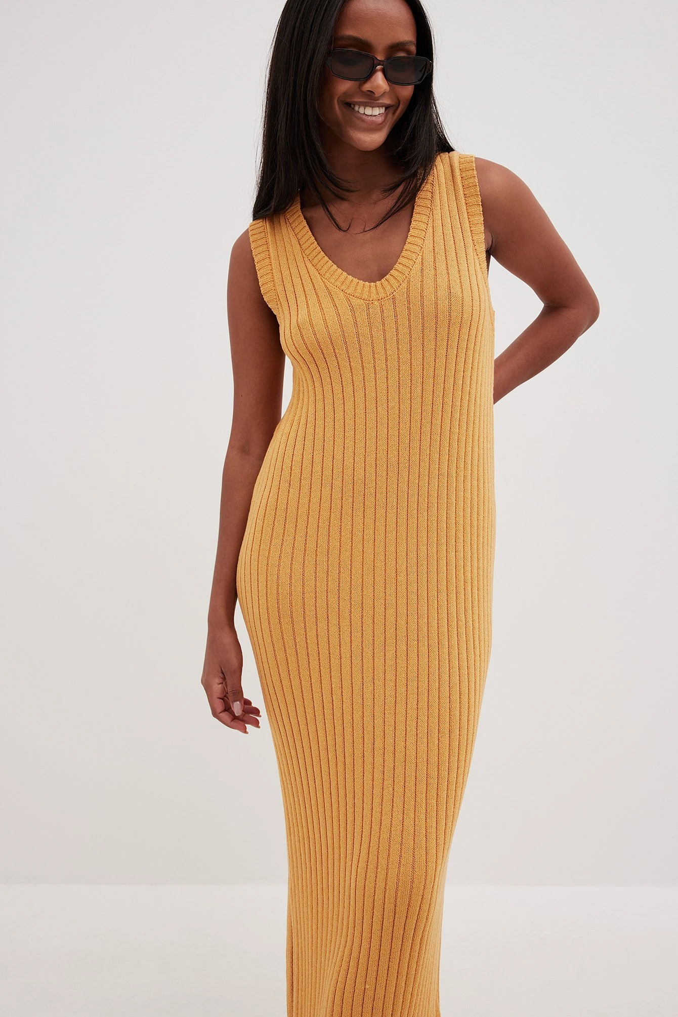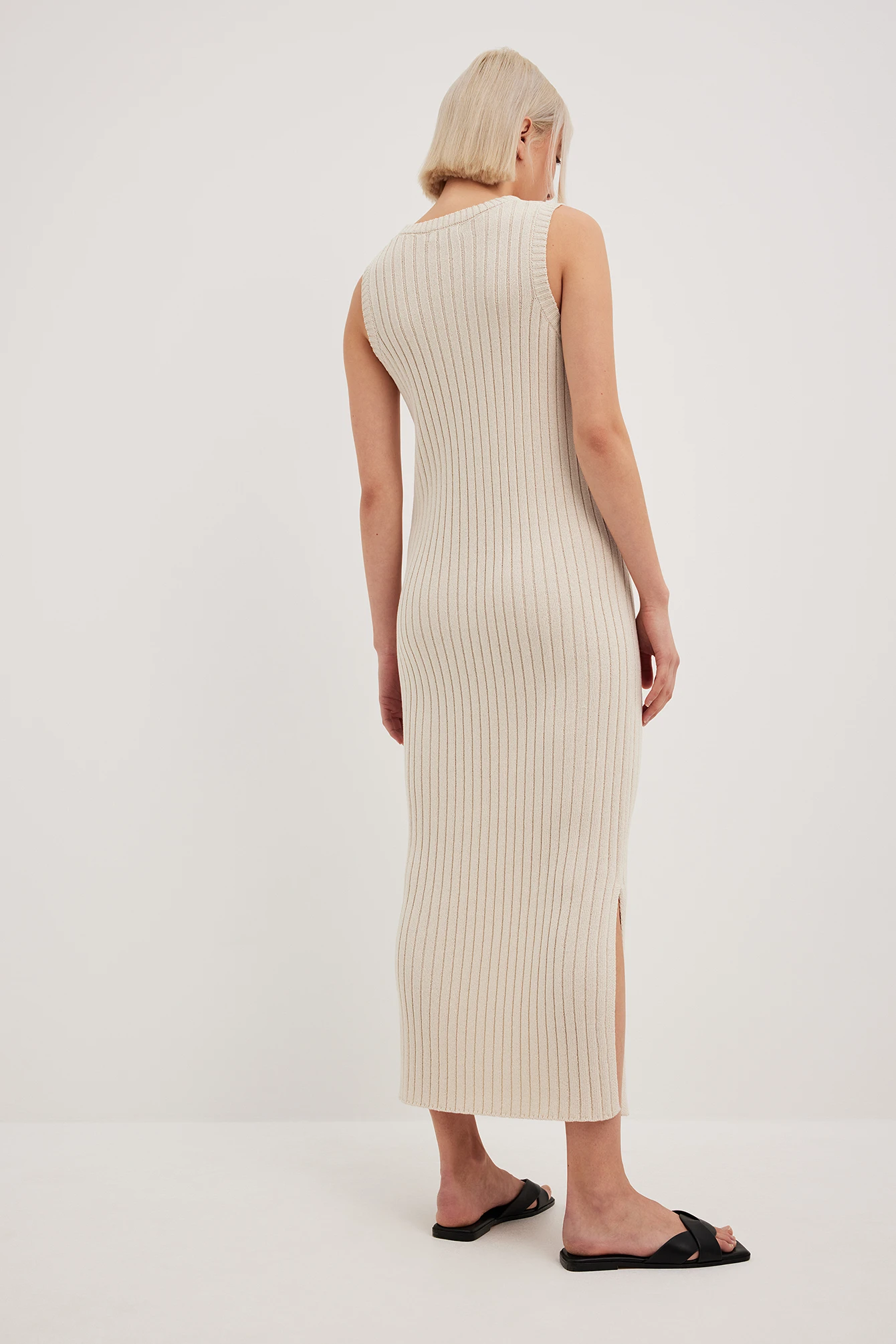 This dress is knitted and stretchy and features a midi length. It has a ribbed sleeveless design and a wide v neckline. Our dress features a low side slit on one side.