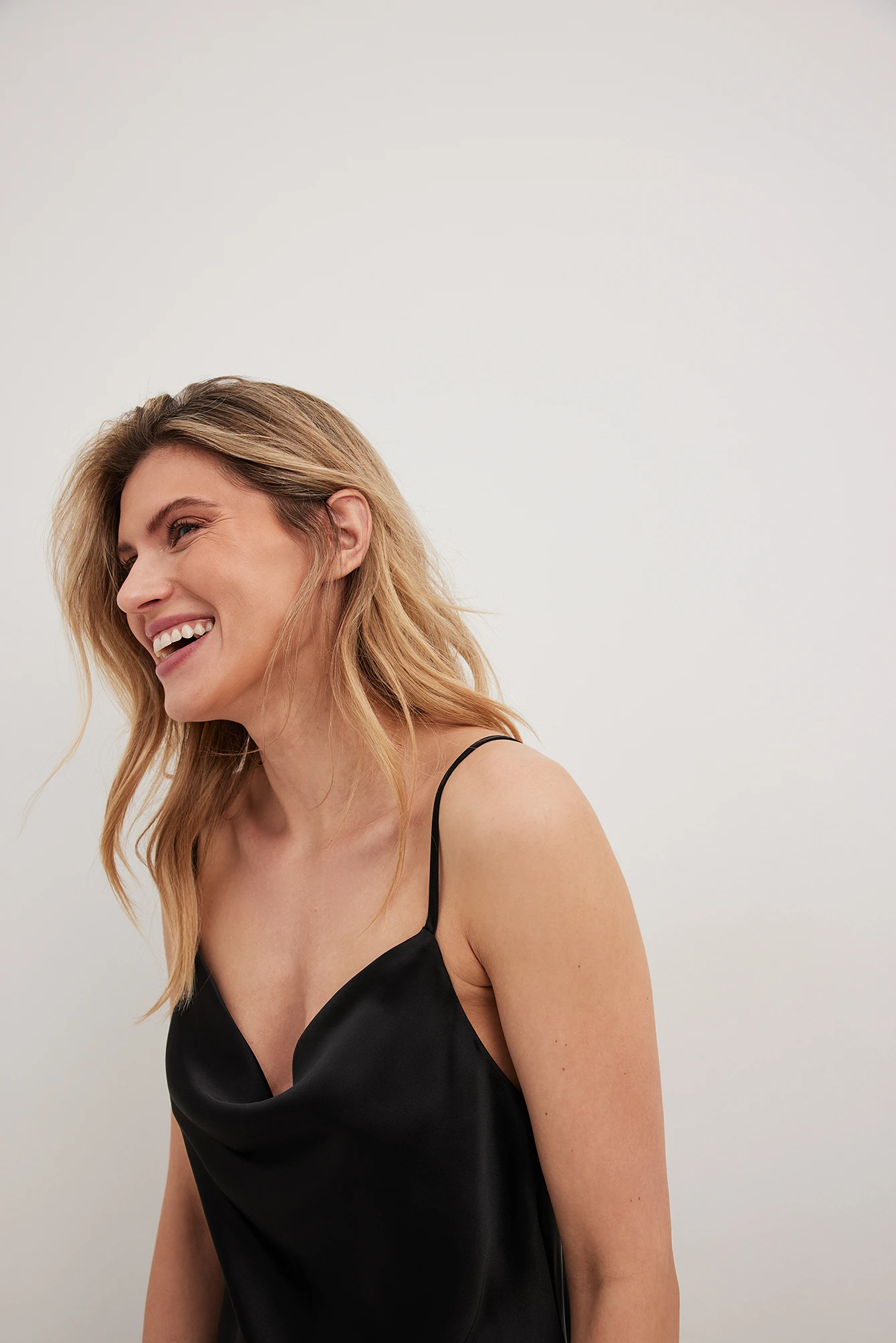 This dress features satin material. It has a waterfall neckline and adjustable spaghetti straps. This dress features a flowy fit and a midi length.