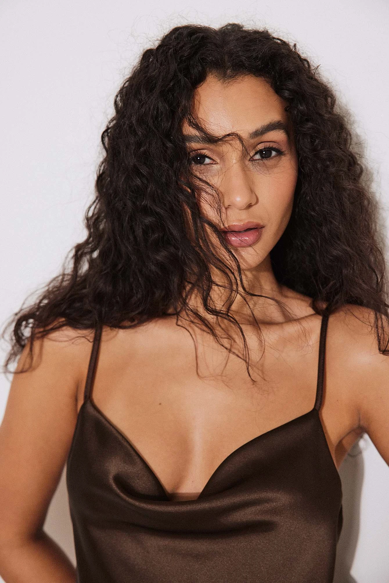 This dress features satin material. It has a waterfall neckline and adjustable spaghetti straps. This dress features a flowy fit and a mini length.