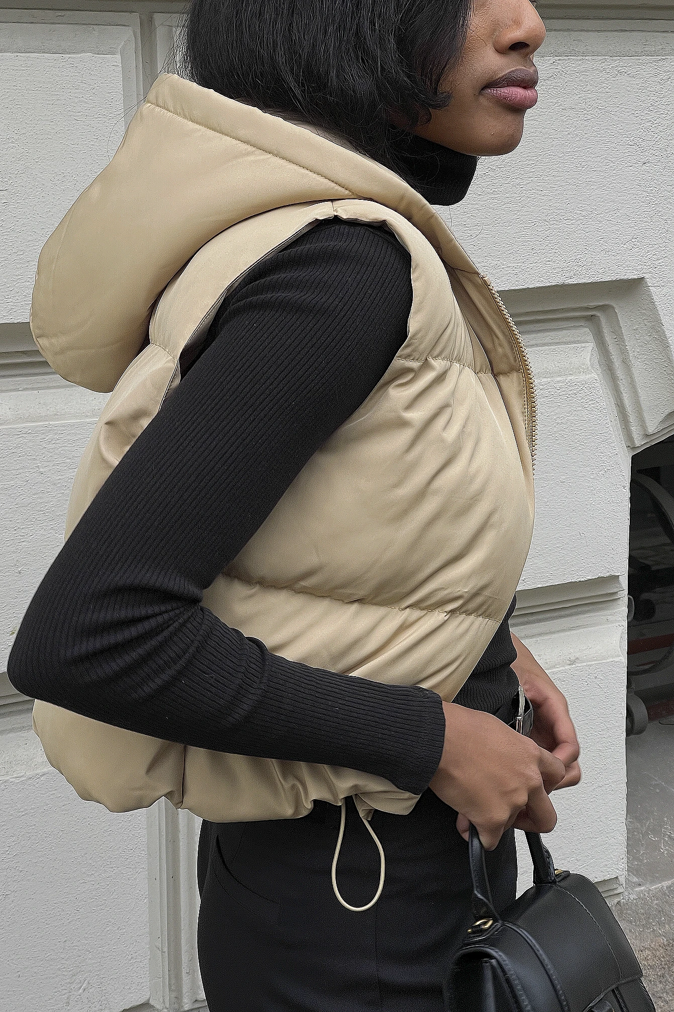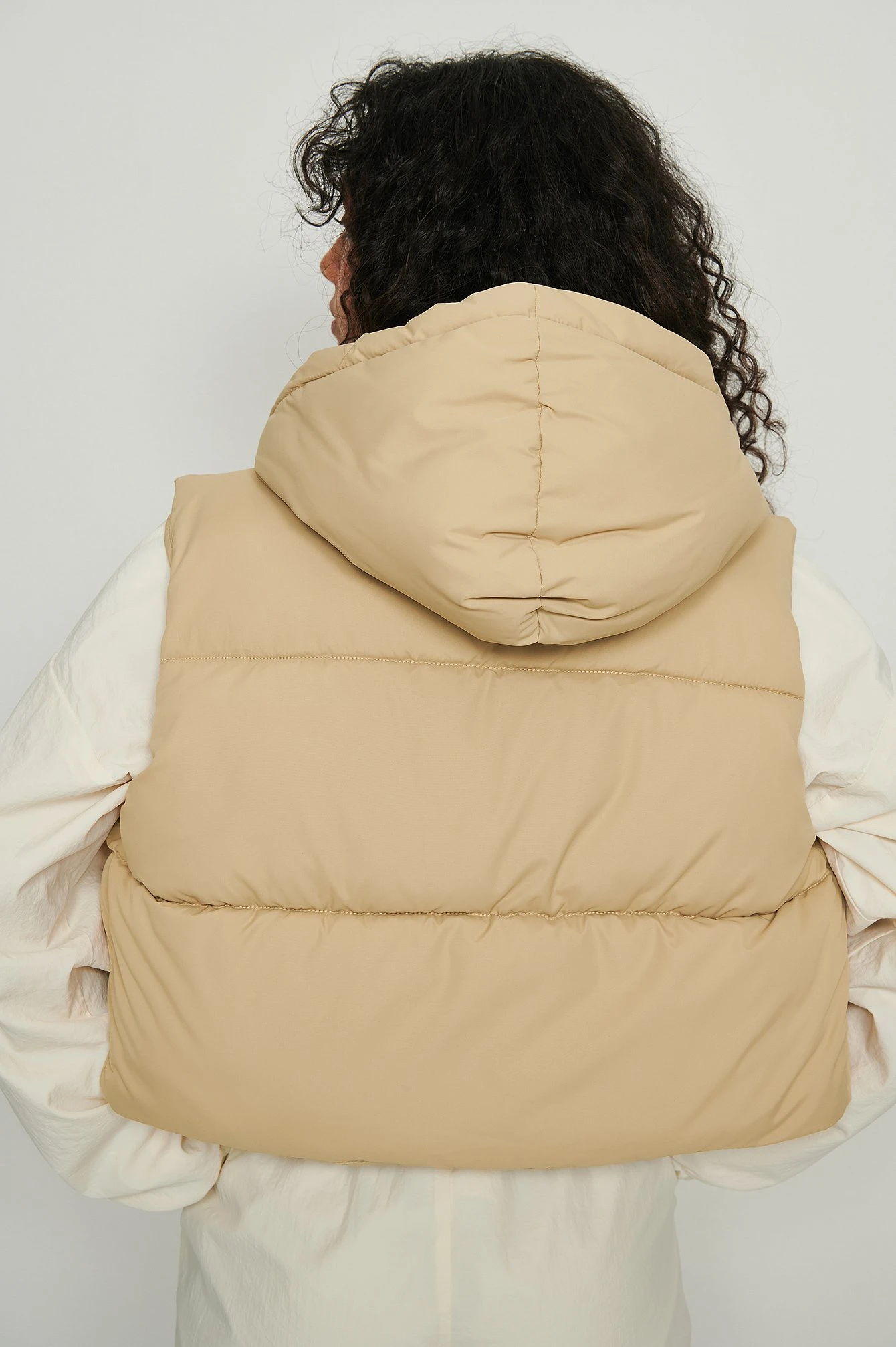 This vest features a hood, a zipper closure, an adjustable drawstring waist and cropped length.