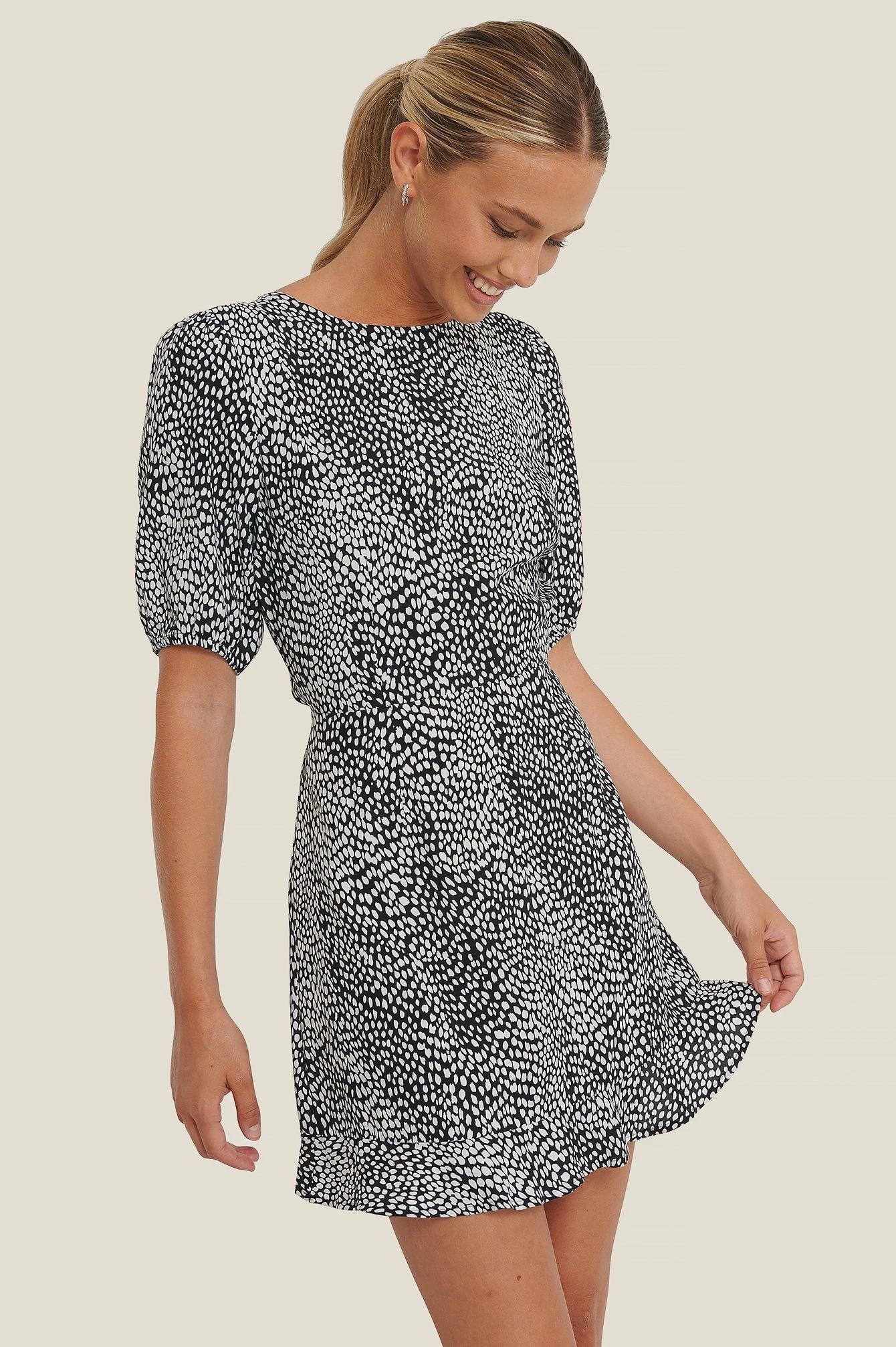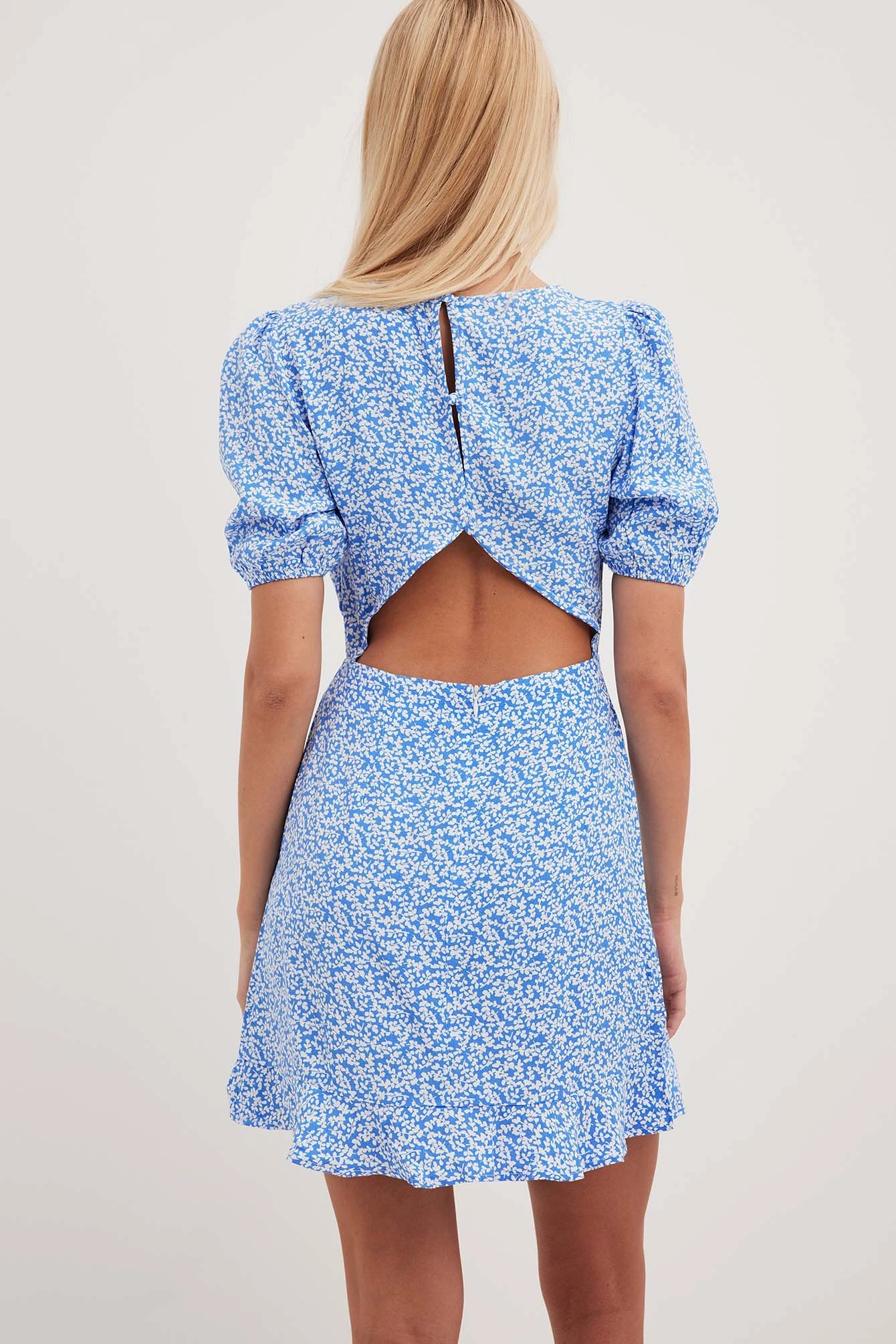 This dress features a round neckline, short sleeves with elasticized cuffs, button closures behind the neck, a cut out detail at the back with a concealed zipper and hook closure underneath, flounced details on the bottom hem and a mini length.