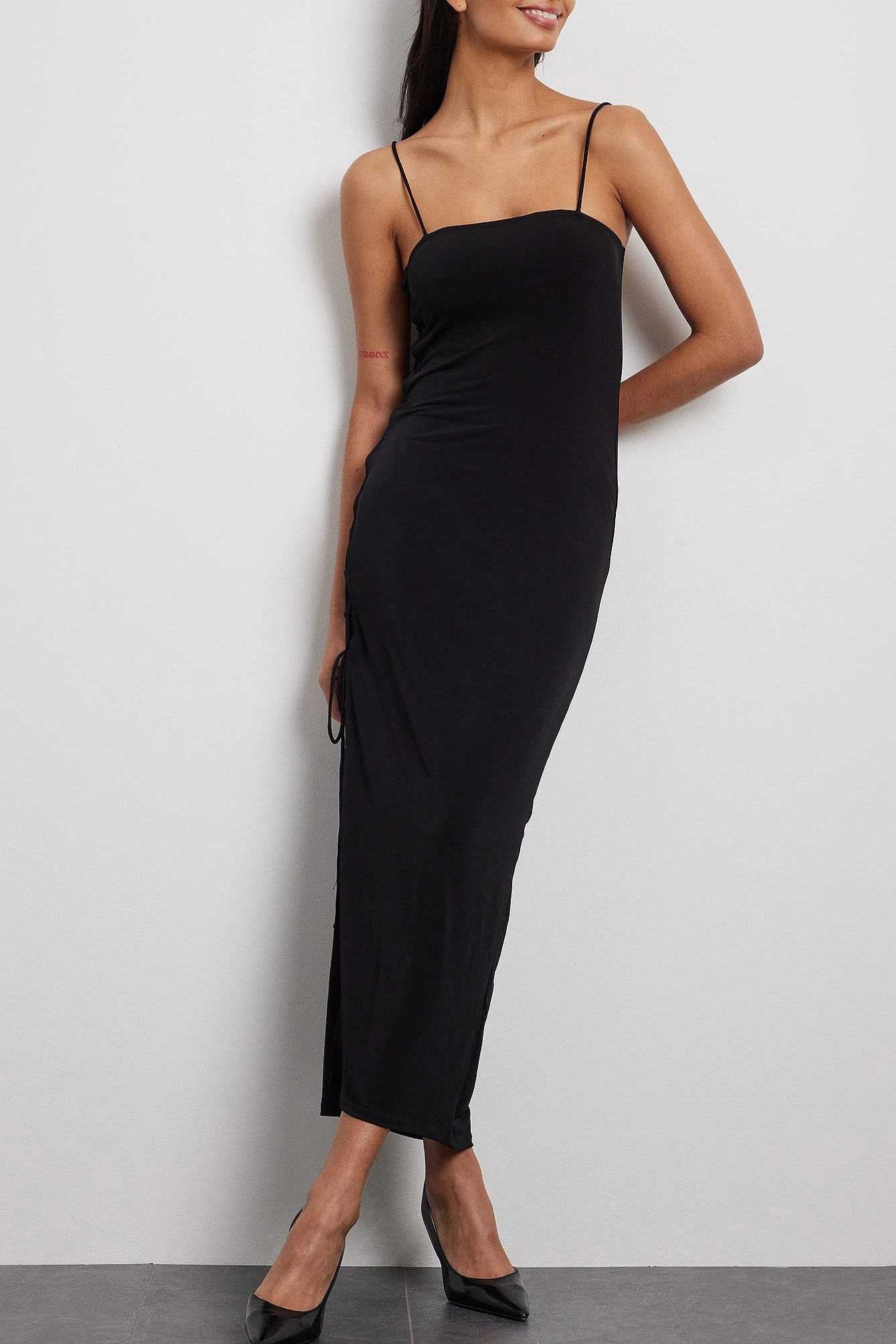 This dress features a deep square neckline and thin straps. It has a cut out detail on the side with an adjustable tie strap, a side slit and a maxi length.