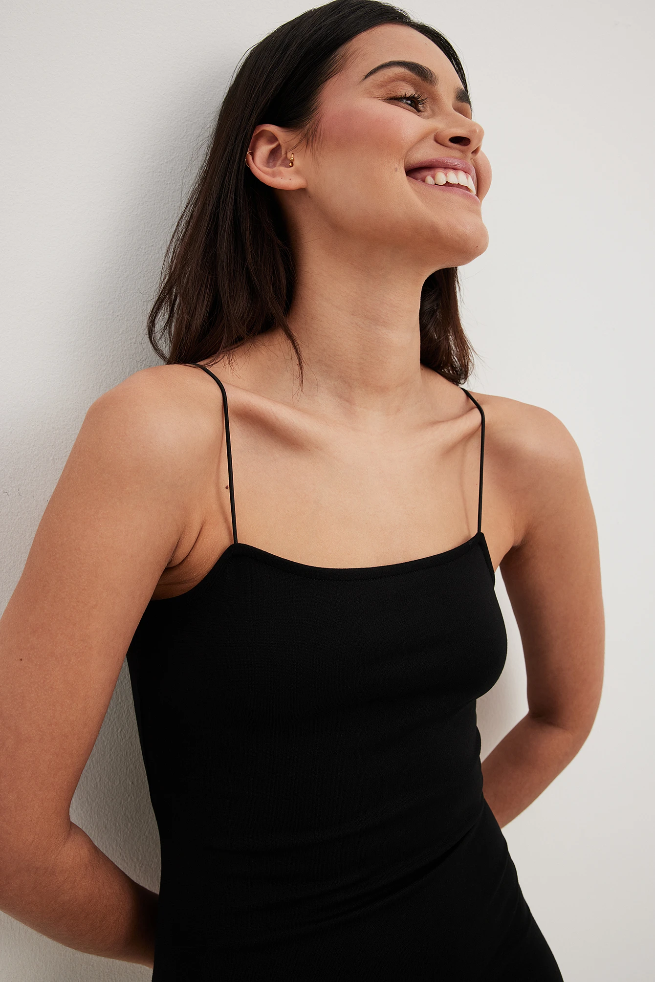 This dress features a bodycon fit and a stretchy material. It has a square neckline, spaghetti straps and a mini length.