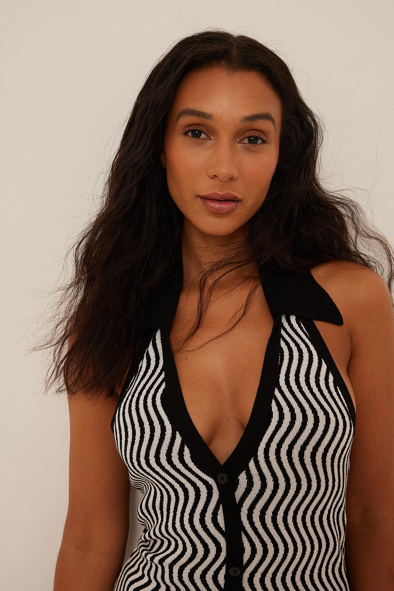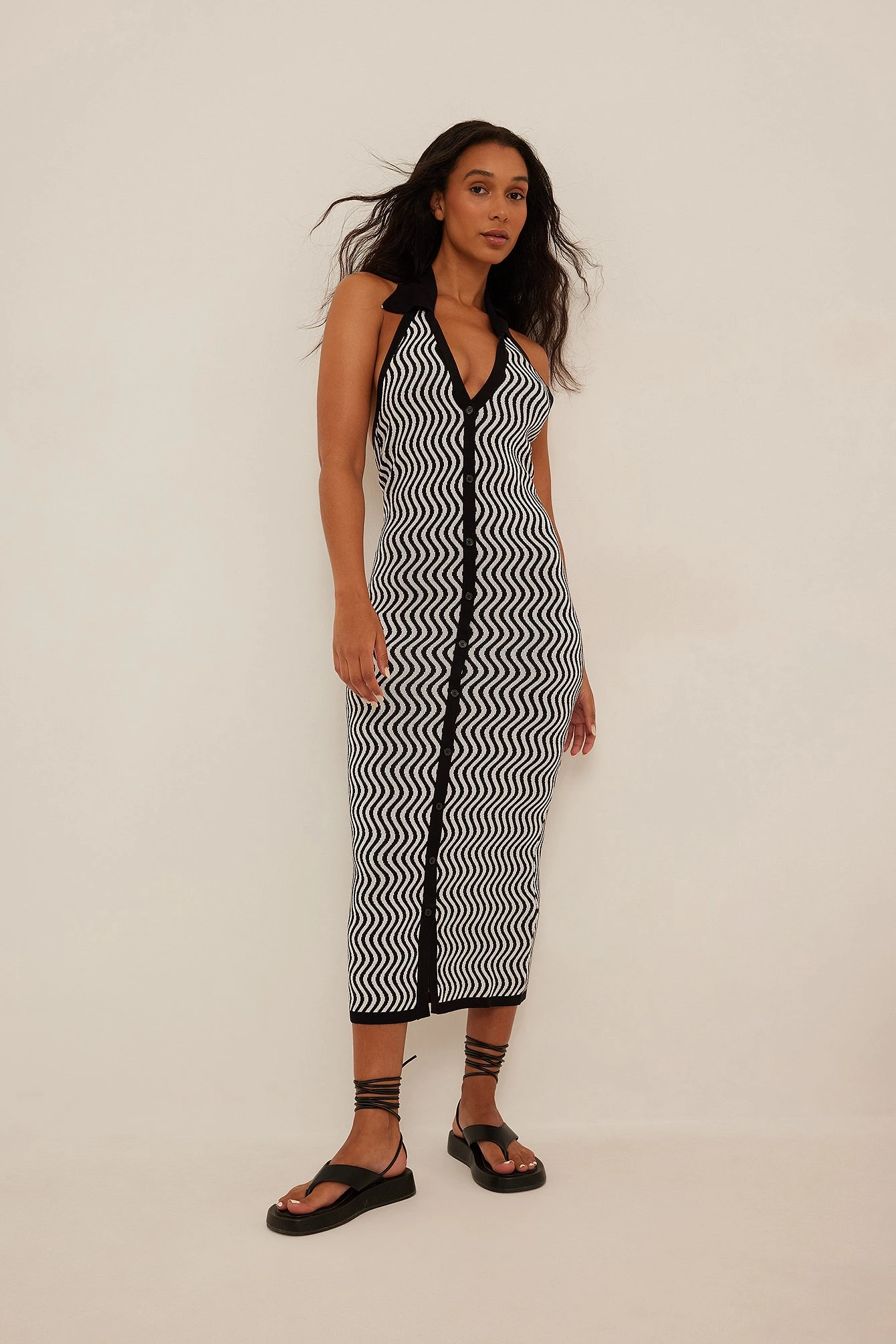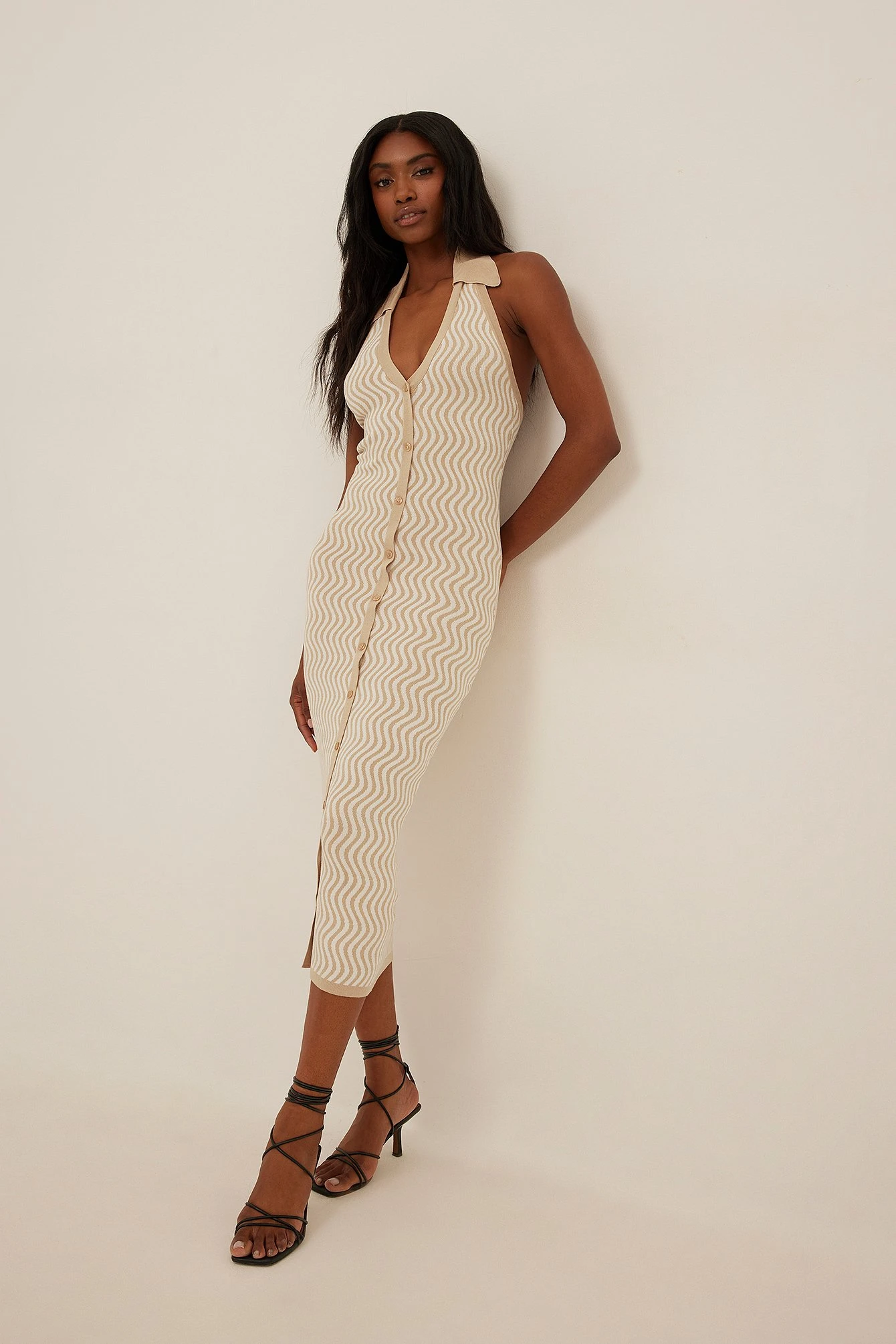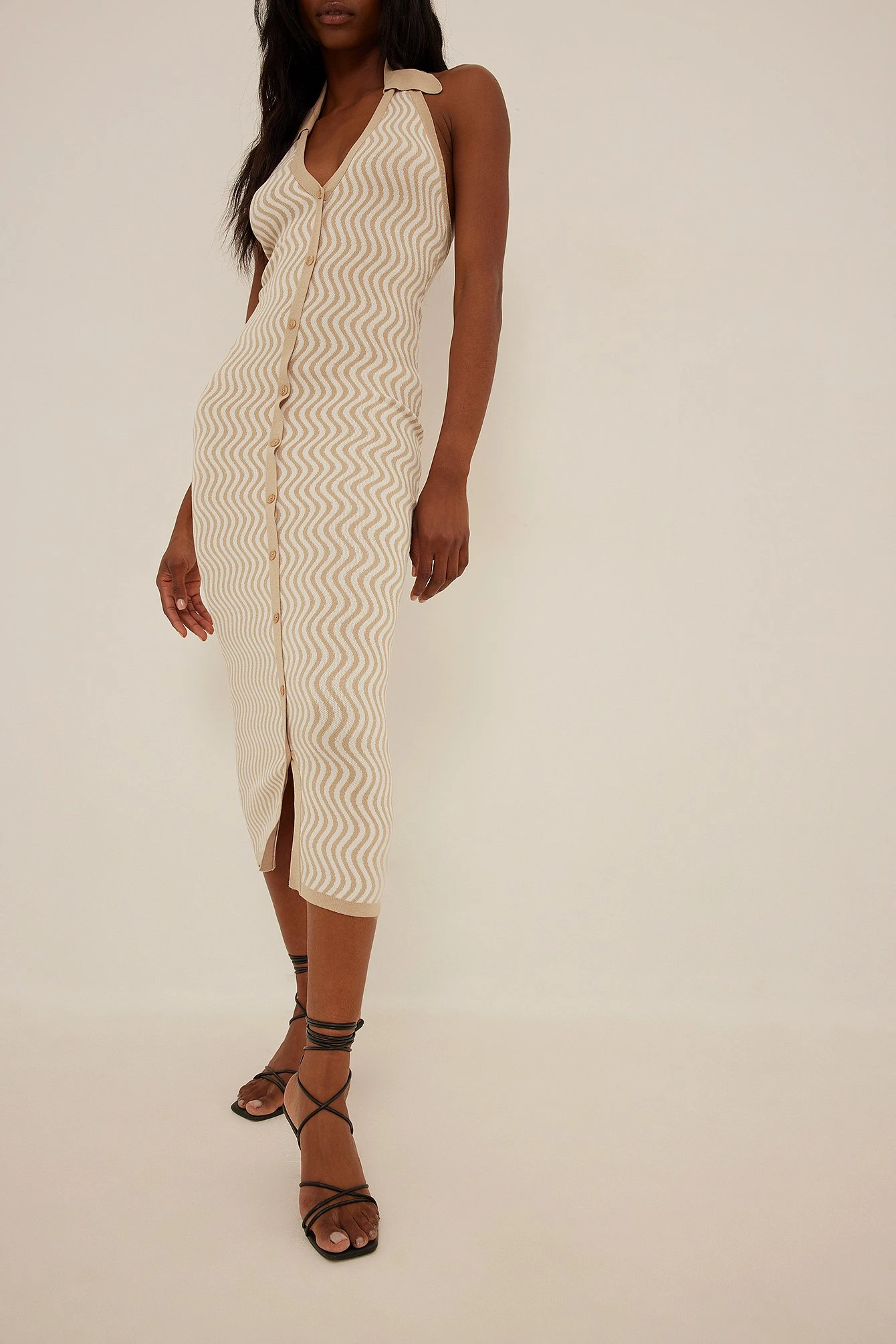 This knit dress features a classic collar with a halterneck design and button details along the front.