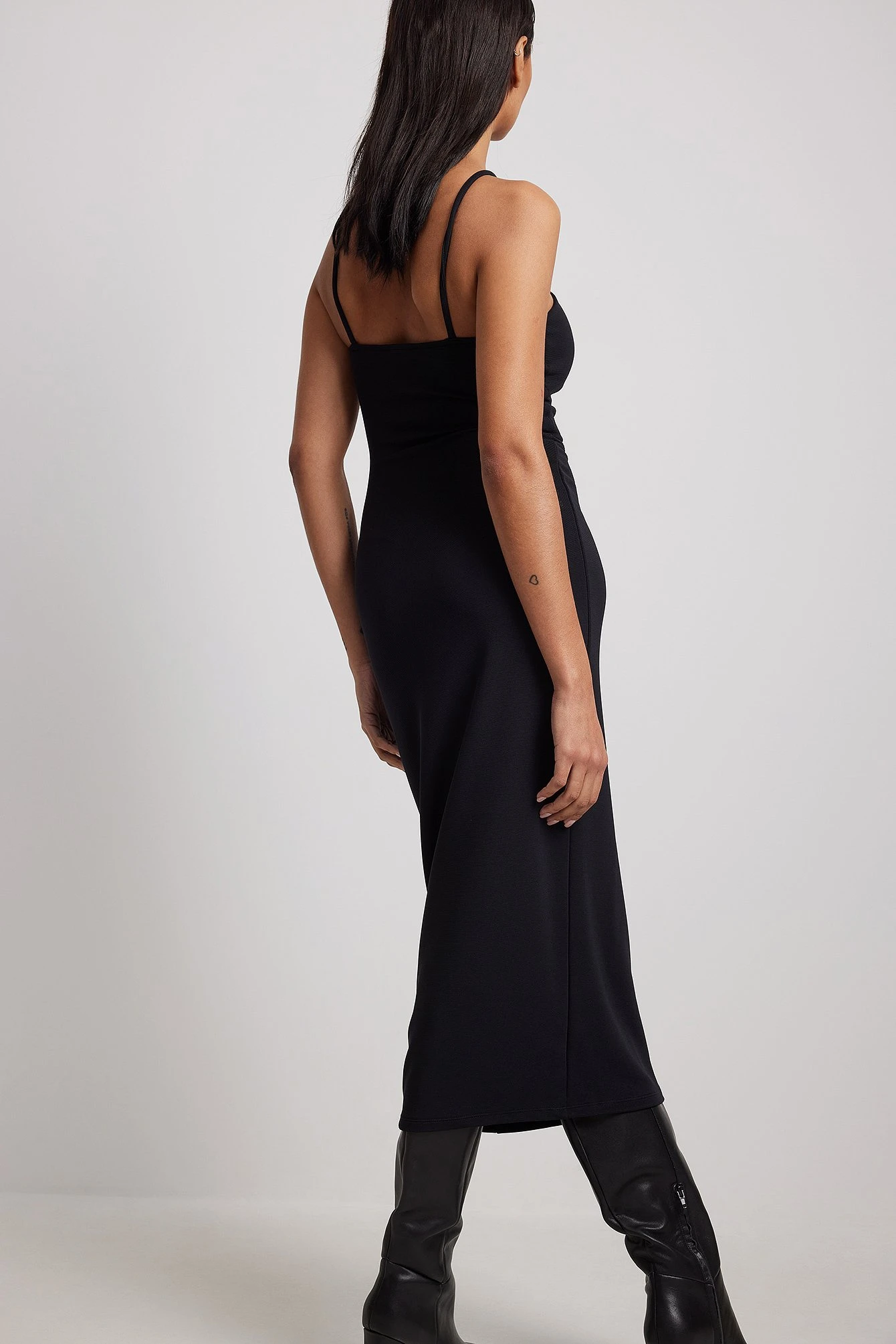 This dress features a halterneck design with thin straps. It has a stretchy material in ribbed jersey and a midi length.
