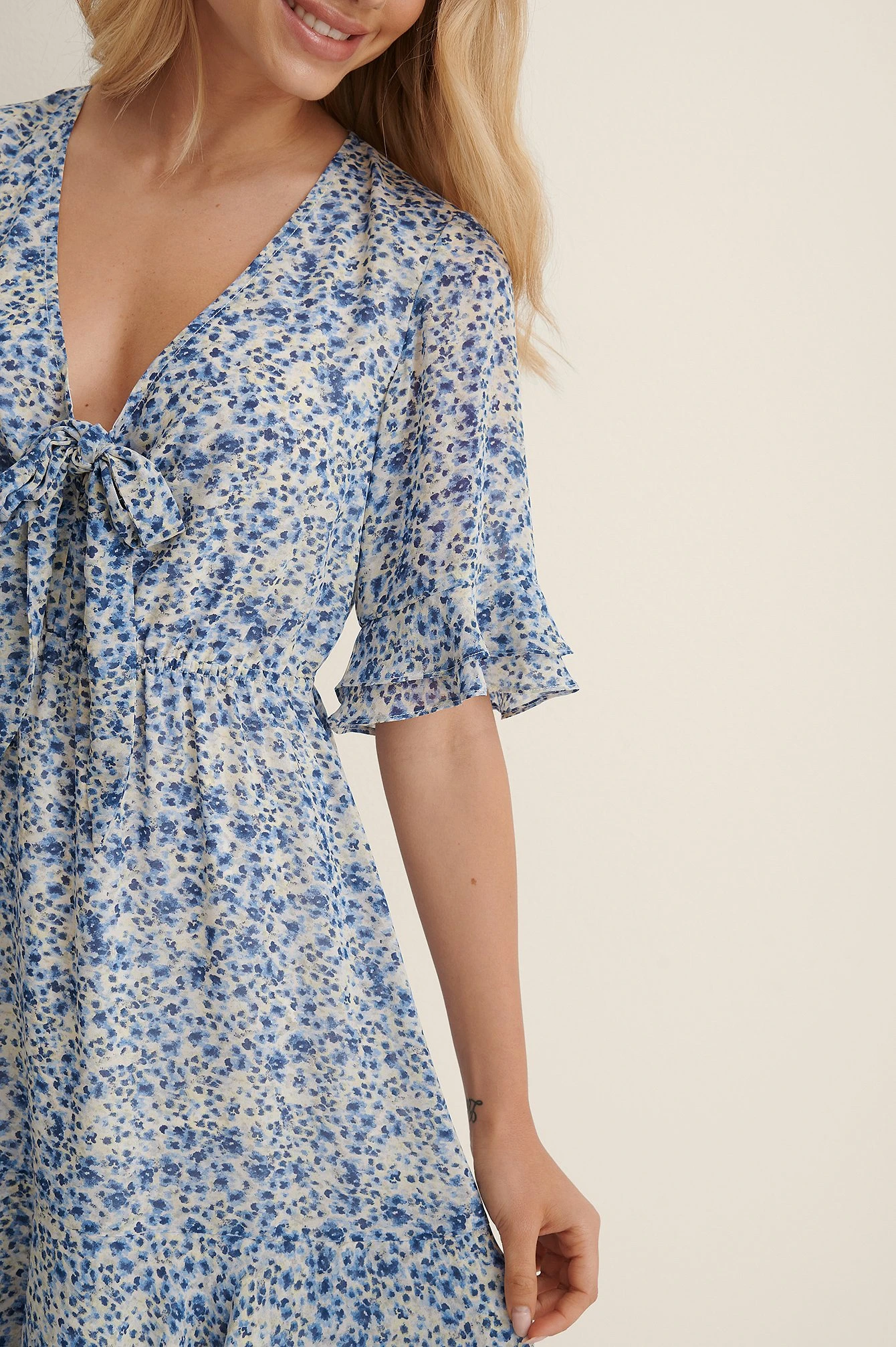 This mini dress features a v neckline, short sleeves, a self-tie knot on the front, an elasticized waistband, flounced details, a flowy fit and underlining.