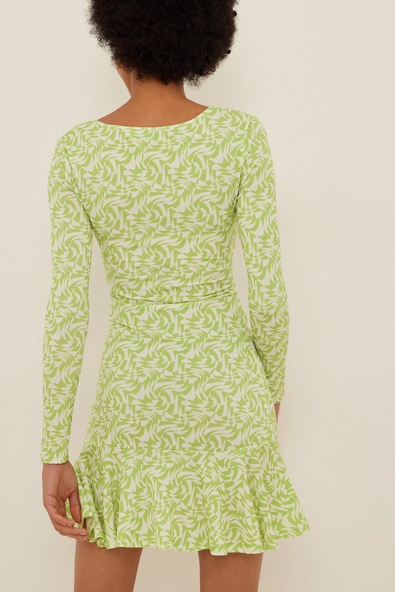 This mini dress features long sleeves, gathered seams, a v neckline and a frill detail.