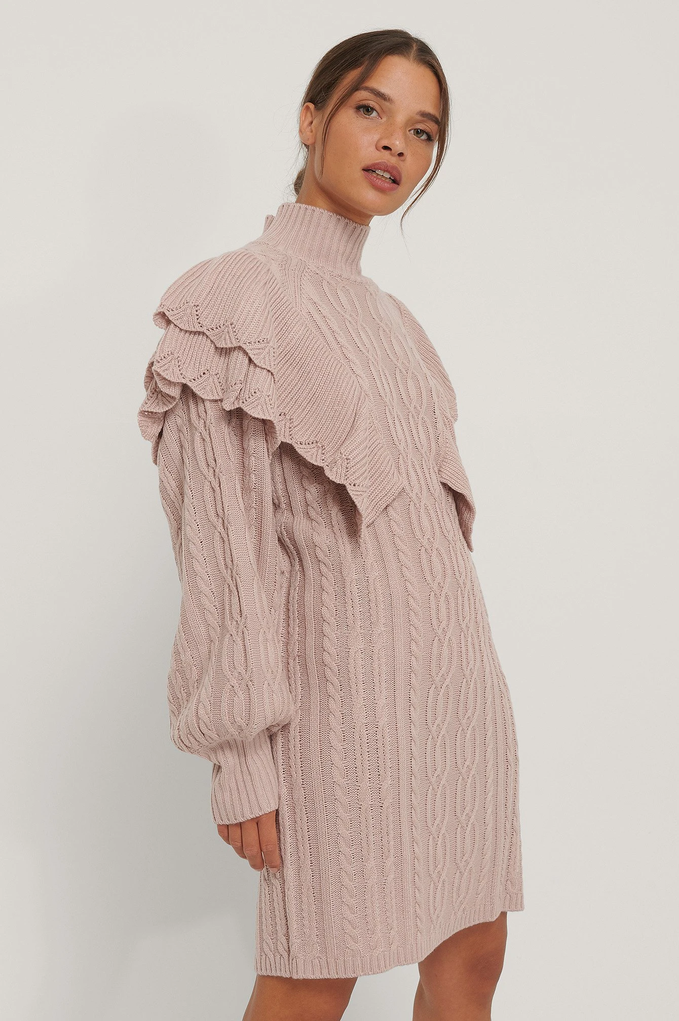 This dress is cozy and features a turtleneck, long sleeves with tight ribbed cuffs, a knitted, relaxed design with flounced details along the front and a mini length.