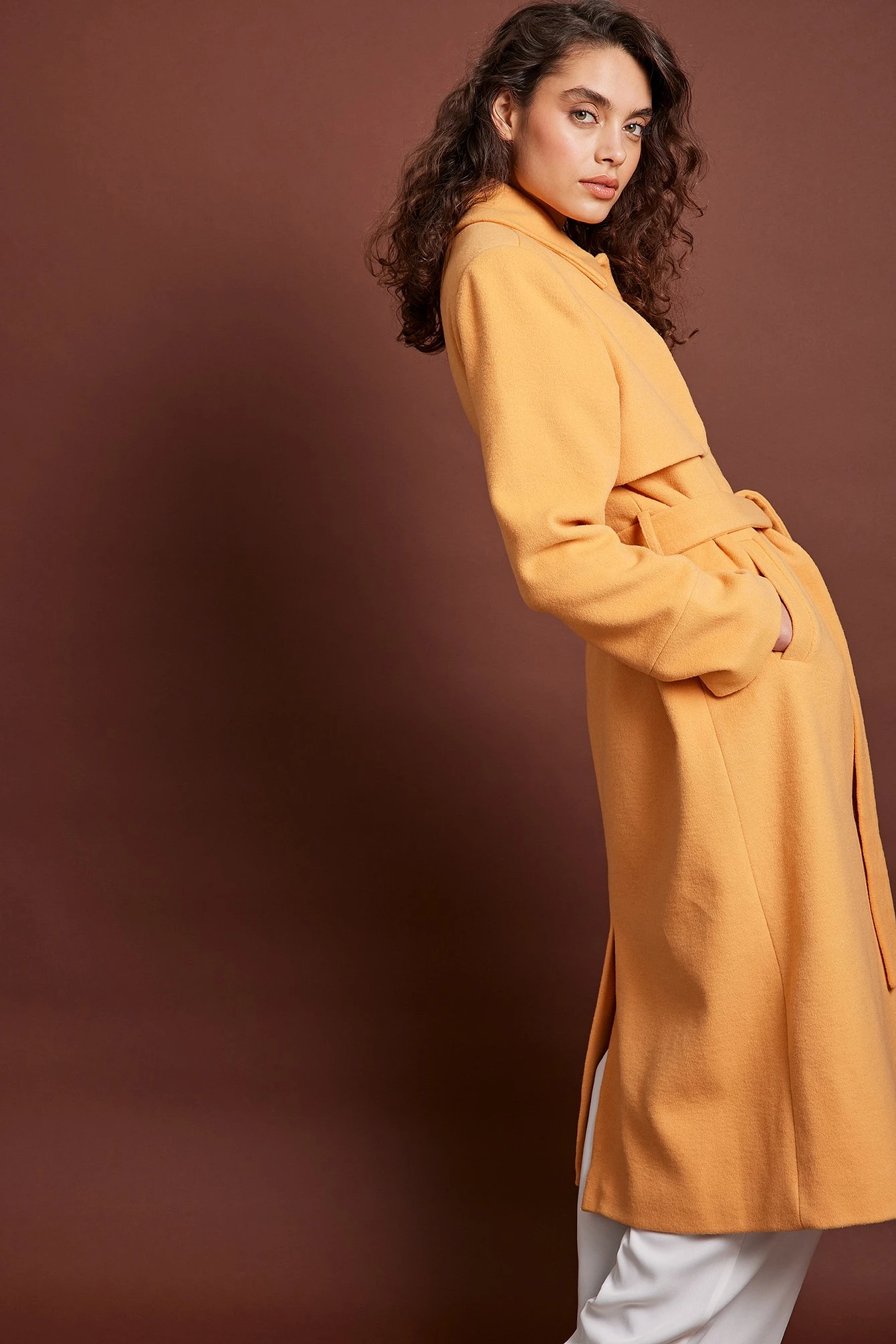 This coat is oversized and features a classic collar, a front panel detail with a snap button closure, a belt tie, side pockets, a button closure, a lining and a slit detail on the back.