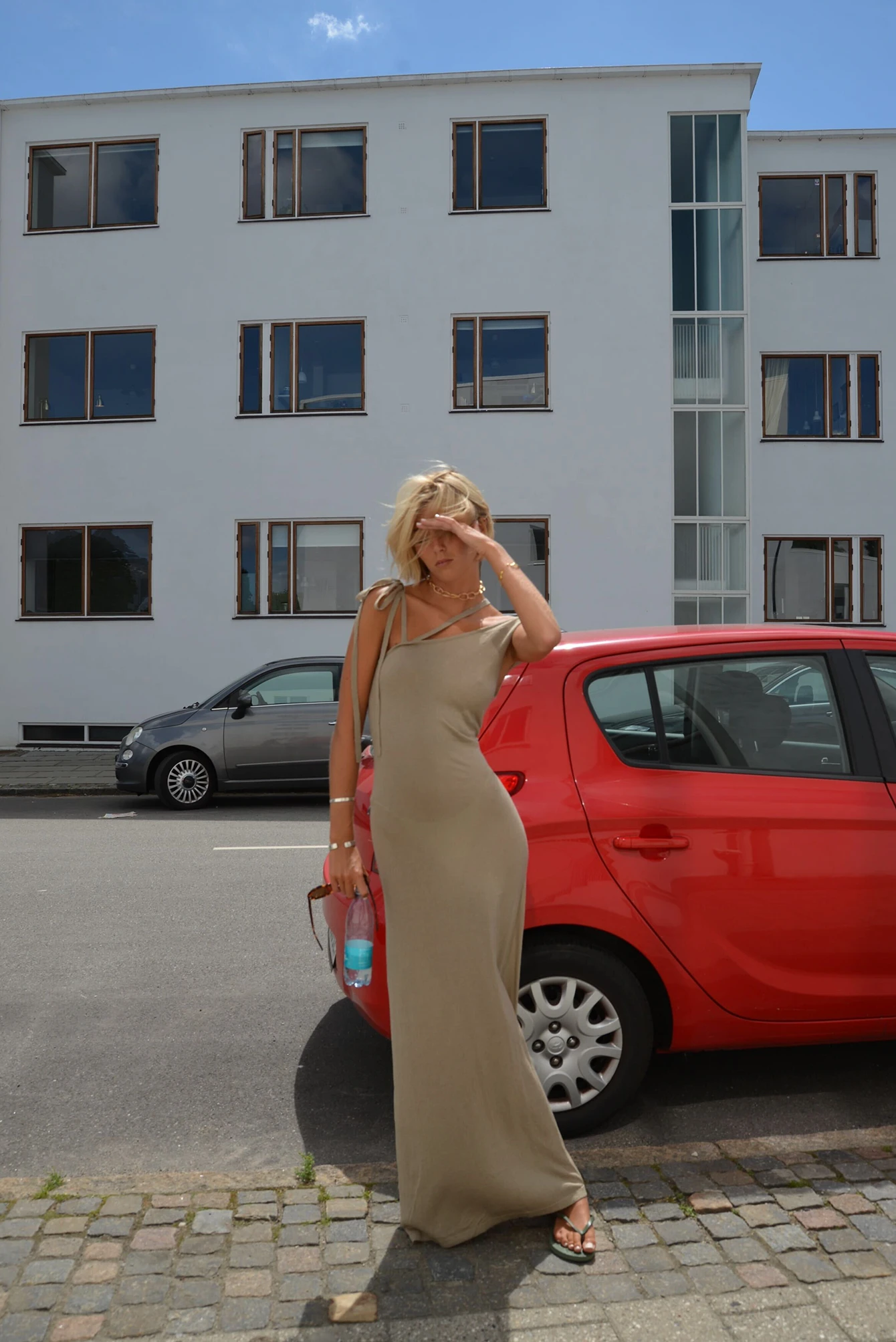 This maxi dress features a one shoulder design and a self-tie shoulder strap.