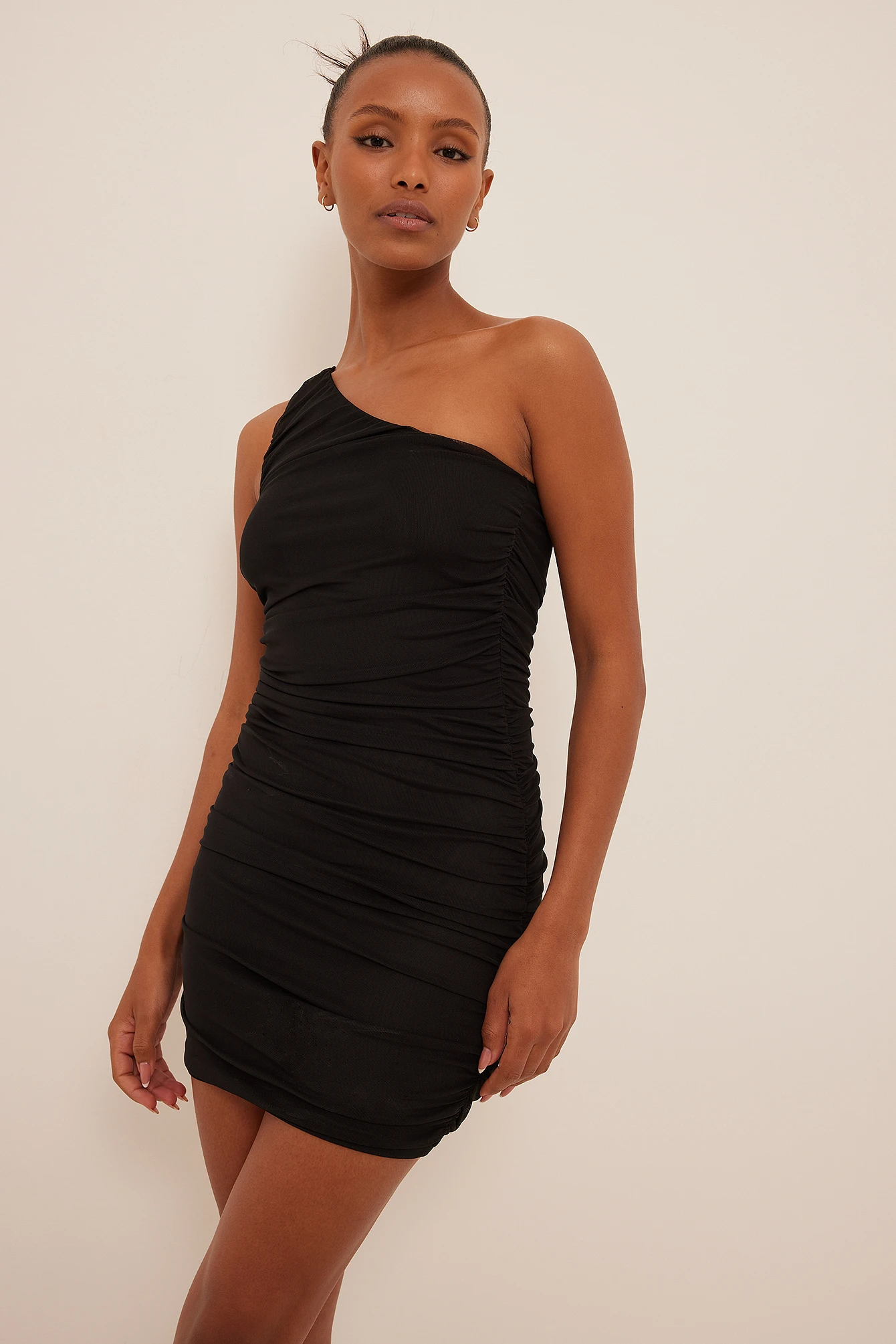 This mini dress features a one shoulder look, ruched seams, a top layer in mesh and a form fit.