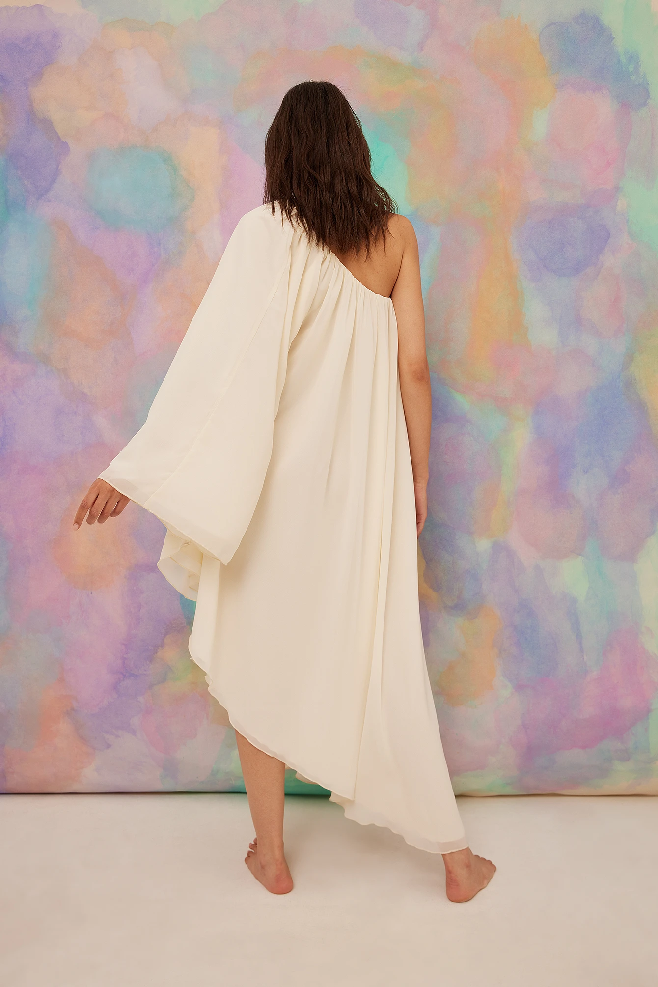This midi dress is draped. It features a one sleeve design with an inner silicone trim on the neckline and a chiffon layer with a lining. This midi dress features a loose flowy fit.