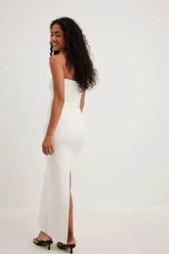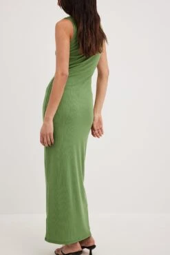 This dress features a one sleeve design, a long sleeve, a fitted midi length and a stretchy, ribbed material.