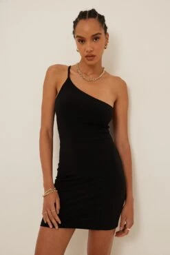 This mini dress features one shoulder strap, an asymmetrical neckline and a stretchy material.