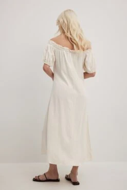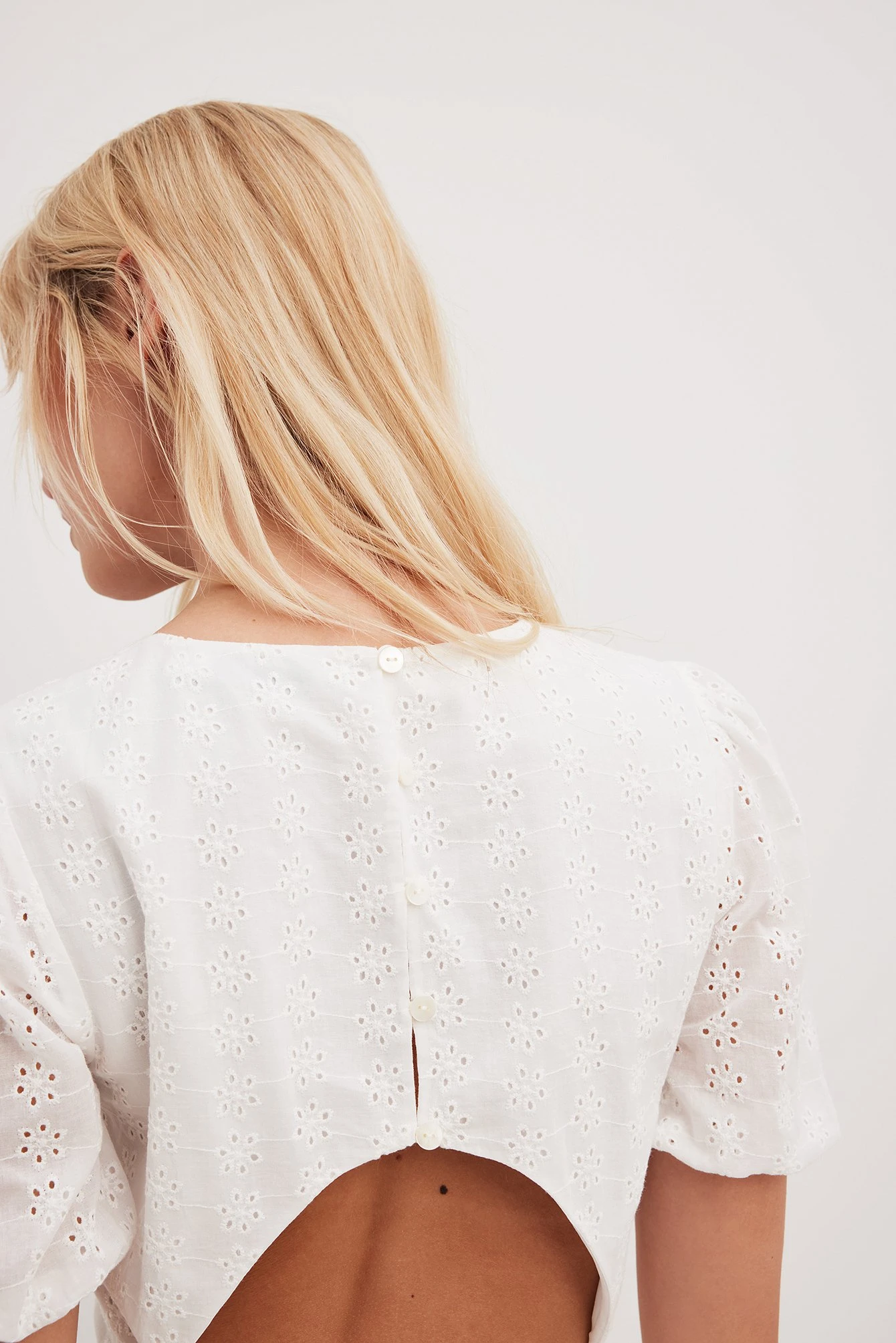 This mini dress features a loose fit and broderie anglaise. It has an open back design with an elasticated band at the waist and button closures behind the neck. Our mini dress features short puff sleeves, flounced details at the hems and an inner shell.