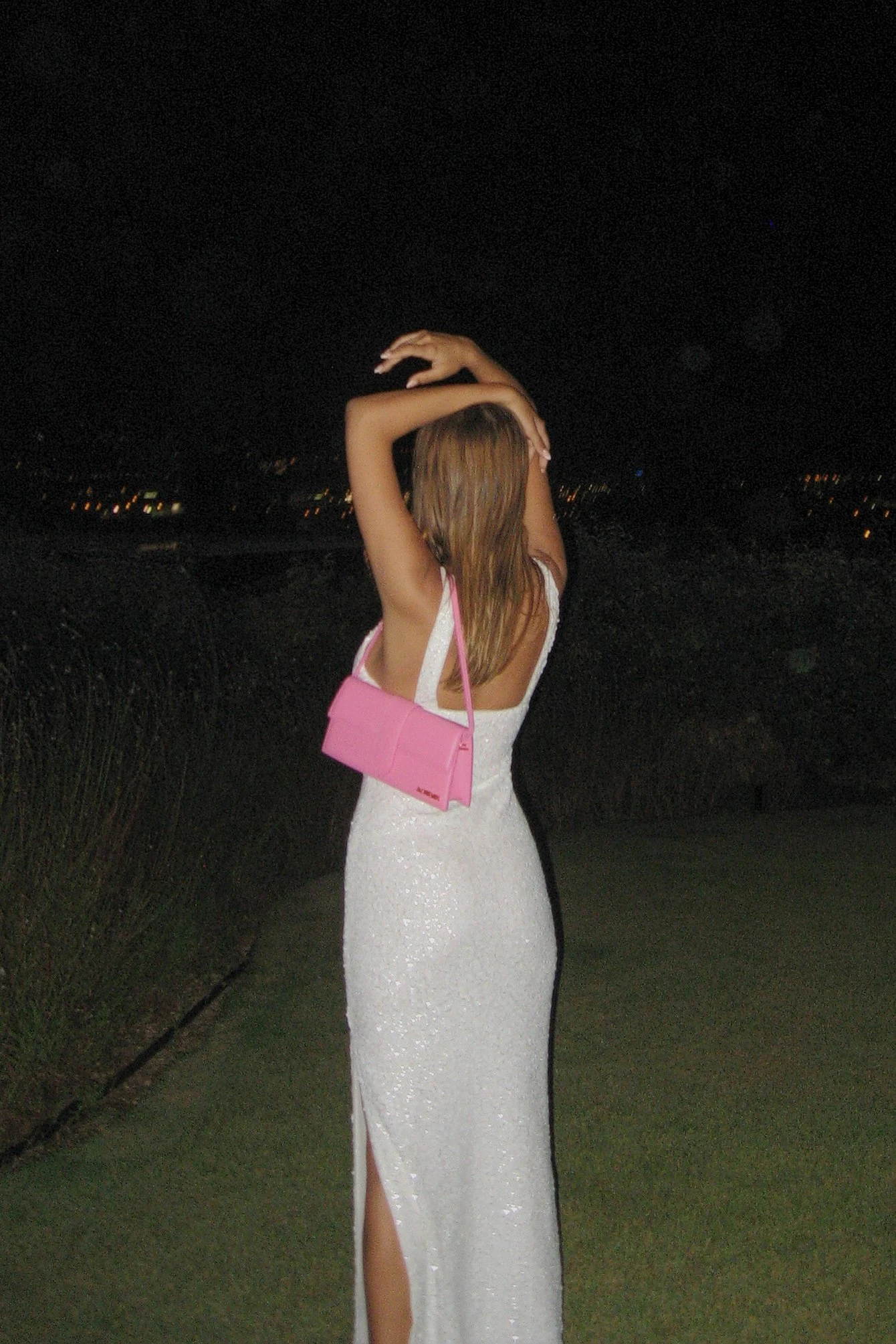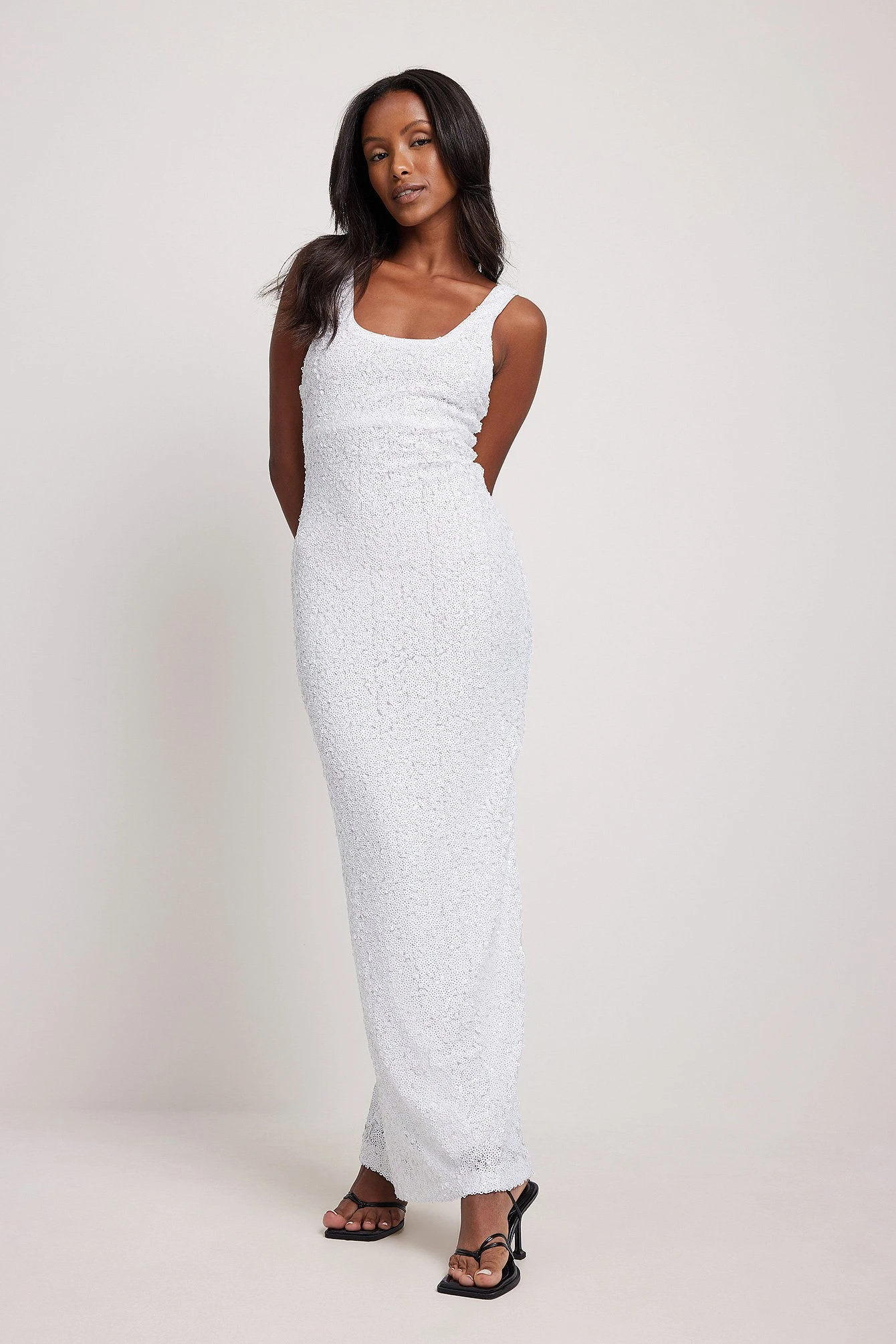 This maxi dress is sleeveless and made of sequin and features a scoop neck. Side slit= extra room for dancing.