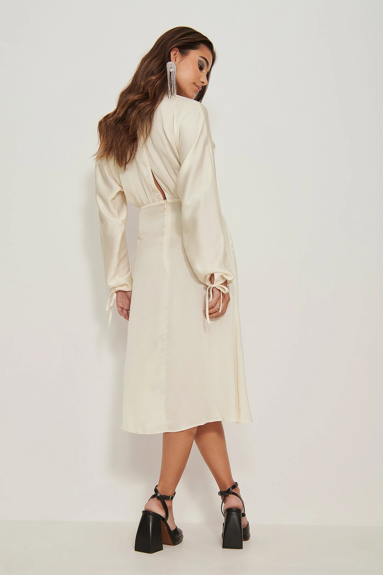 This midi dress features an open back design, a zipper closure at the back, a slit detail at the front and long sleeves with tie details.