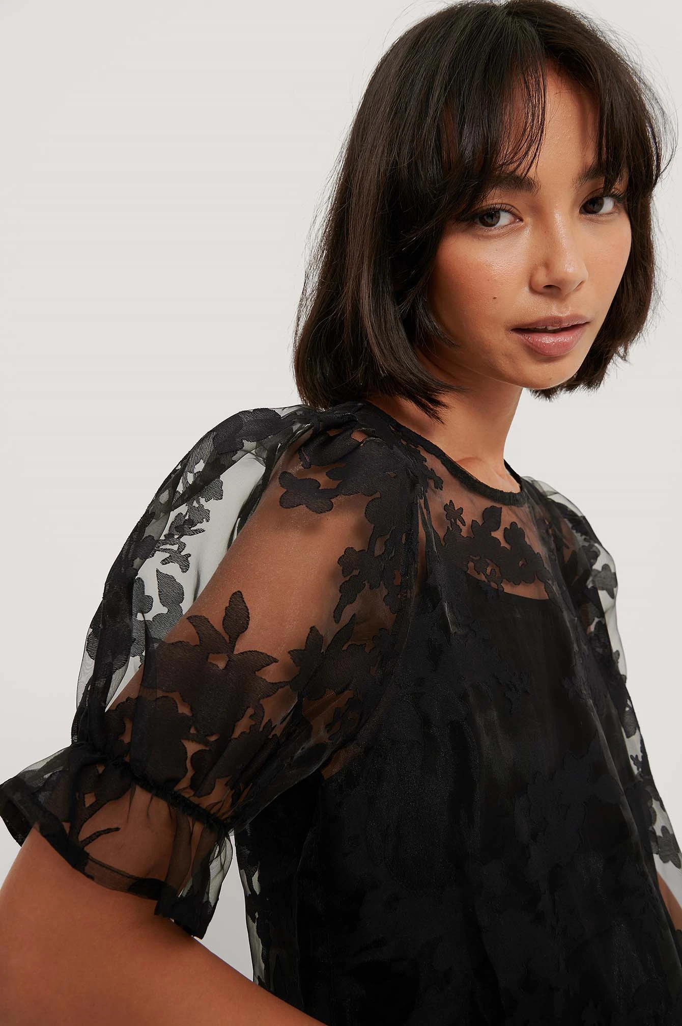 This mini dress is patterned and made of organza material and features a round neckline, puffy short sleeves with elasticized cuffs, a button closure at the back of the neck, ruffle details and a separate slip dress.