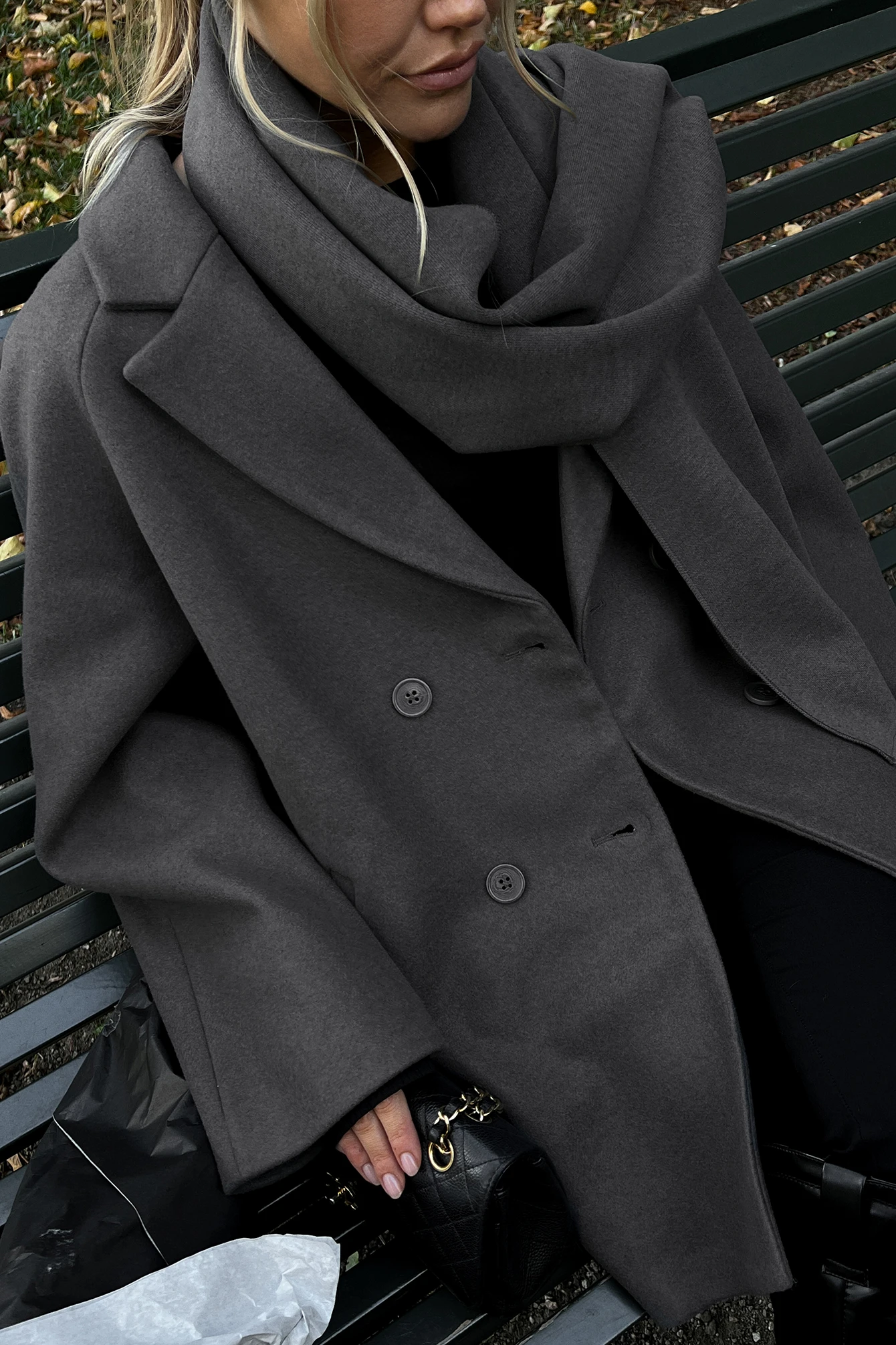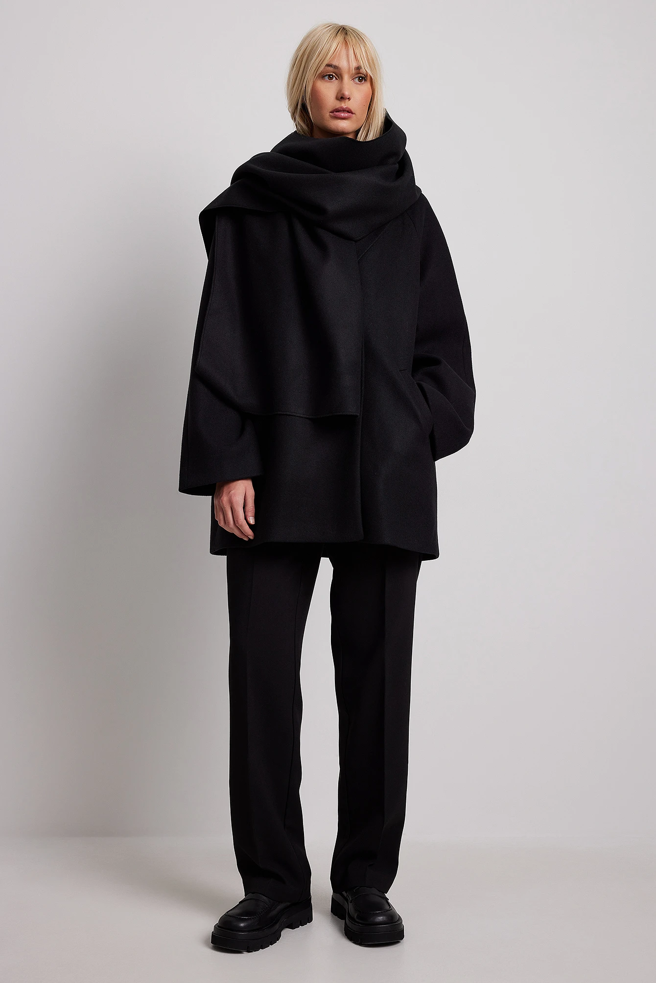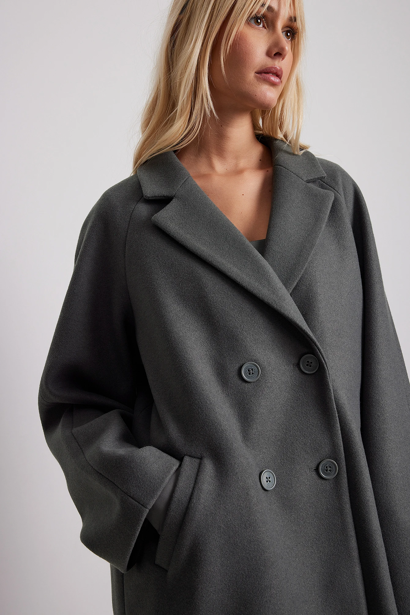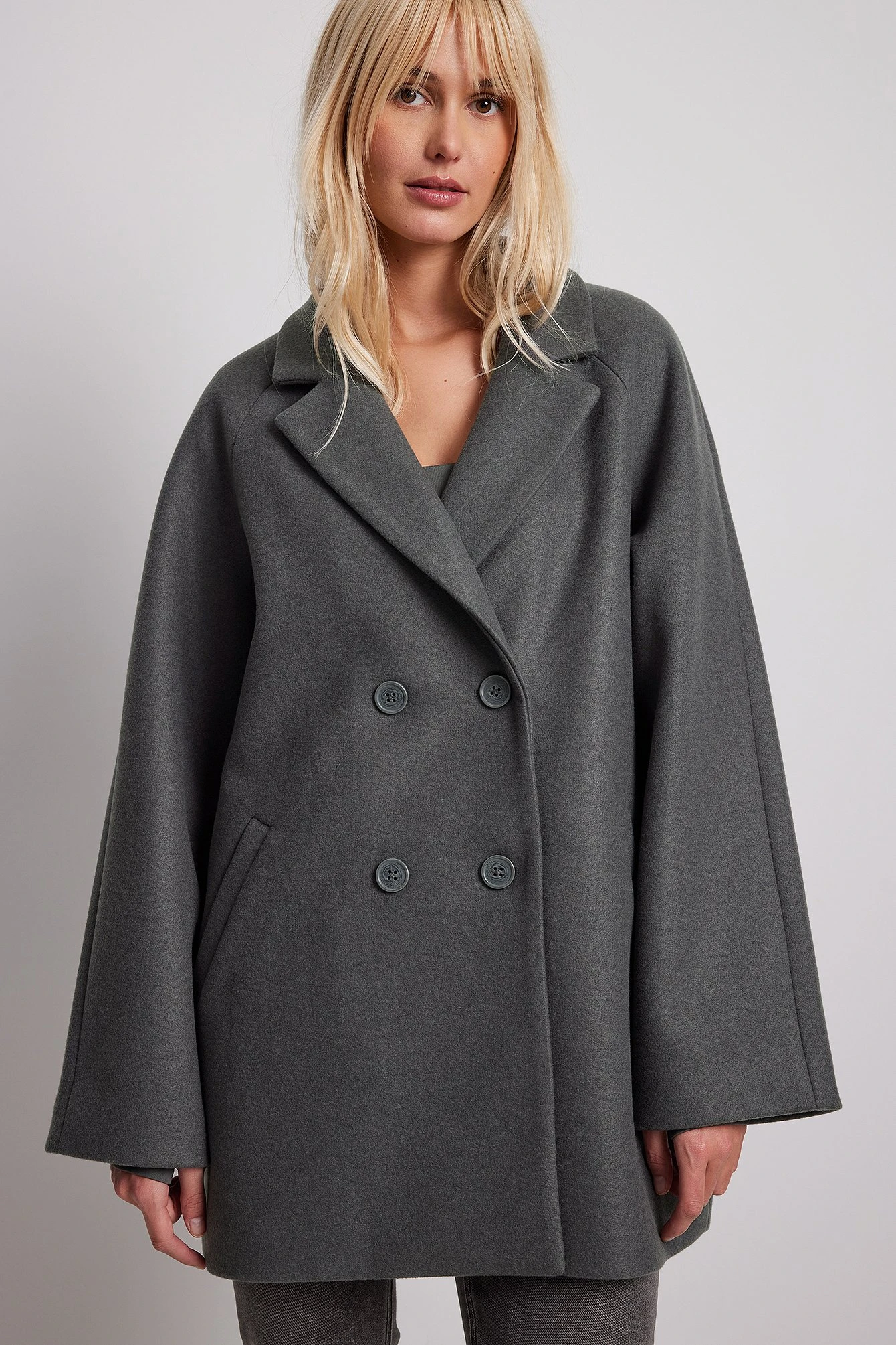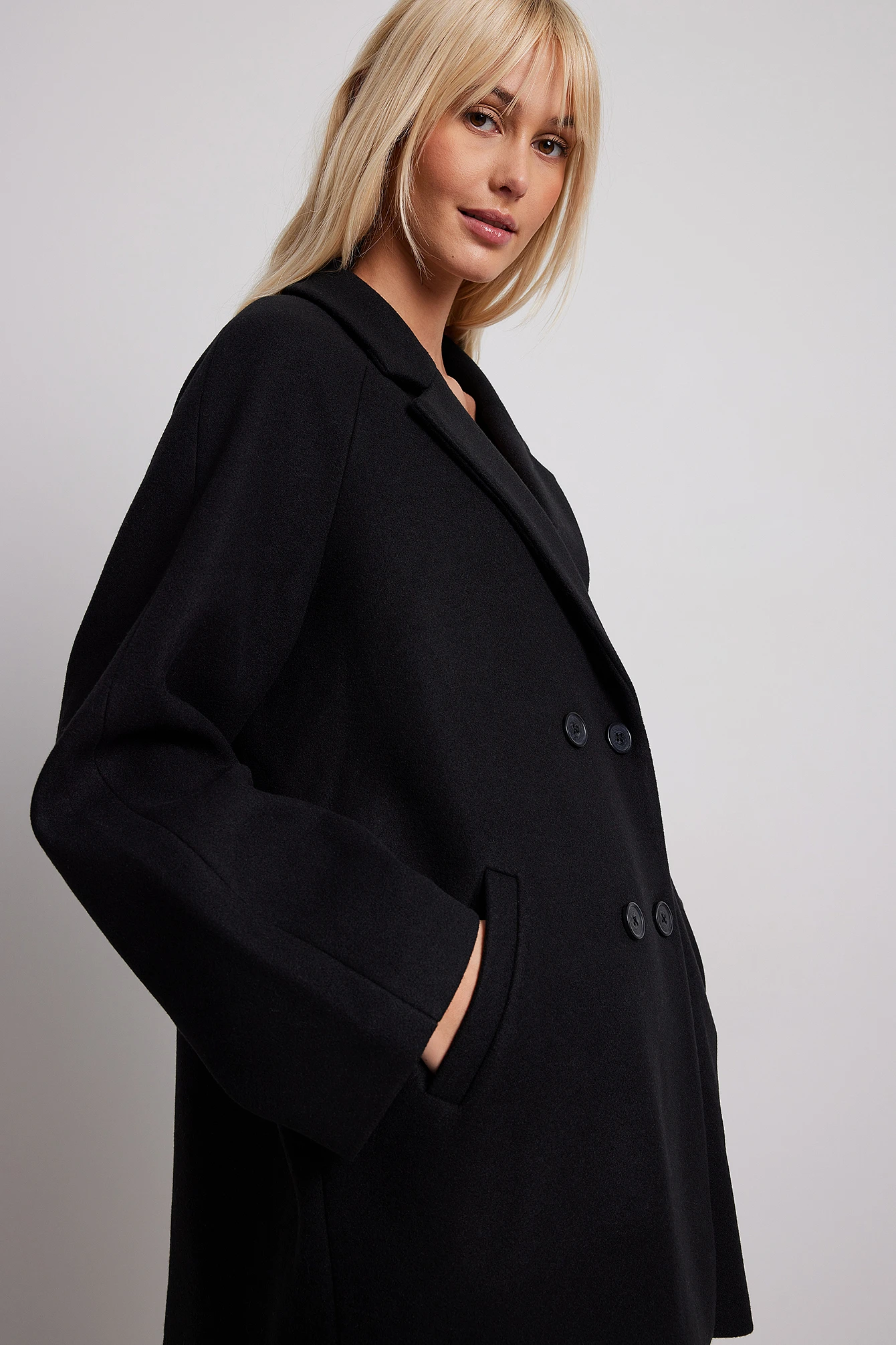 This coat features an oversized fit. It has a wide lapel neckline and a double-breasted button design. This coat features two side slanting pockets at the front and a fabric lining.