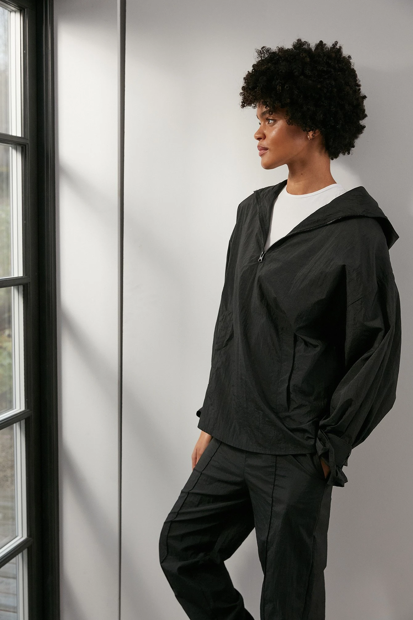 This jacket features a hood, a half-up zipper, dropped shoulders, long sleeves with belt loops and a removable velcro strap at the cuffs, two pockets with one snap button closure on the front and an oversized fit.