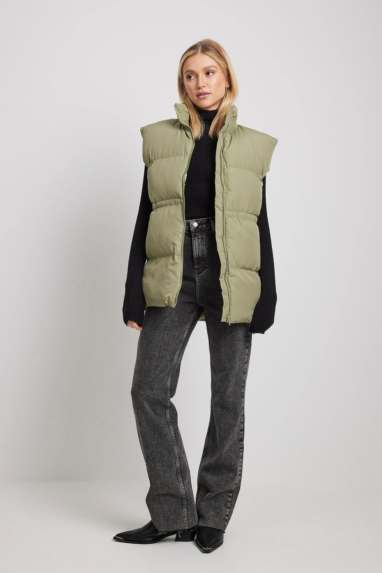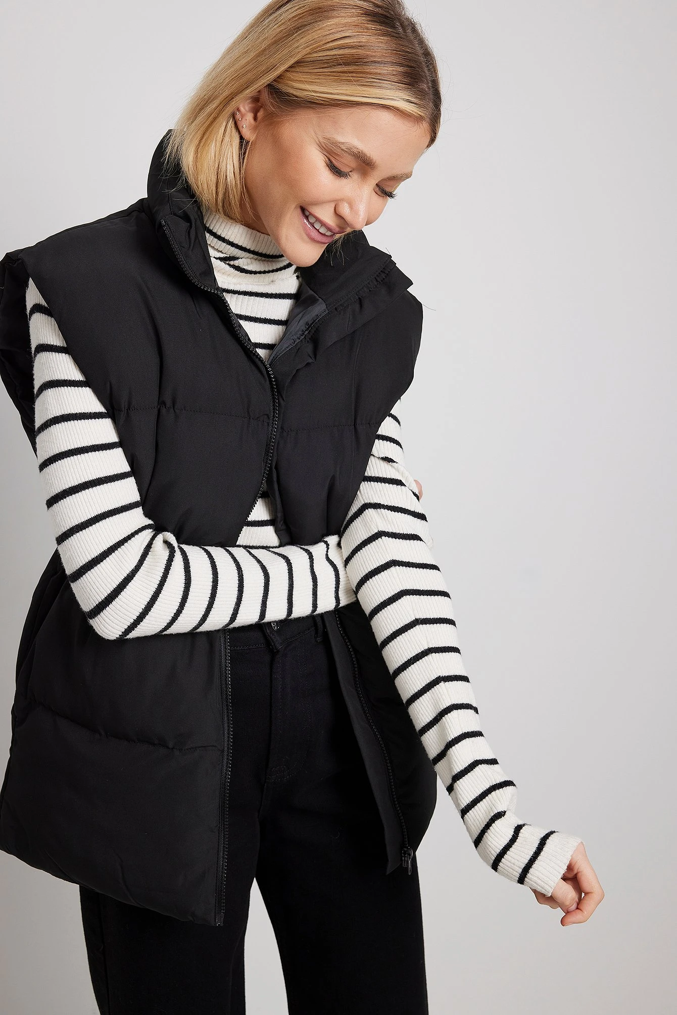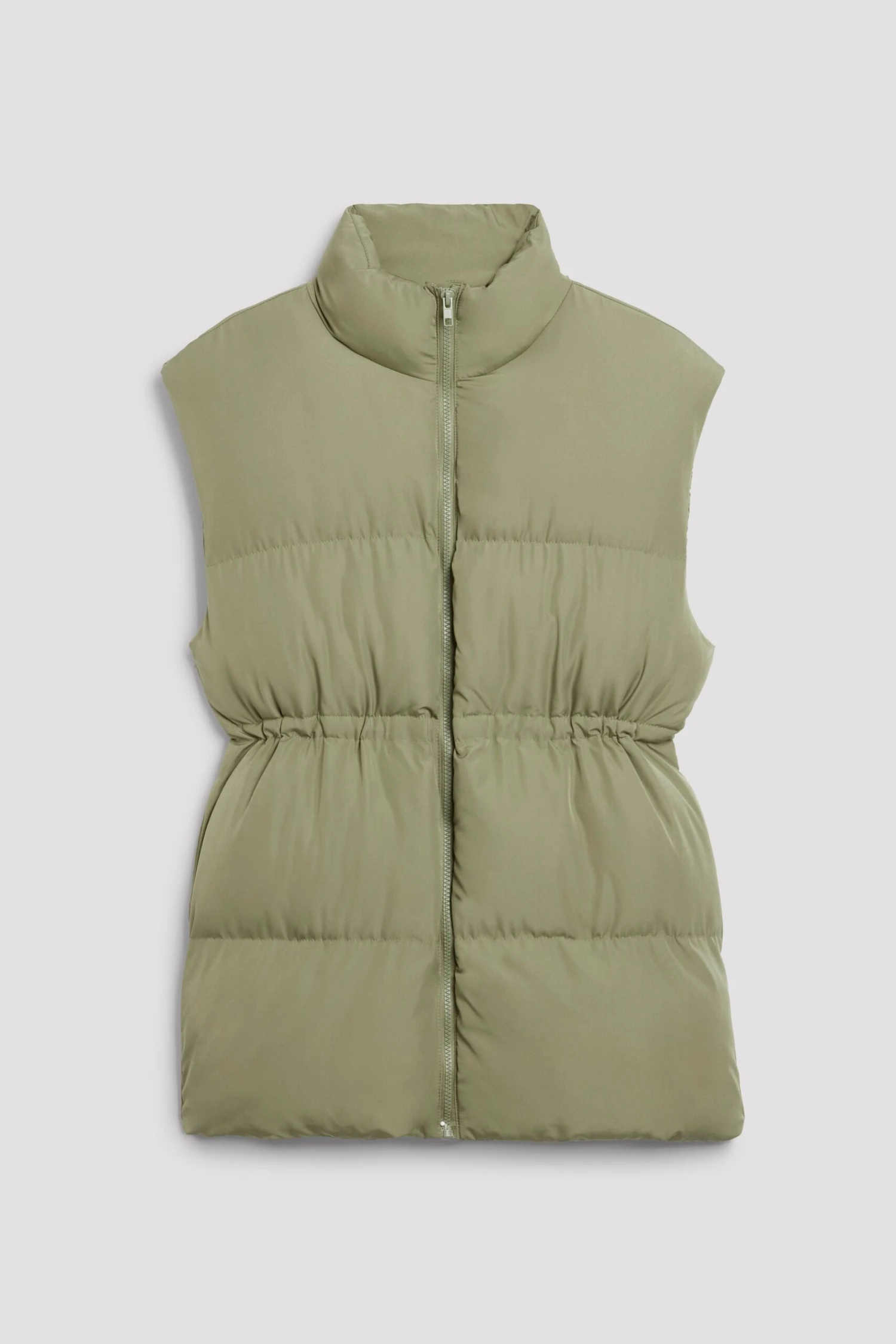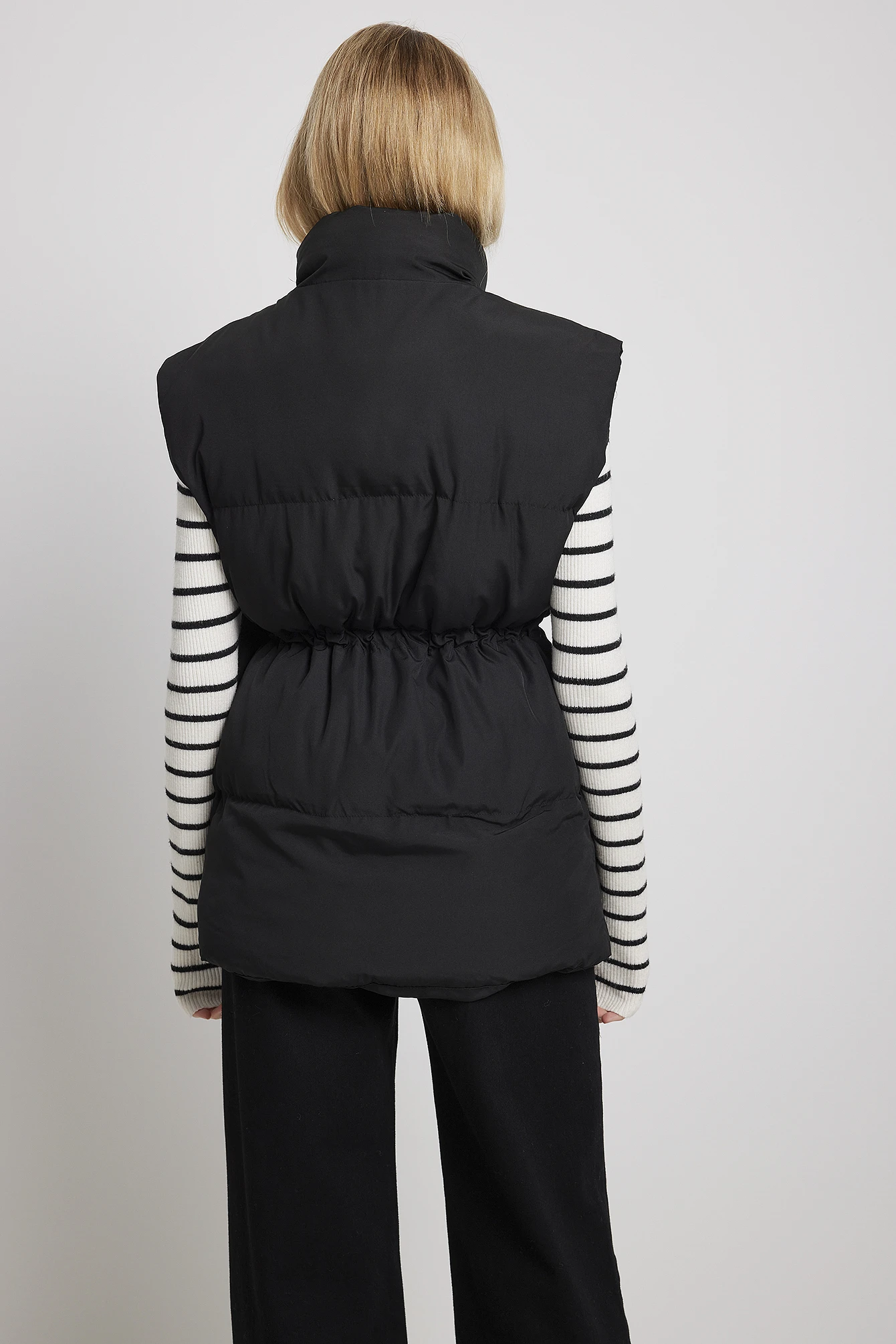 This vest features a padded high neckline, a zip closure, hidden side pockets, an adjustable drawstring waist and an oversized fit.