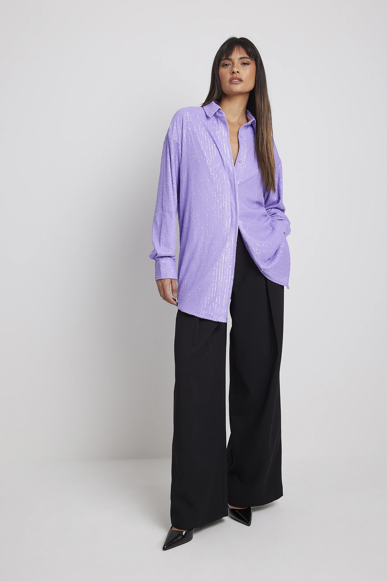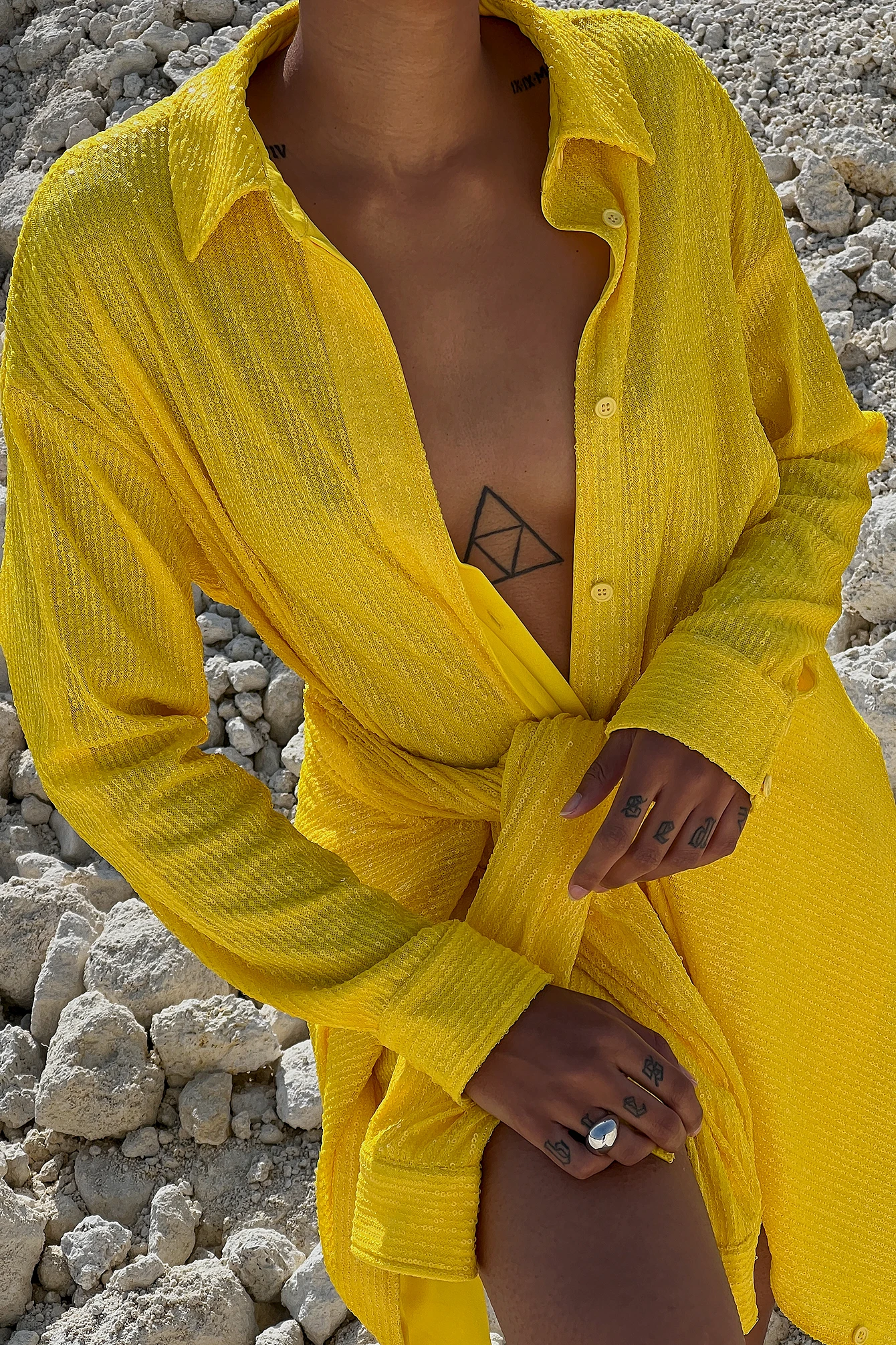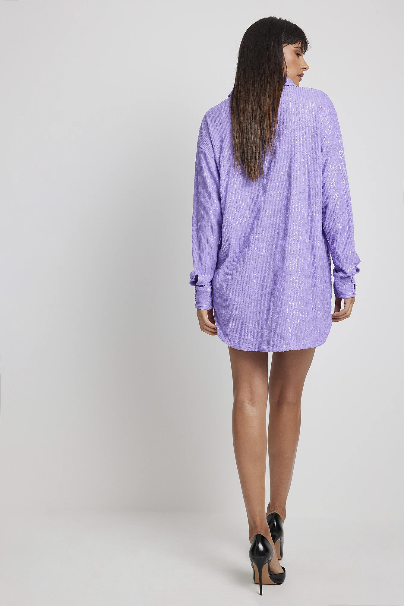 This shirt dress is made of sequin and features a collar, covered buttons and long sleeves.