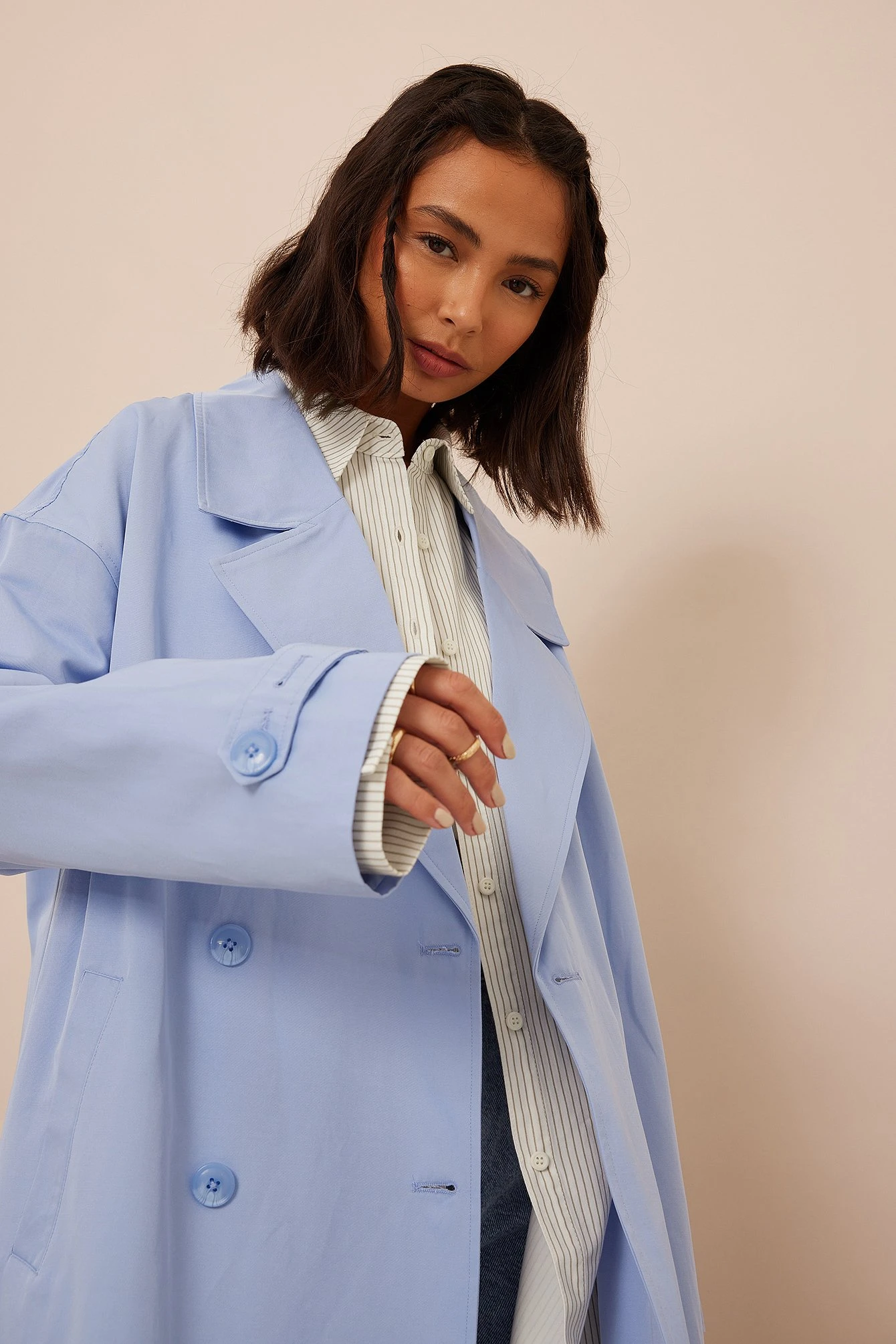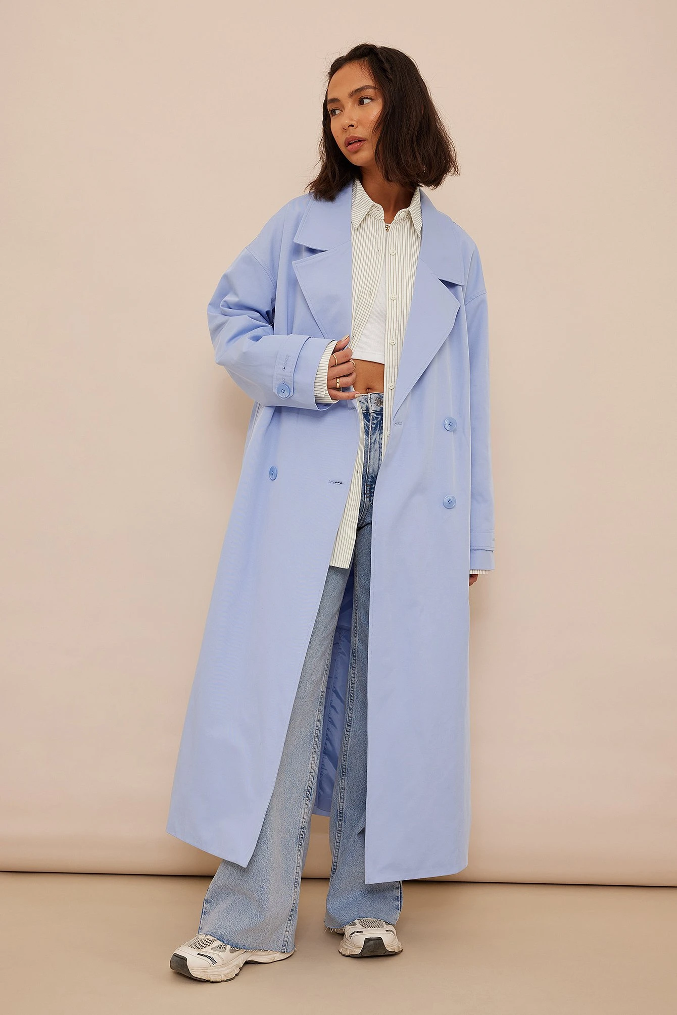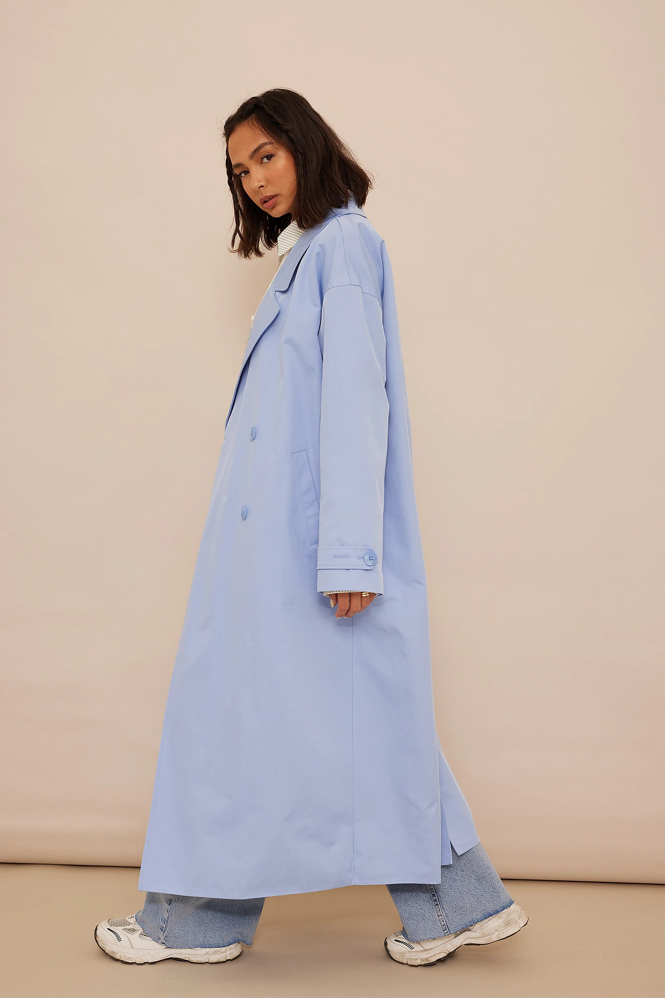 This trenchcoat is oversized and features a lapel neckline, a double-breasted button closure, long sleeves with a button detail on the cuffs, side slanting pockets and a back slit detail.