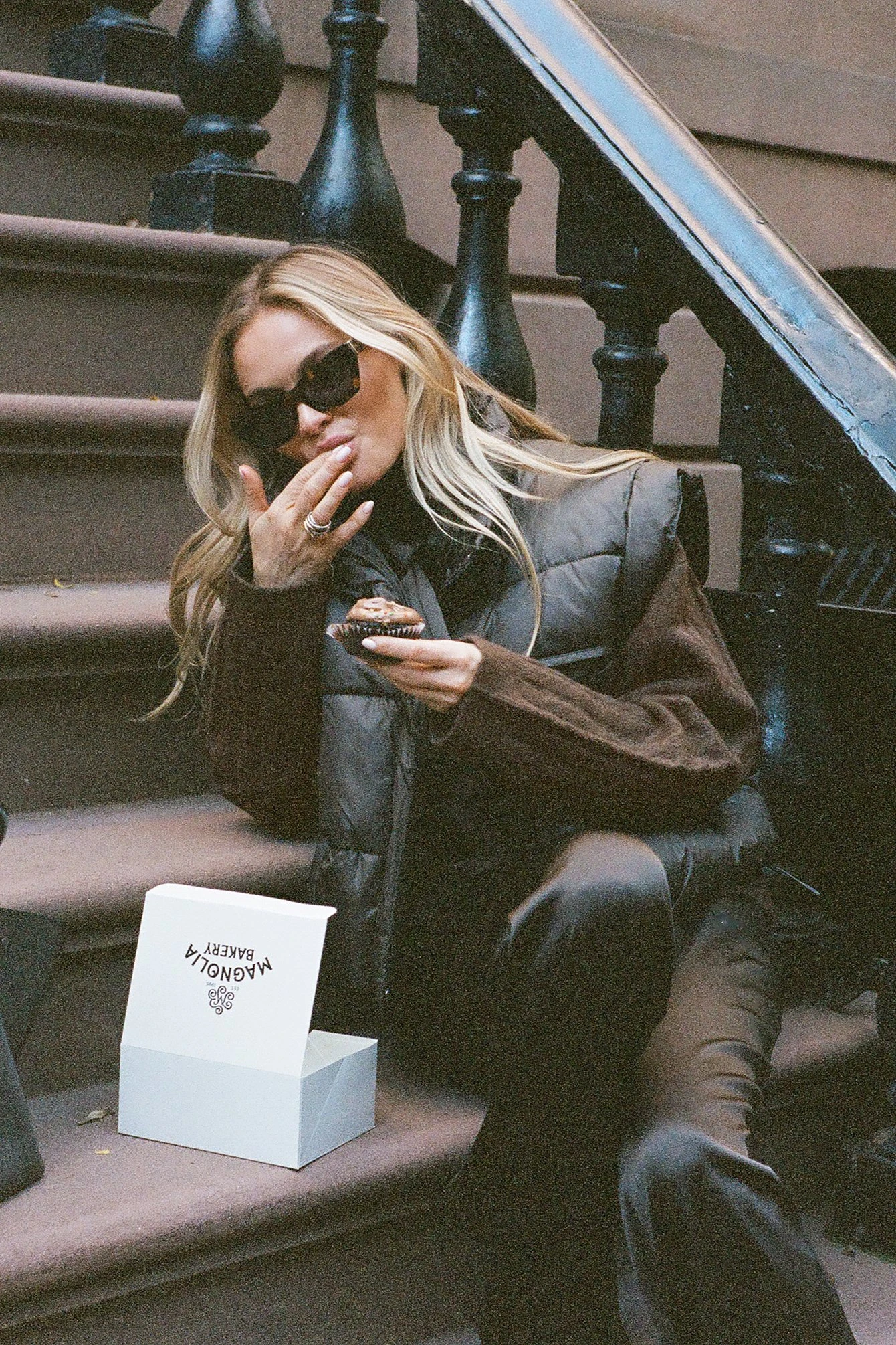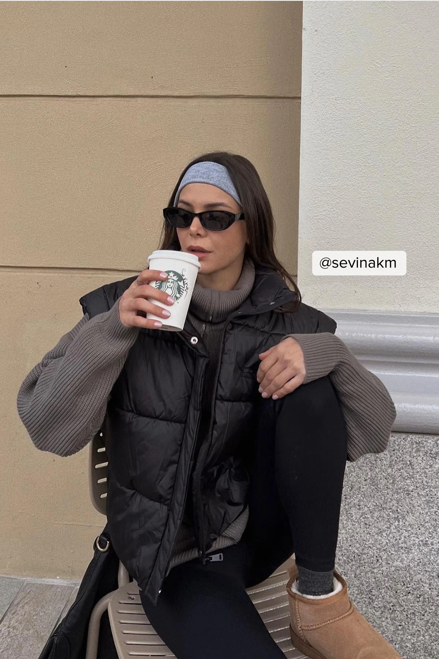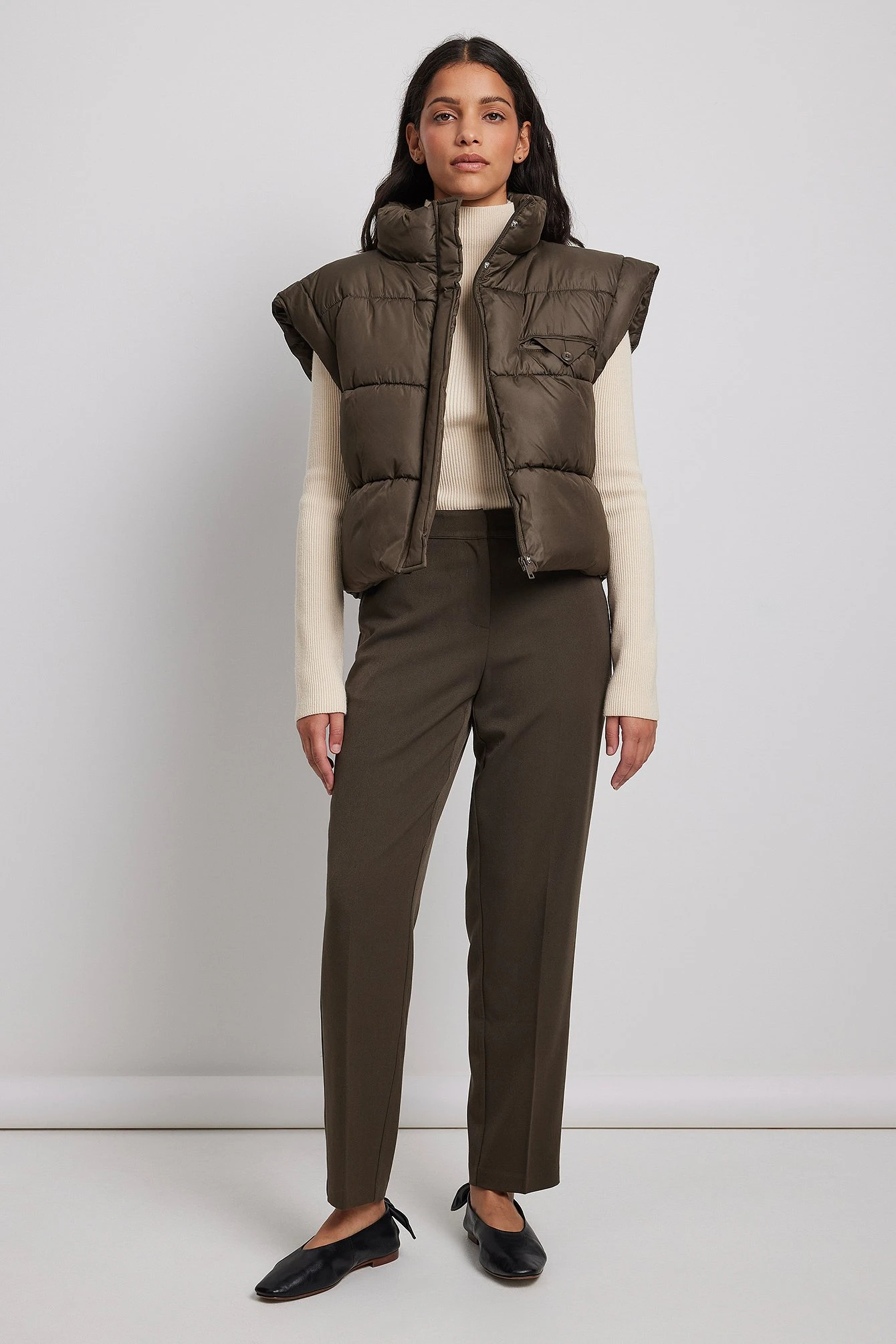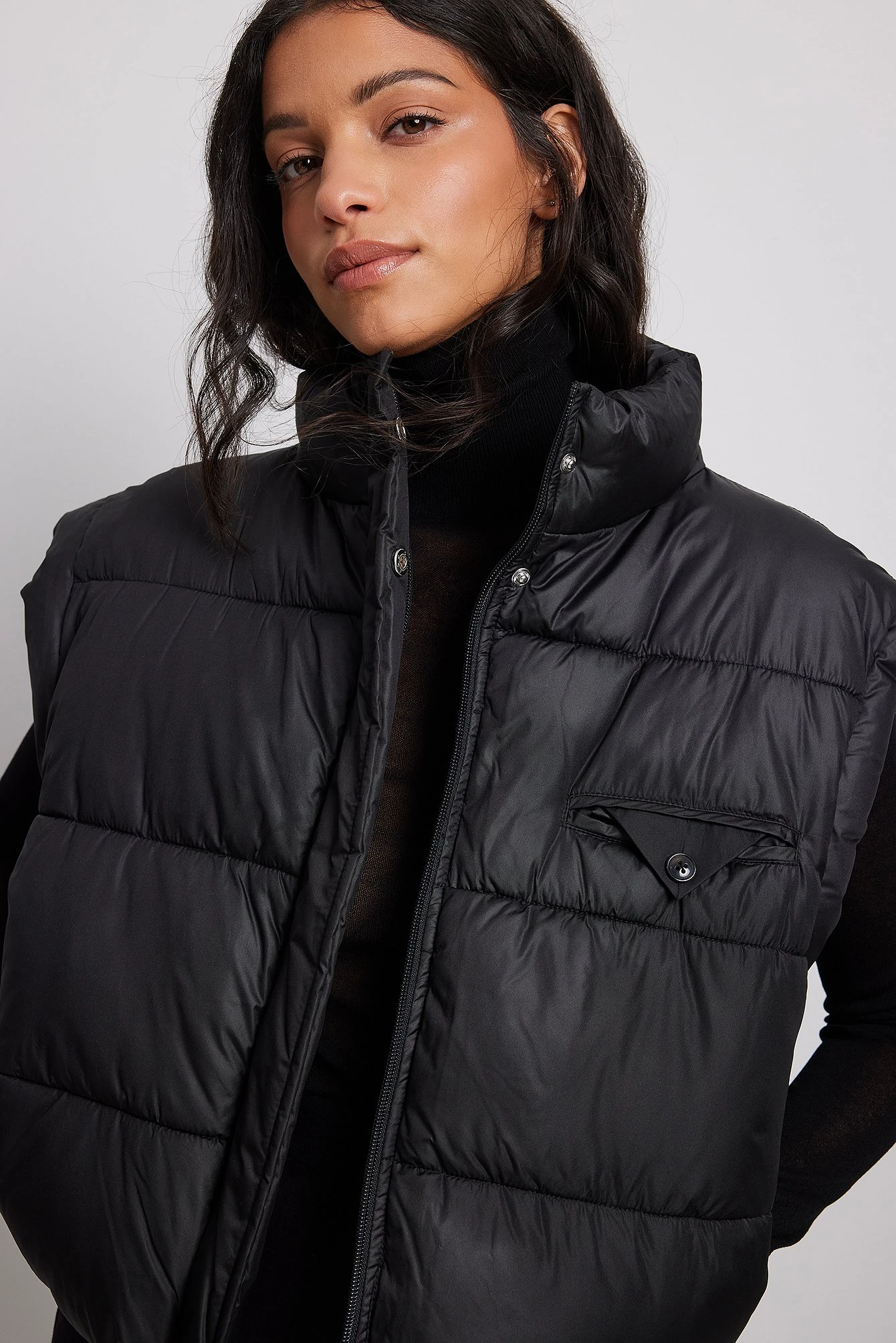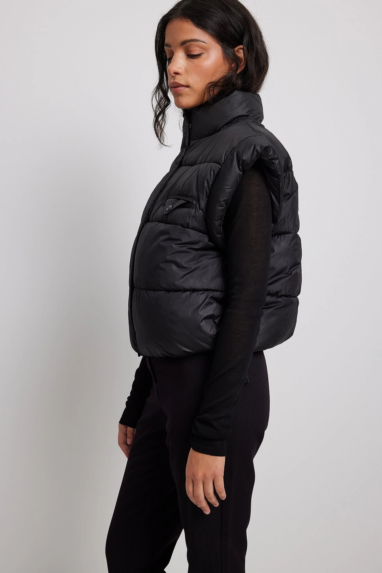 This puffer vest is cropped and features a high neck, a hidden zipper closure down the front, a chest pocket with a button closure and thick padding.