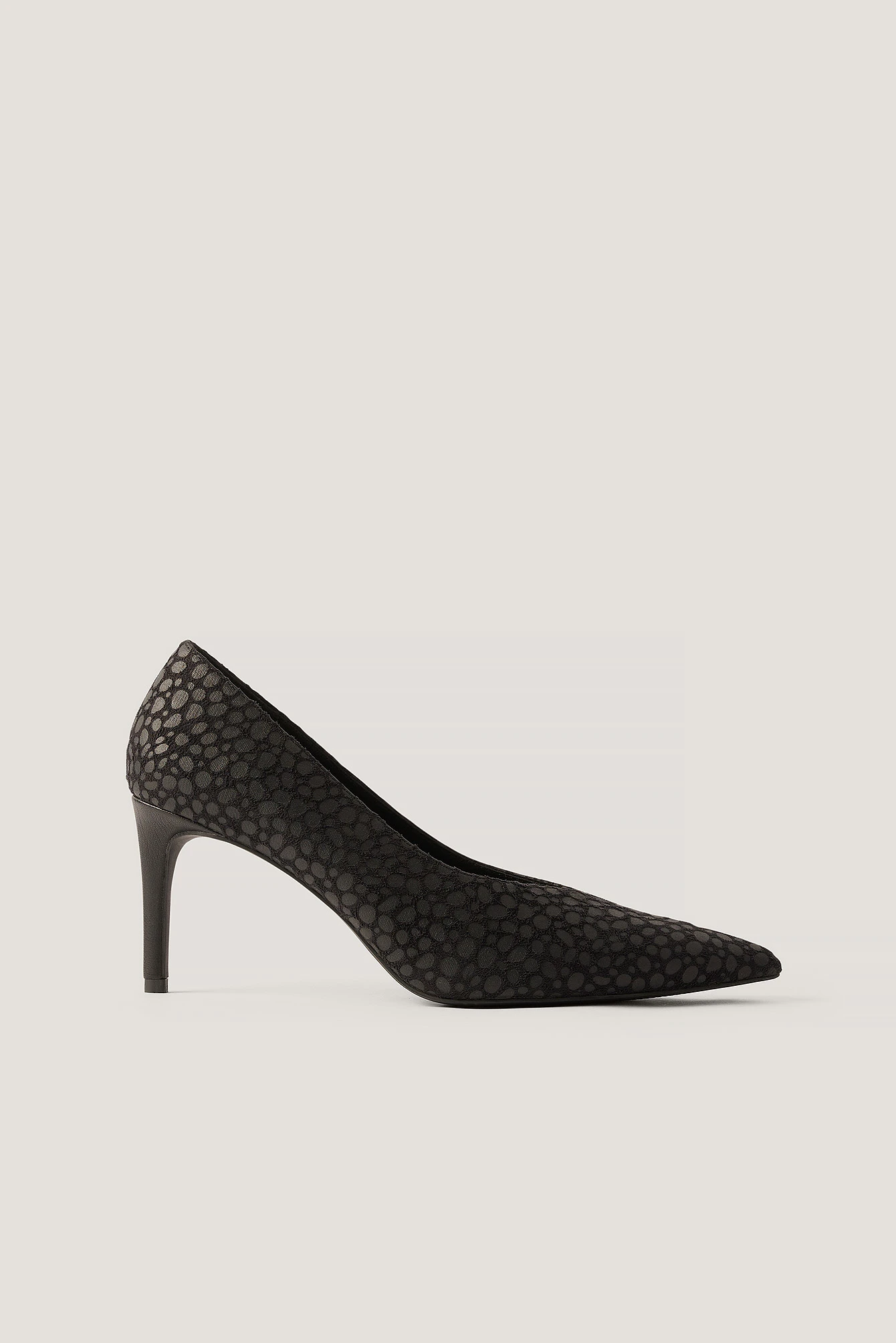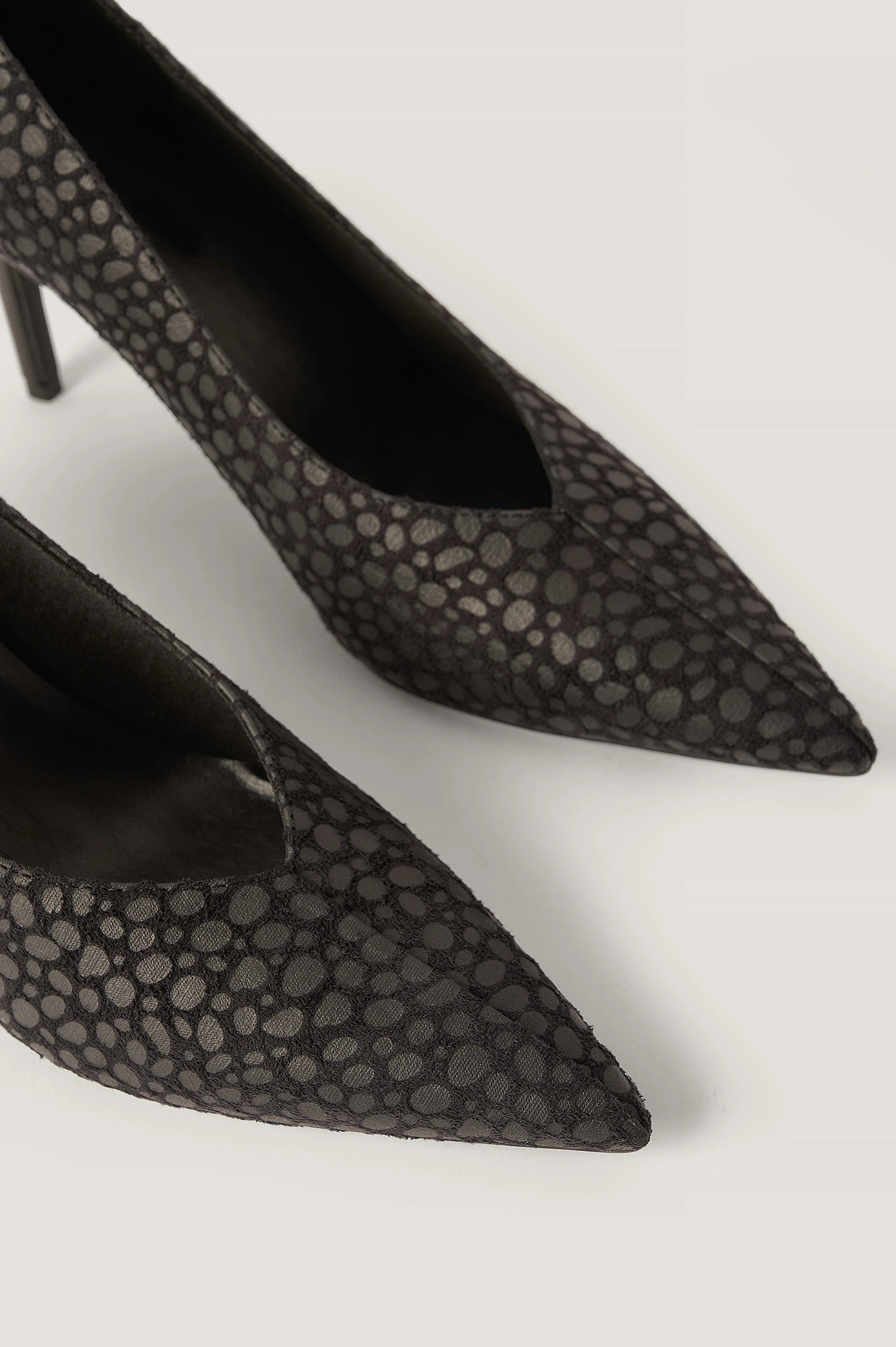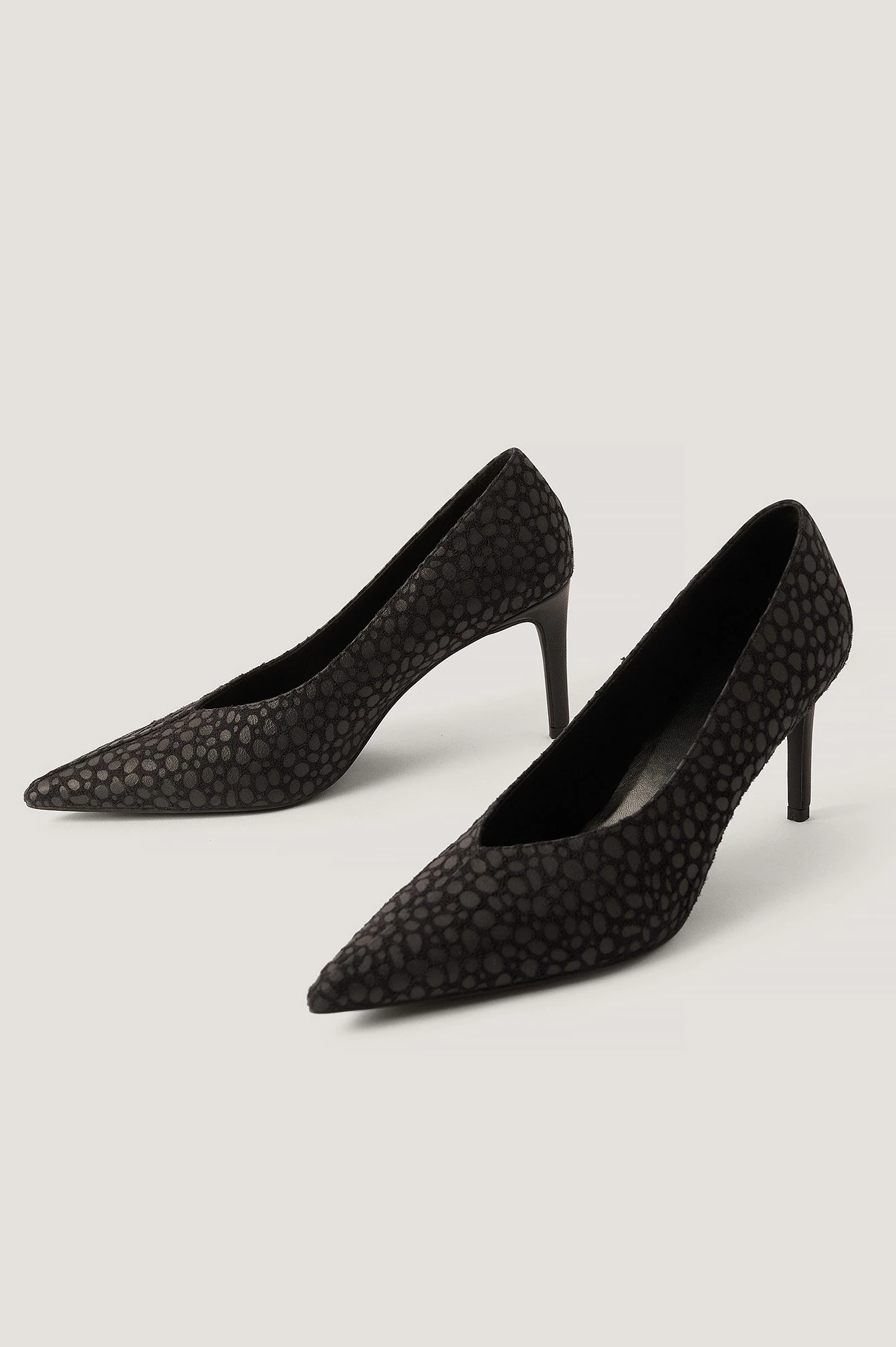 These pumps feature a dotted pattern, a v cut, a pointed toe and thin stiletto heels. Heel Height: 8,3 cm / 3.3 in.