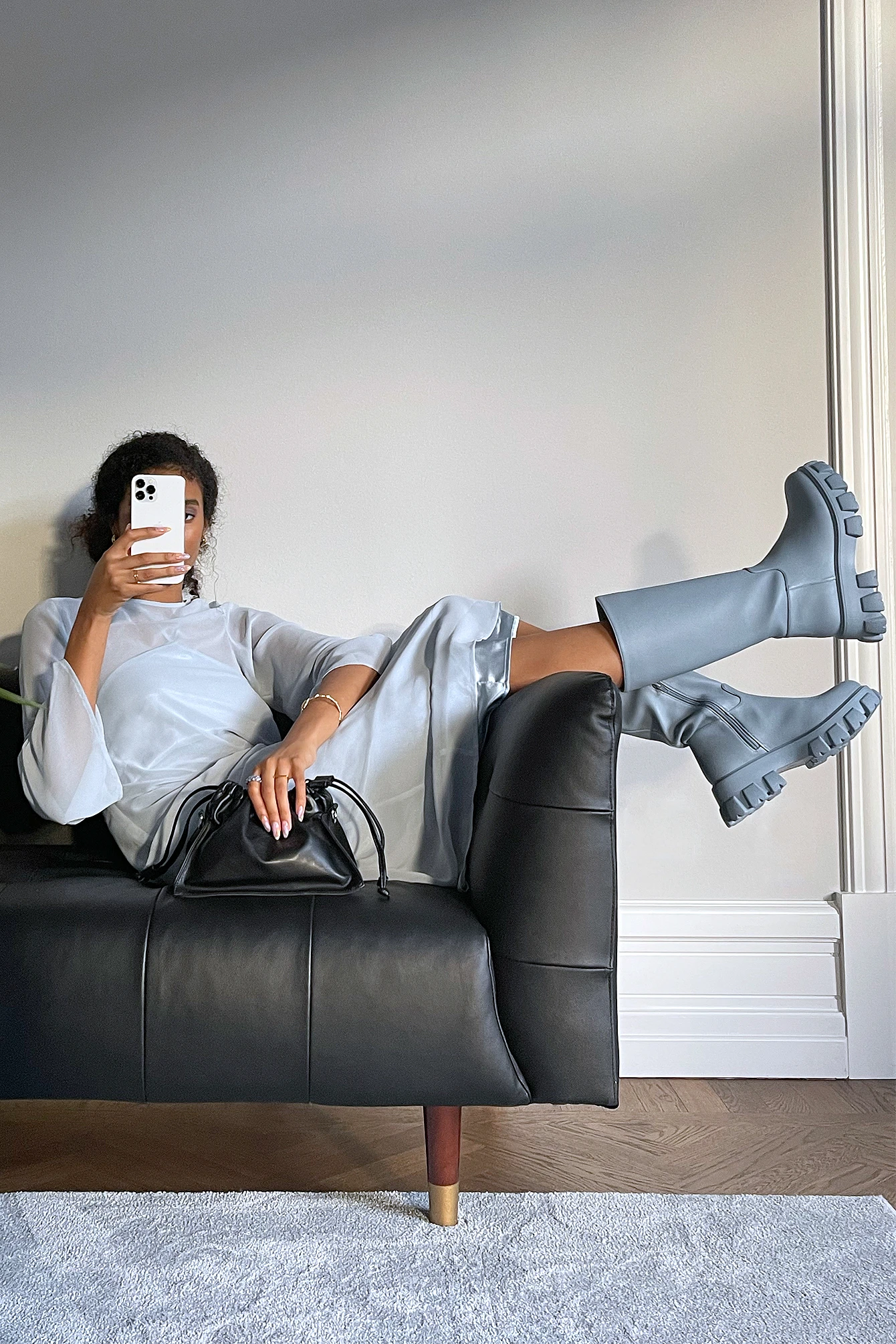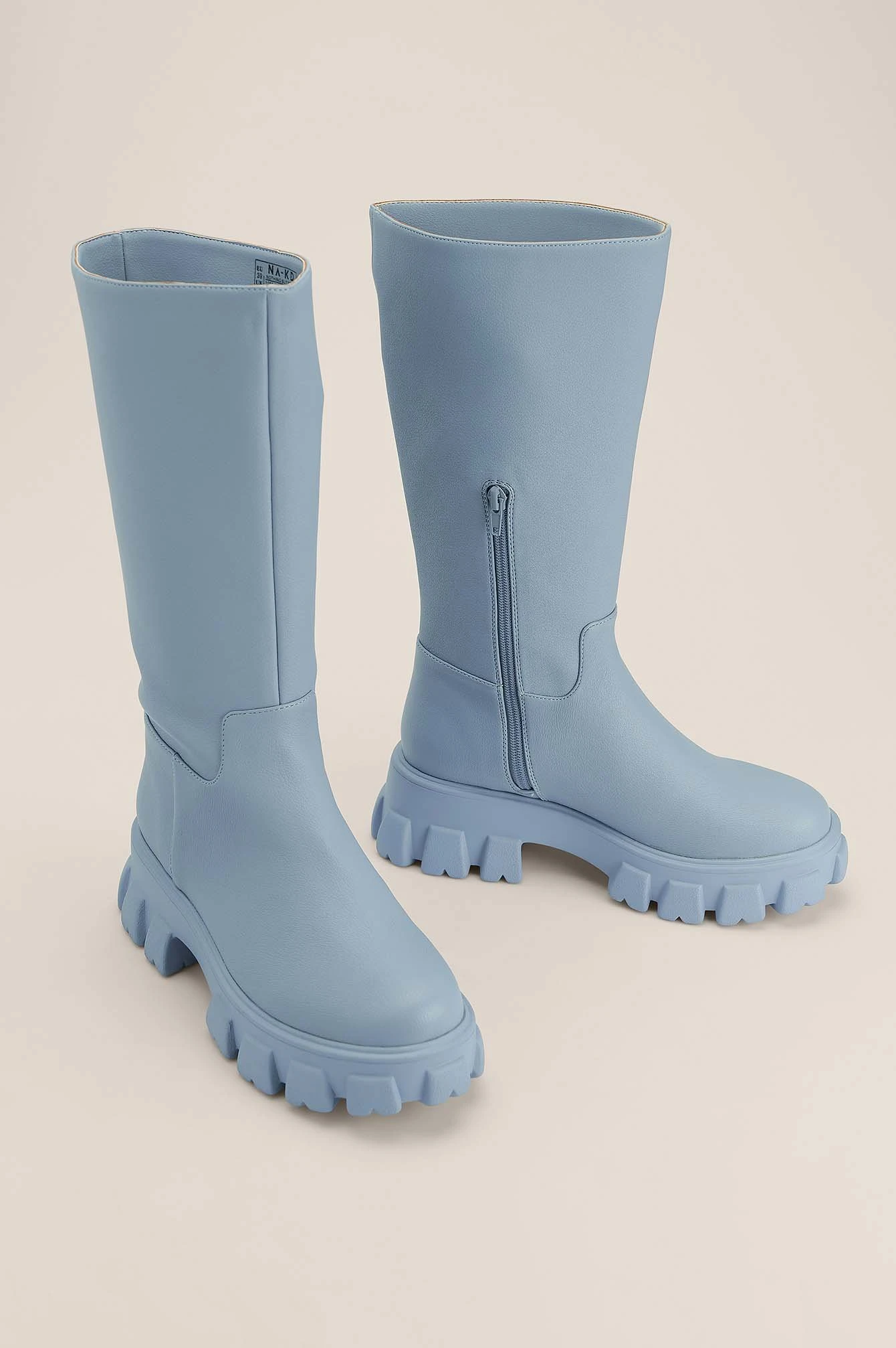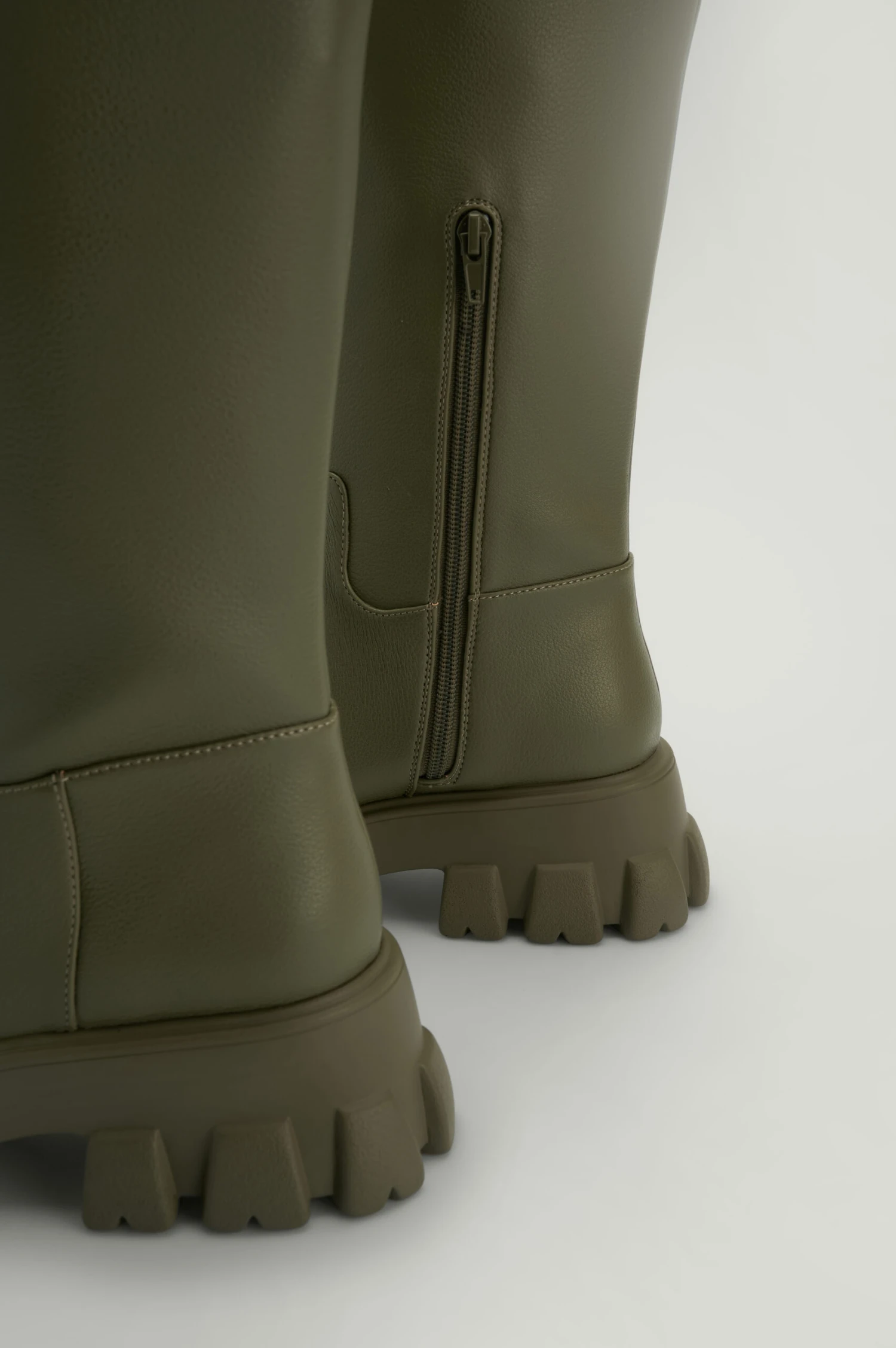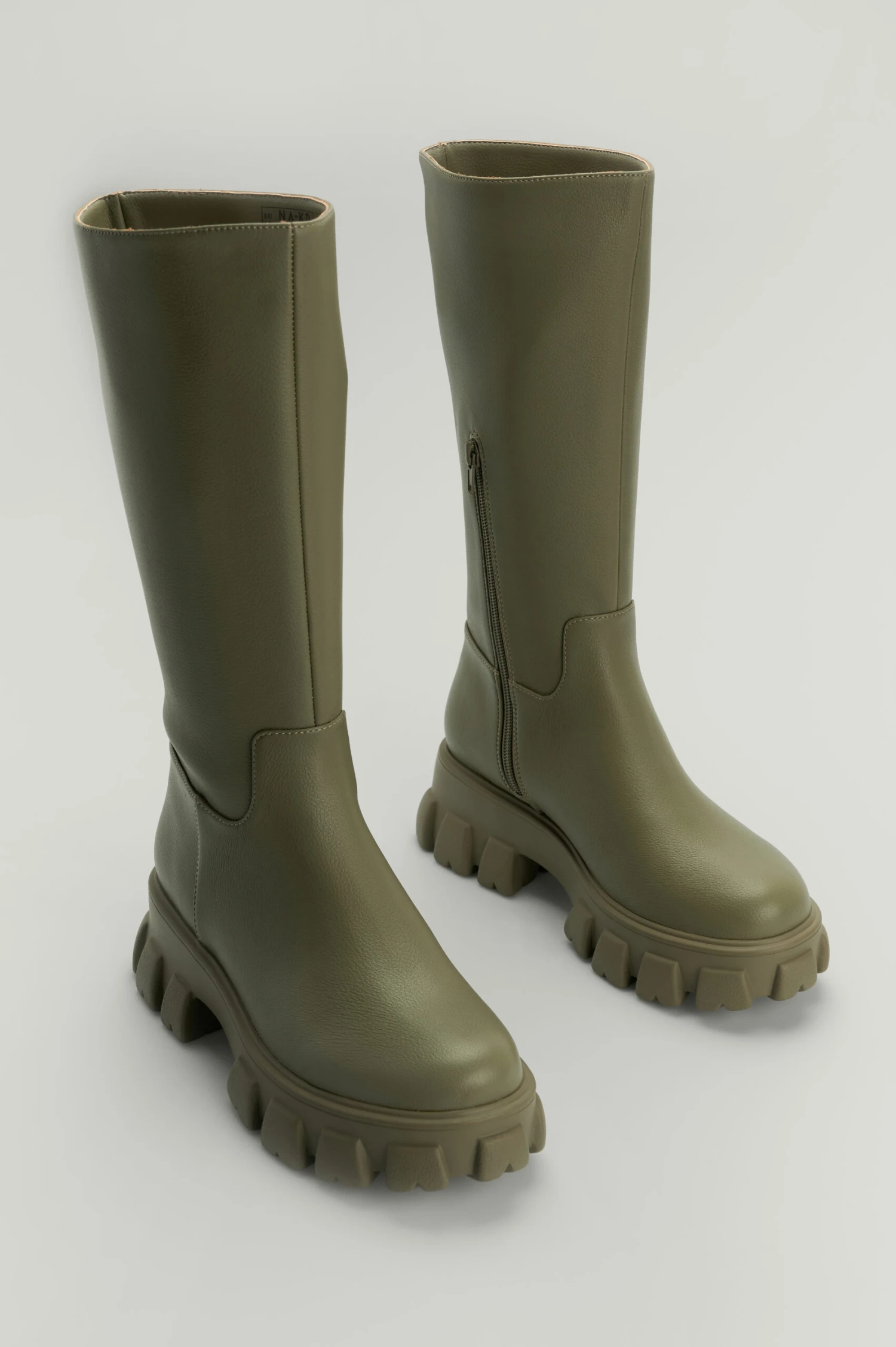 These boots are knee high and feature a rounded toe, a chunky sole and a side zipper. Measurements in size 39: Sole height: 4,2 cm / 1.10 in. Heel height: 6,1 cm / 2.6 in. Shaft height: 33 cm / 12.13 in. Shaft circumference around the calf: 34 cm / 13.8 in.