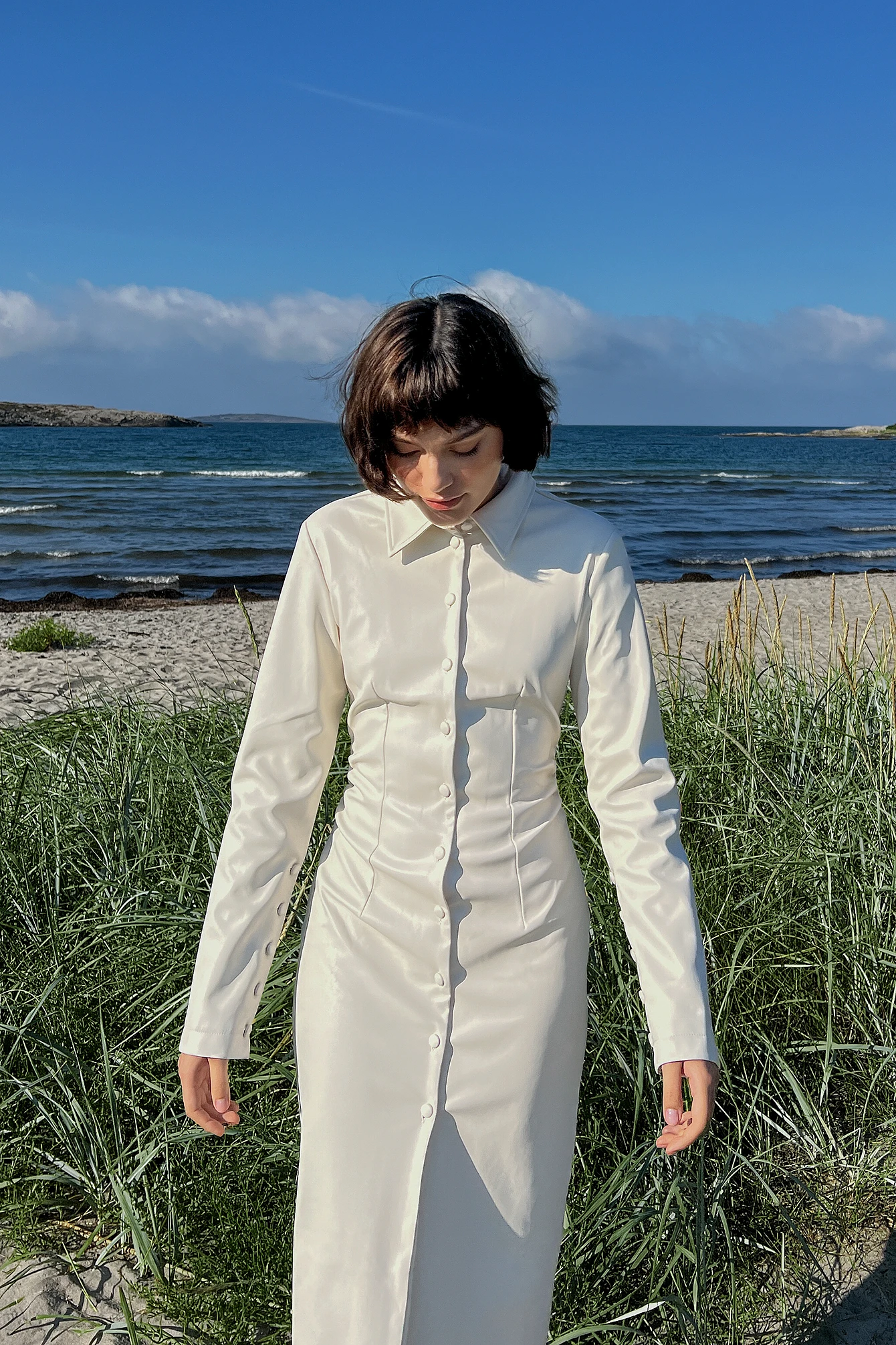 This midi dress is draped and features long sleeves with button cuffs, a shirt collar and a button closure.