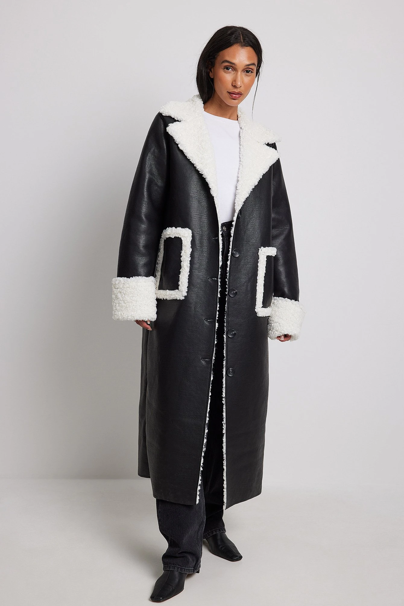 This coat is made of PU and features a lapel neckline, long sleeves, front pockets, a button closure, teddy details and a teddy lining.