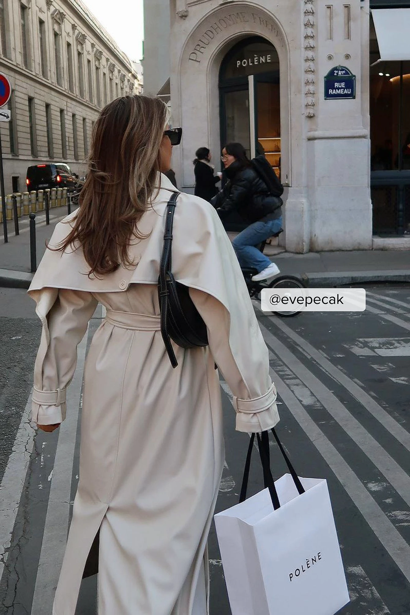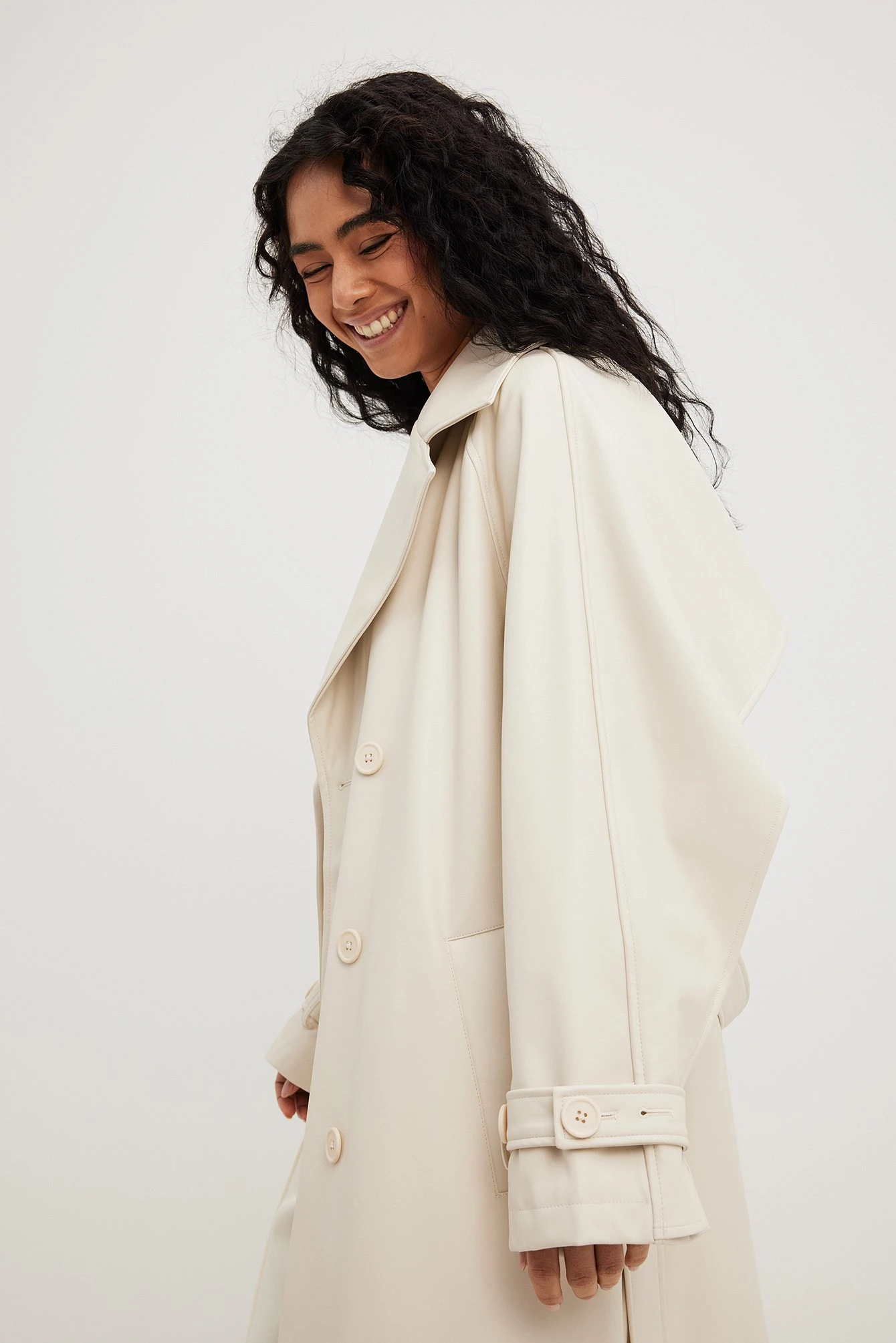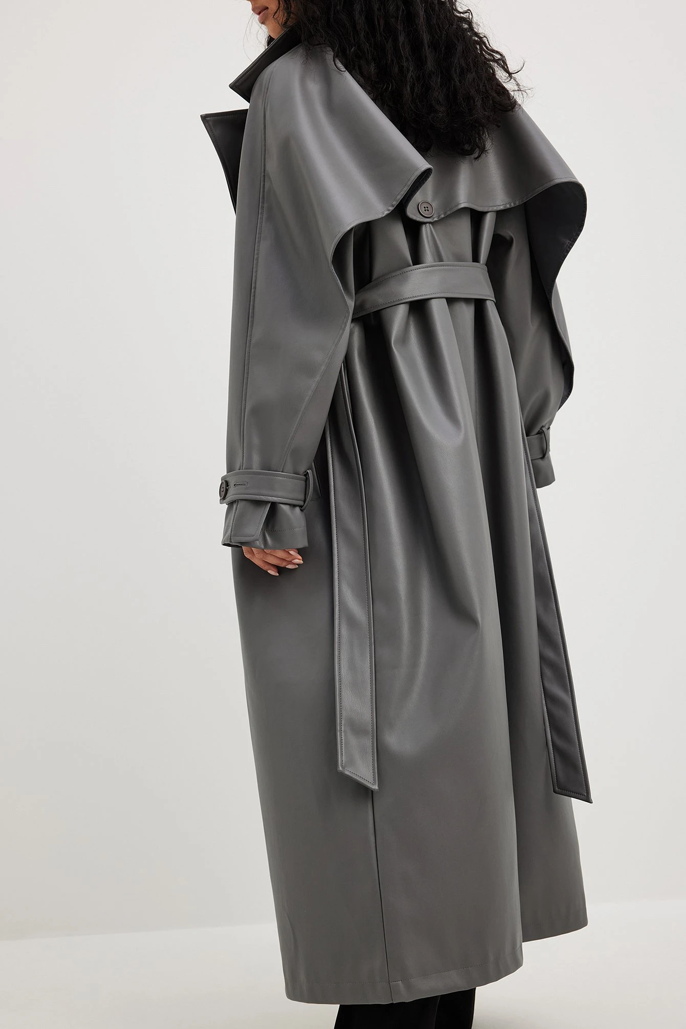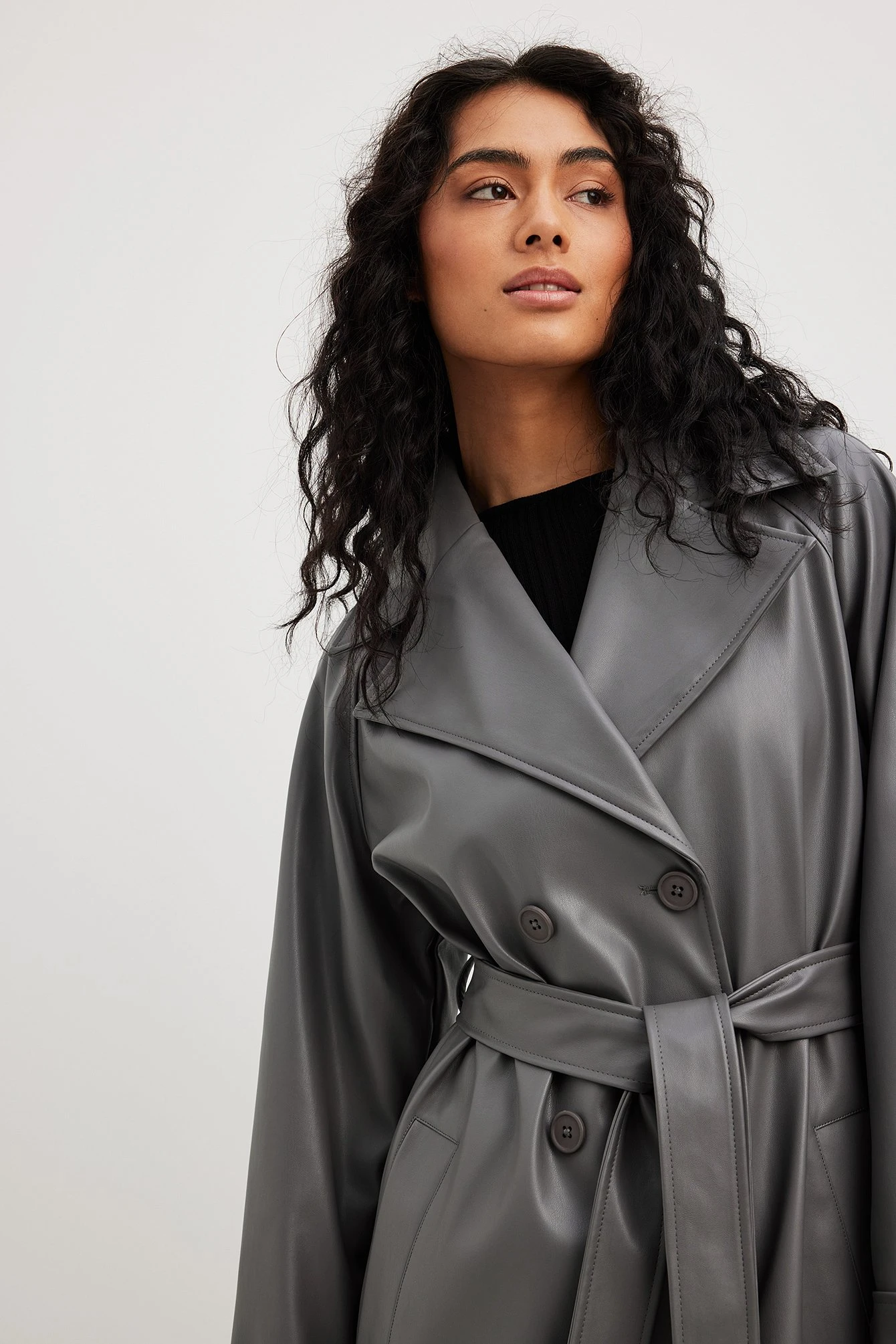 This trenchcoat features an oversized fit. It has a faux leather material and a thin fabric lining. This trenchcoat features a double-breasted button design, cuffs with an adjustable button detail, two side slanting pockets at the front, a self-tie belt at the waist, a button detail at the back and a back slit detail.