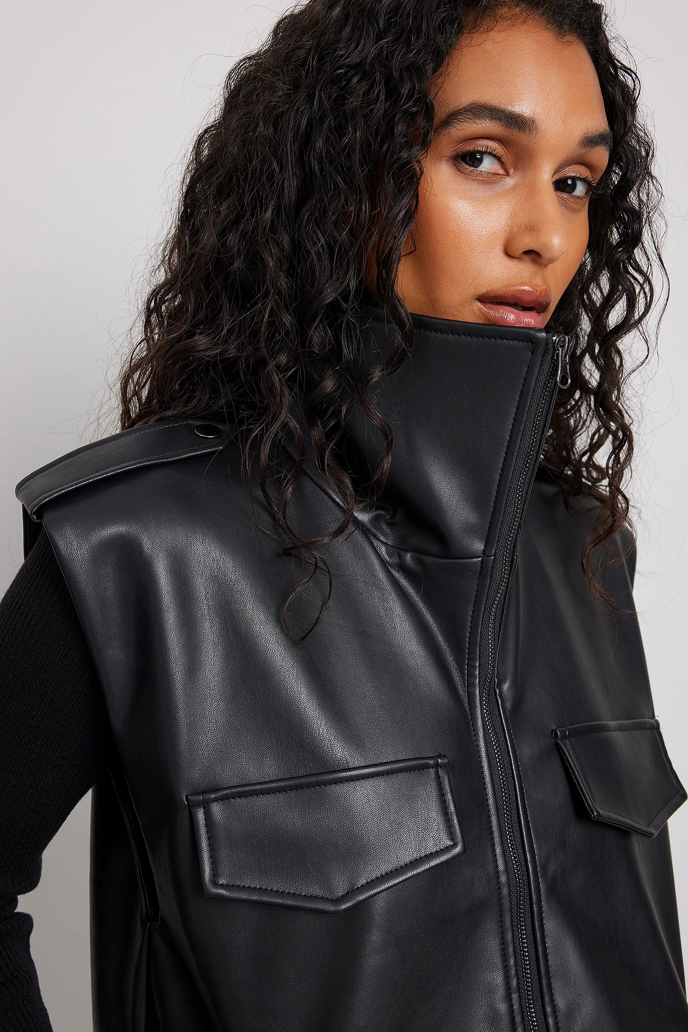 This vest is made of PU and features a high collar with a zipper along the front, a snap button on the bottom, an embellishment at the shoulders, two flap pockets on the chest and open side pockets.