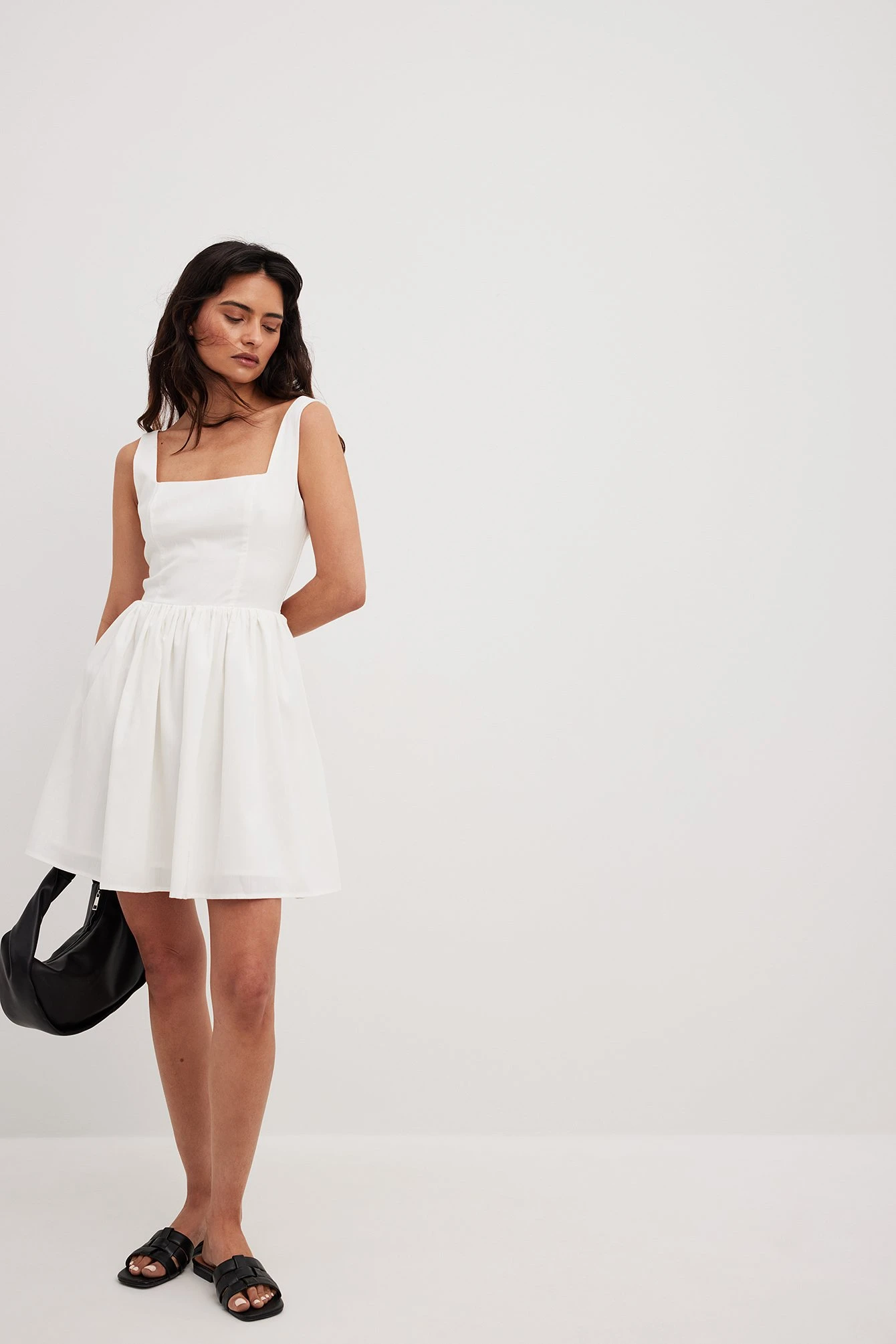 This mini dress features a flowy fit. It has a square neckline and a non adjustable shoulder strap. This mini dress features a deep back, a hidden zipper closure on the back and a lining.