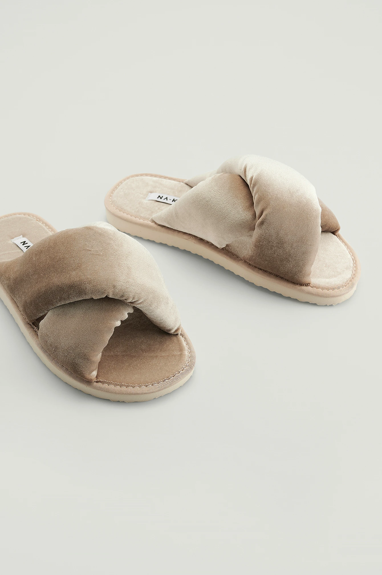 These slippers are puffy and made of velvet. Measurements in size 39: Sole height: 2 cm / 0.8 in. Insole length: 27 cm / 10.5 in.
