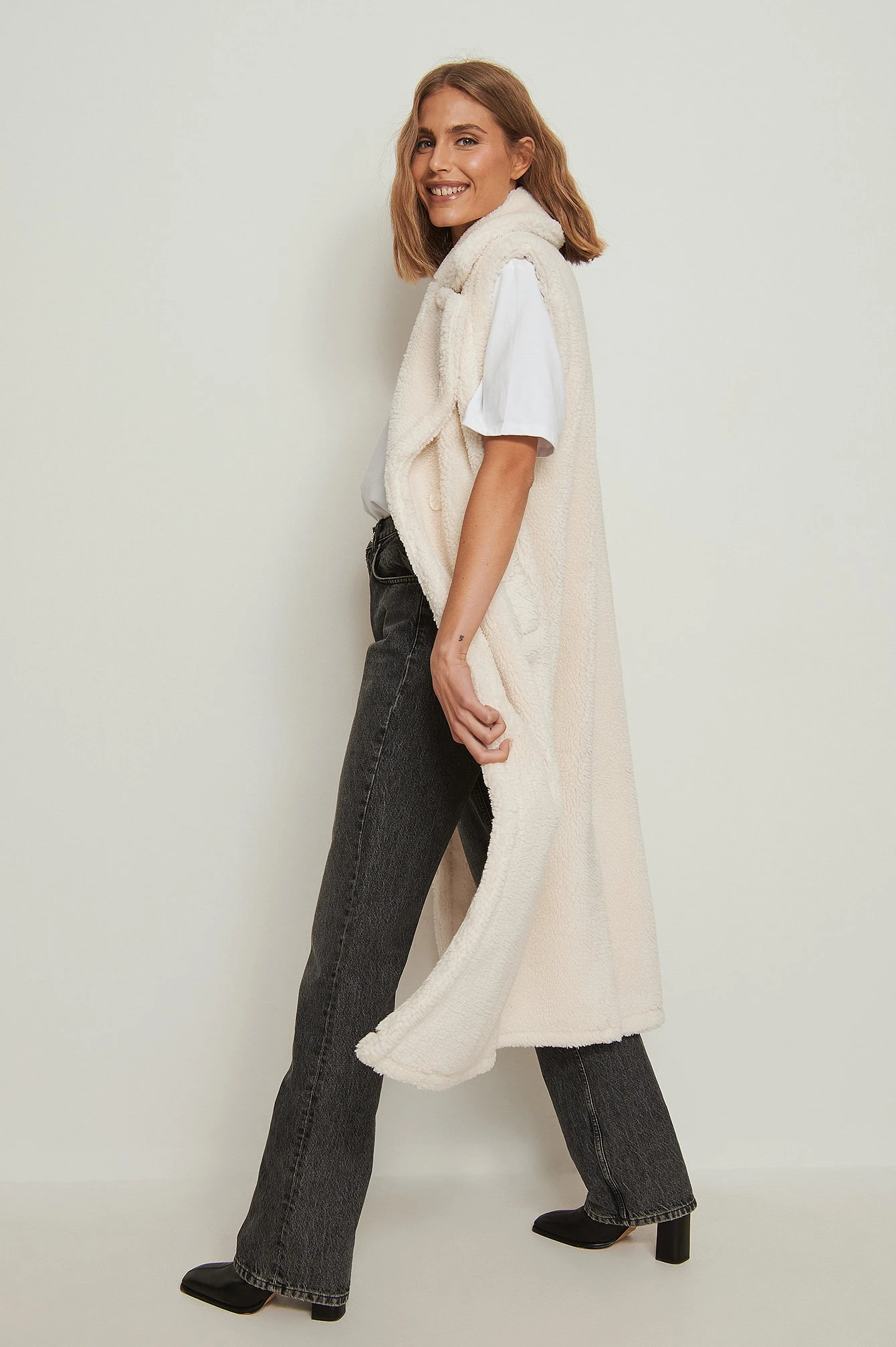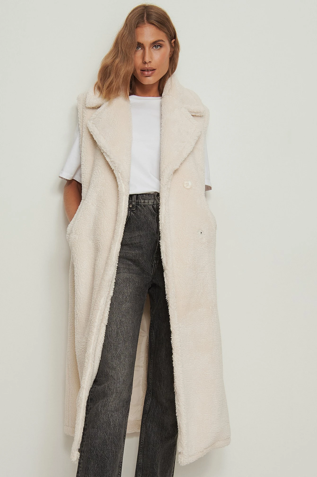 This vest is sleeveless and features a lapel design, a button closure, a teddy material and a long fit.