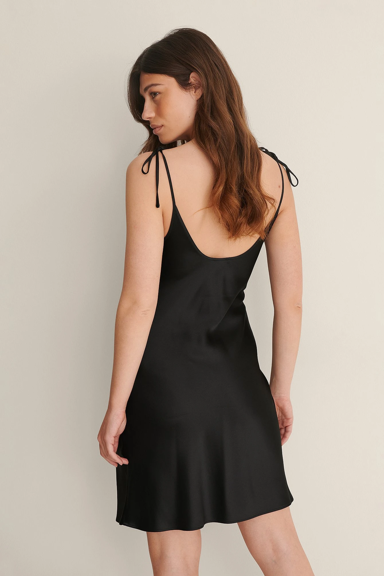 This dress features spaghetti straps with a self-tie, a round neck, a seam detail at the front, a side zipper closure and a satin touch.
