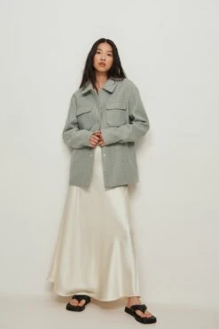 This overshirt features a classic collar, a button placket with a push button, two chest pockets, a wide sleeve with a button closure at the end, an oversized fit and a lining.