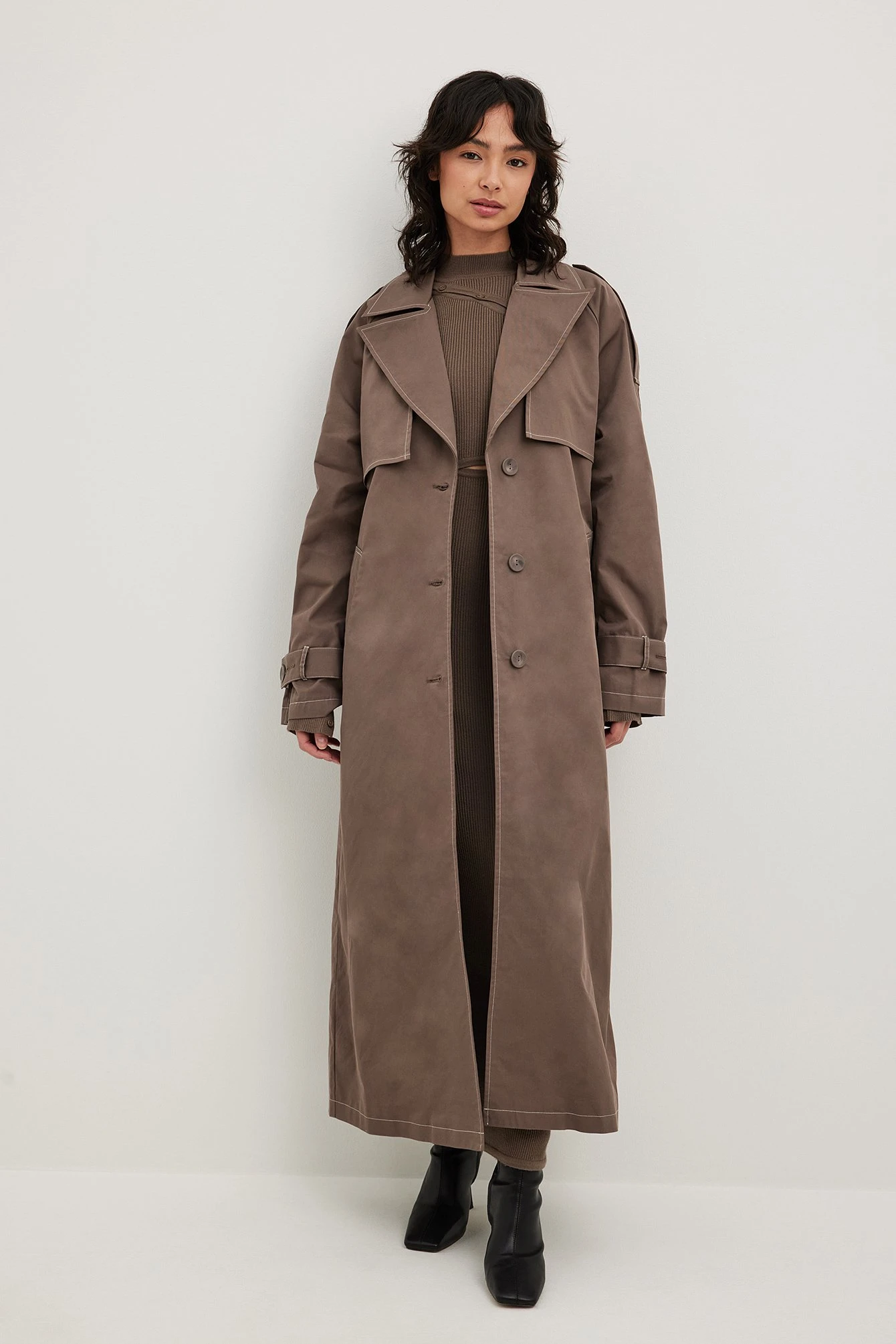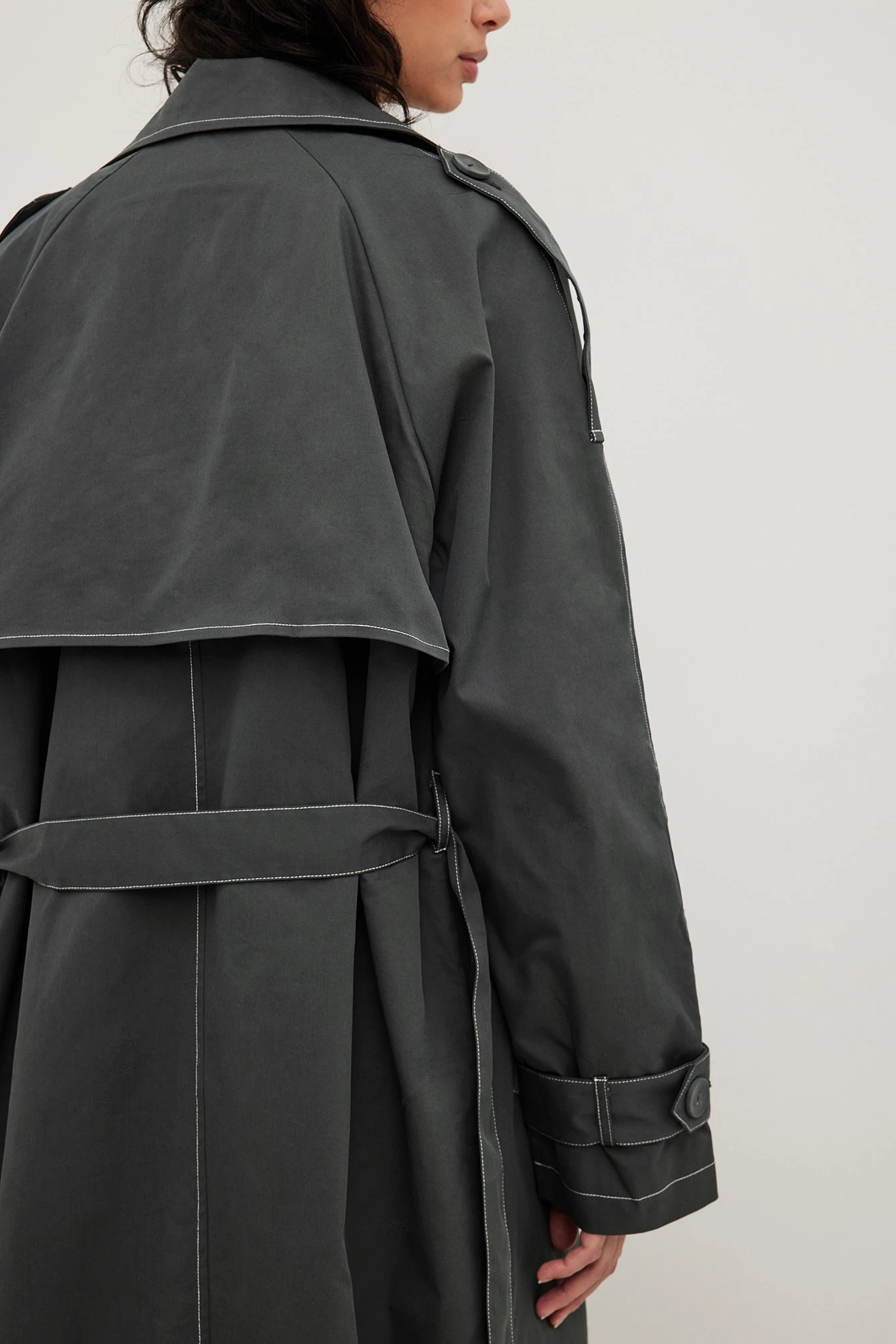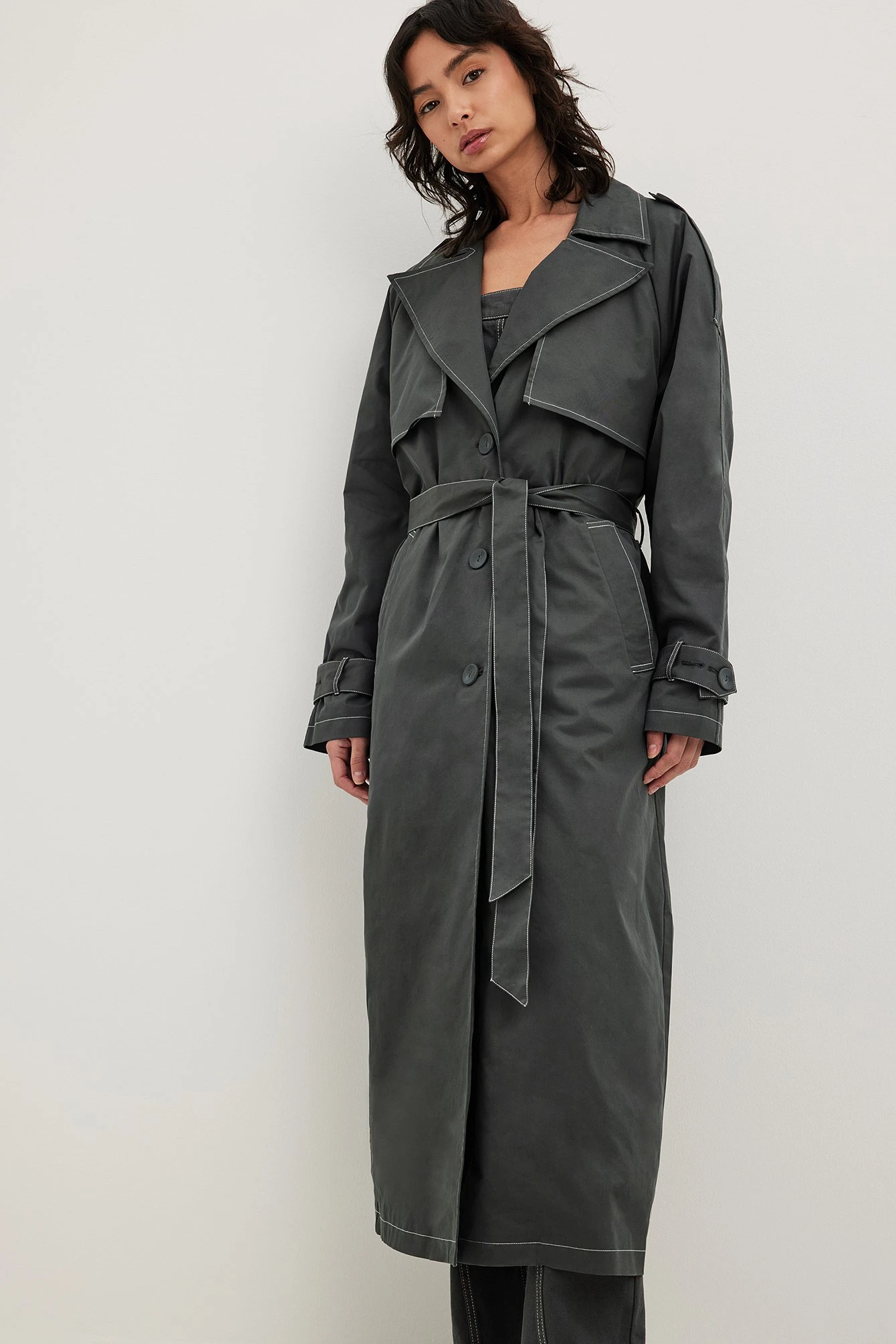 This trenchcoat is long and features an oversized fit. It has contrast color seams and a removable lining. This trenchcoat features button closure, a self tie waist belt, side pockets and a slit detail on the back.